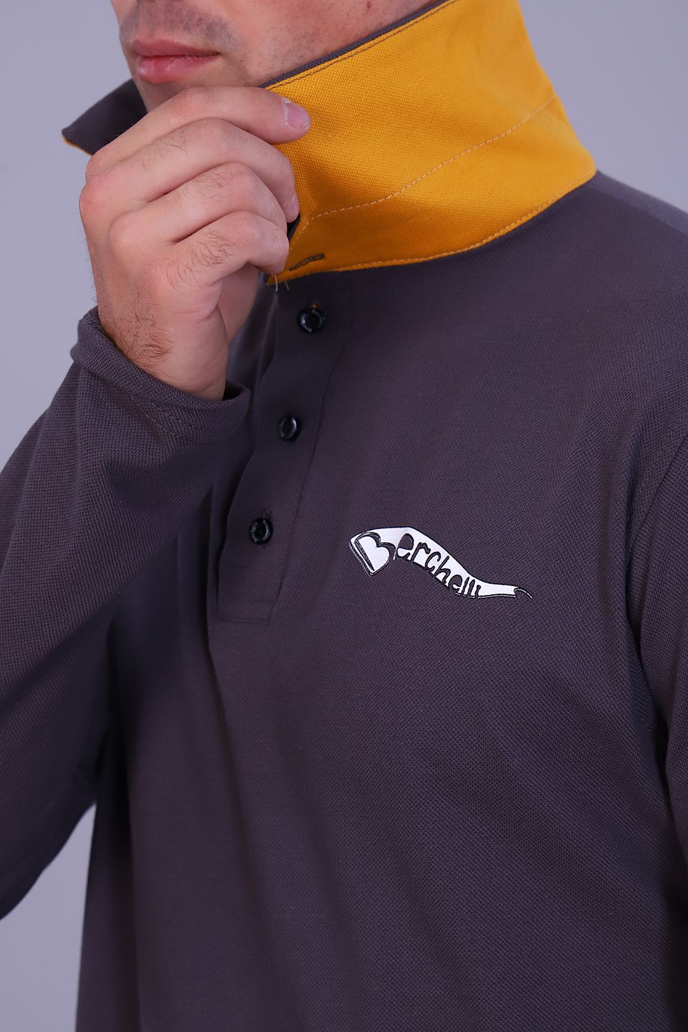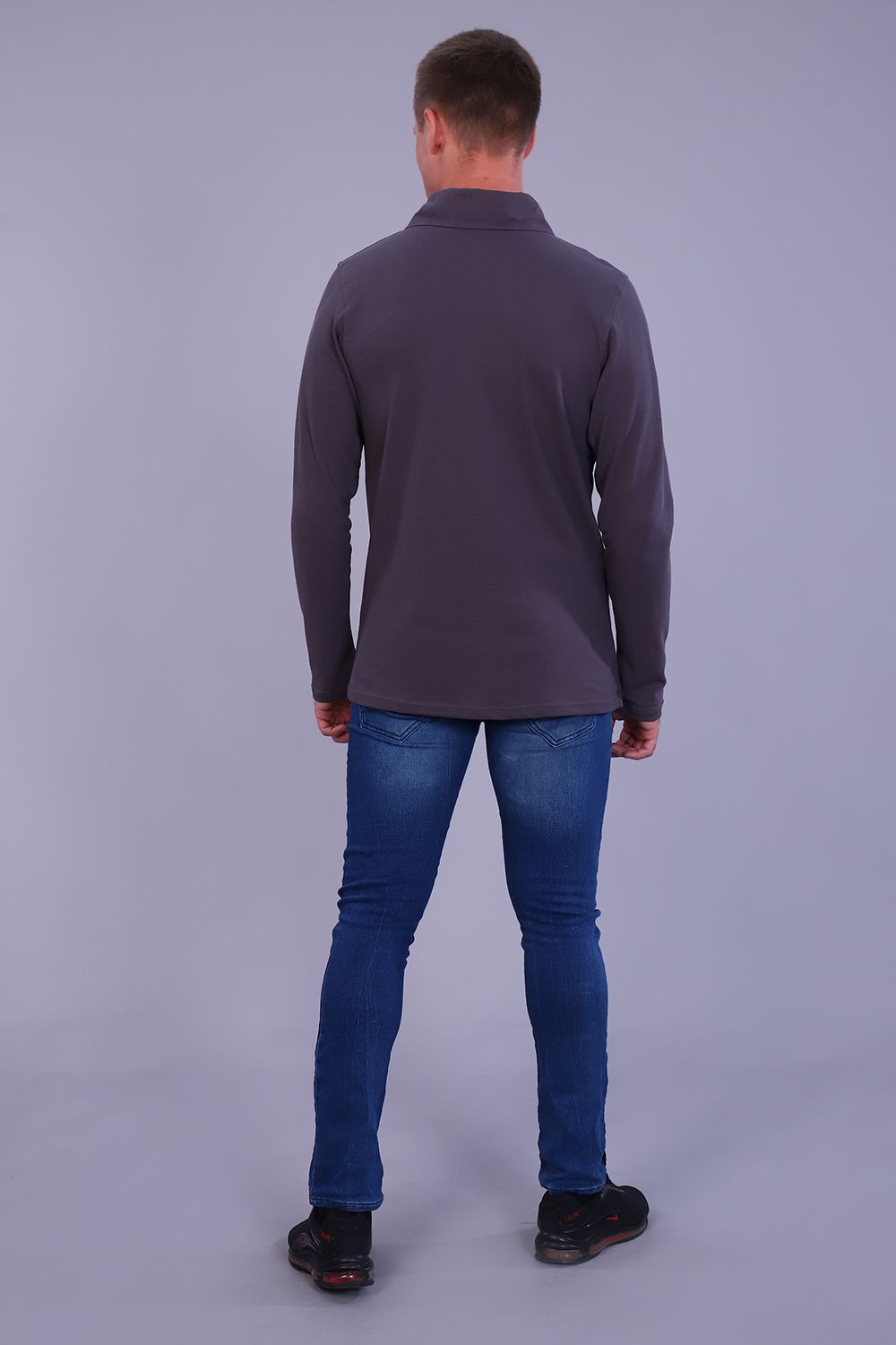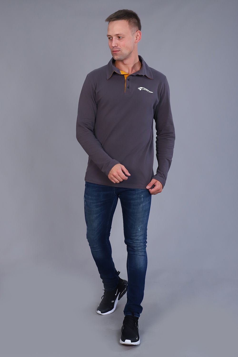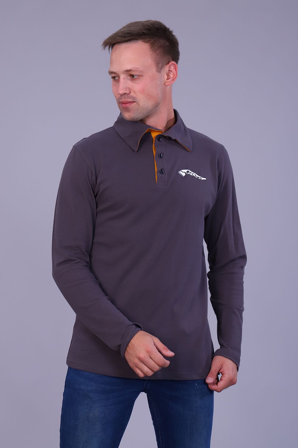 Футболка поло мужская с длинным рукавом из ткани лакост пике насыщенного серого цвета. На полочке планка с тремя пуговицами. Внутренняя планка и оборотная сторона воротника выполнены из ткани контрастного цвета. На полочке так же имеется печать. Футболка поло идеально подойдет для повседневной носки, отдыха, спорта и дома.