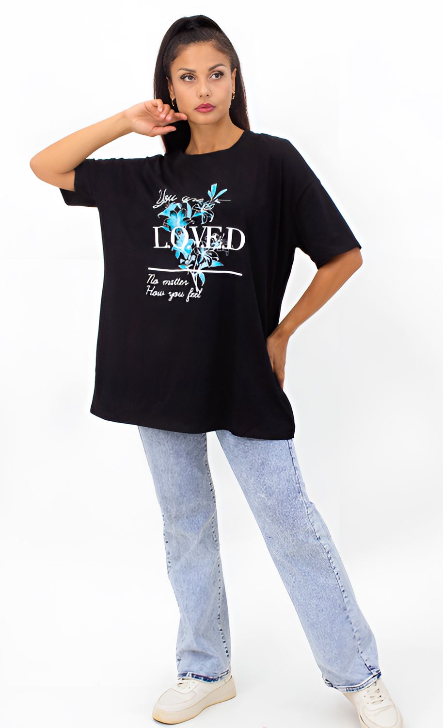 Модная футболка с цветами оверсайз, арт.2803 - черный