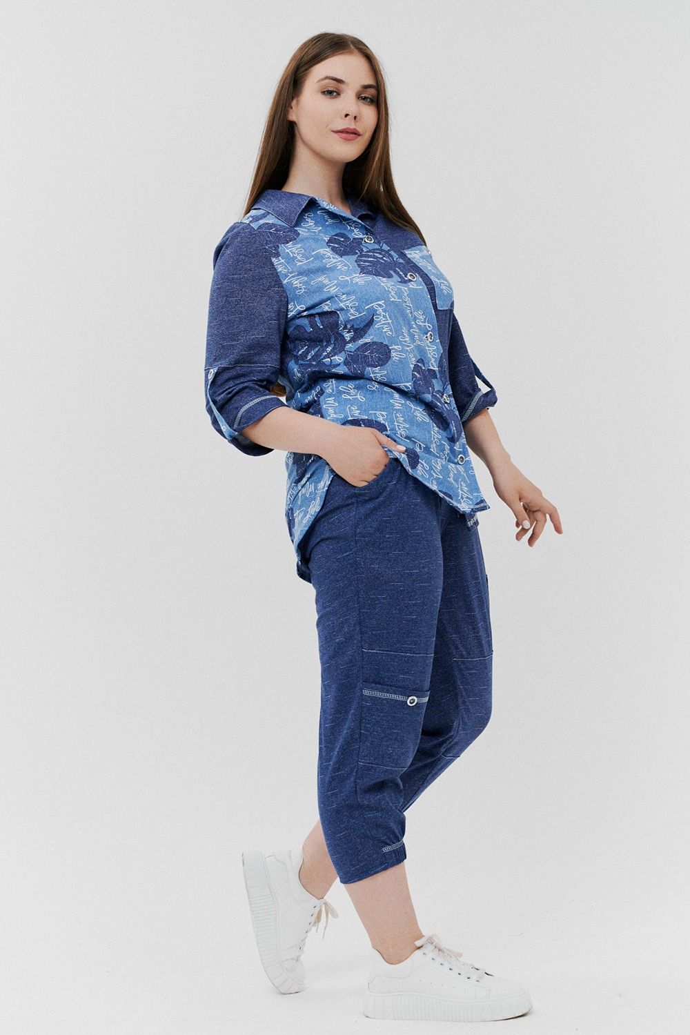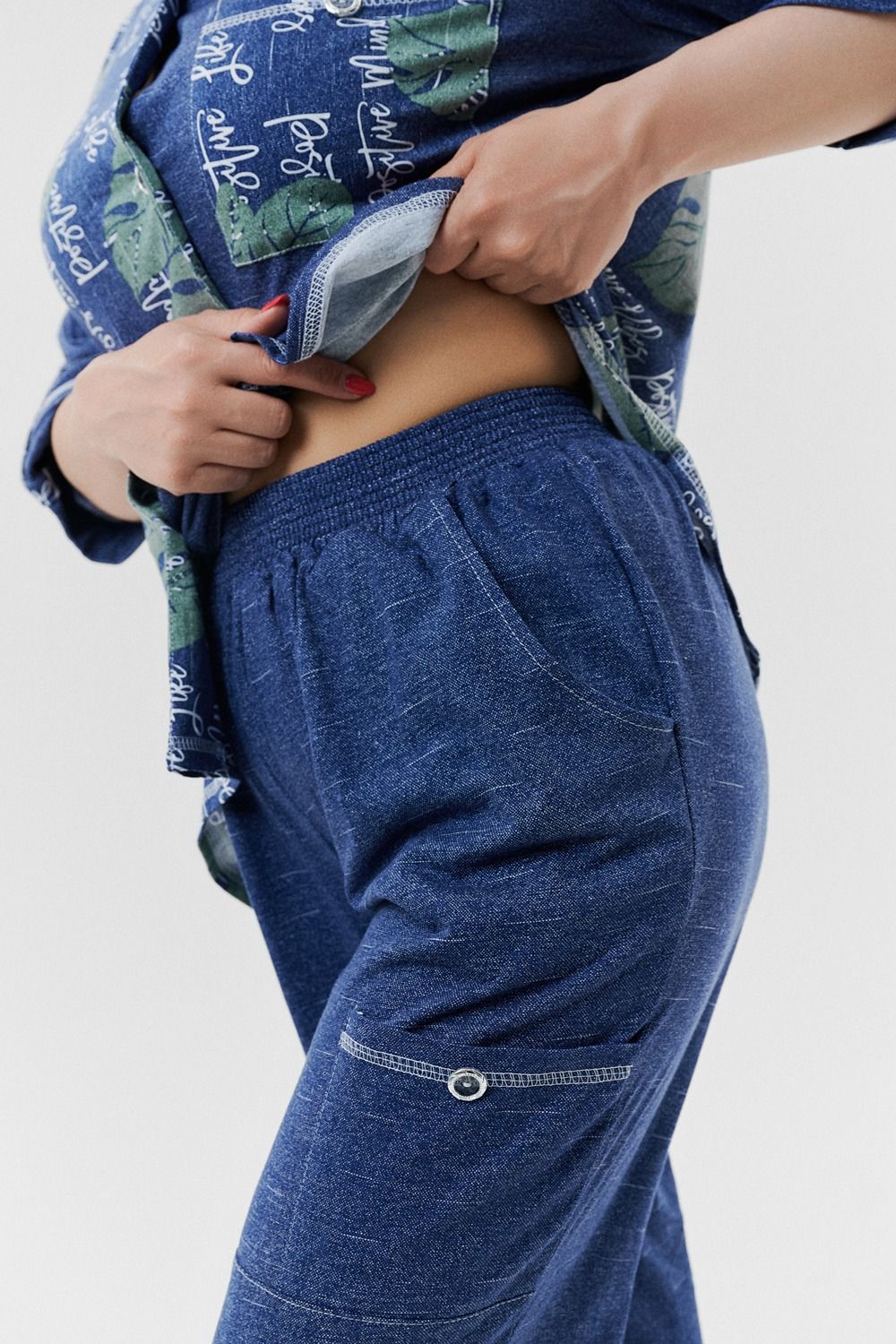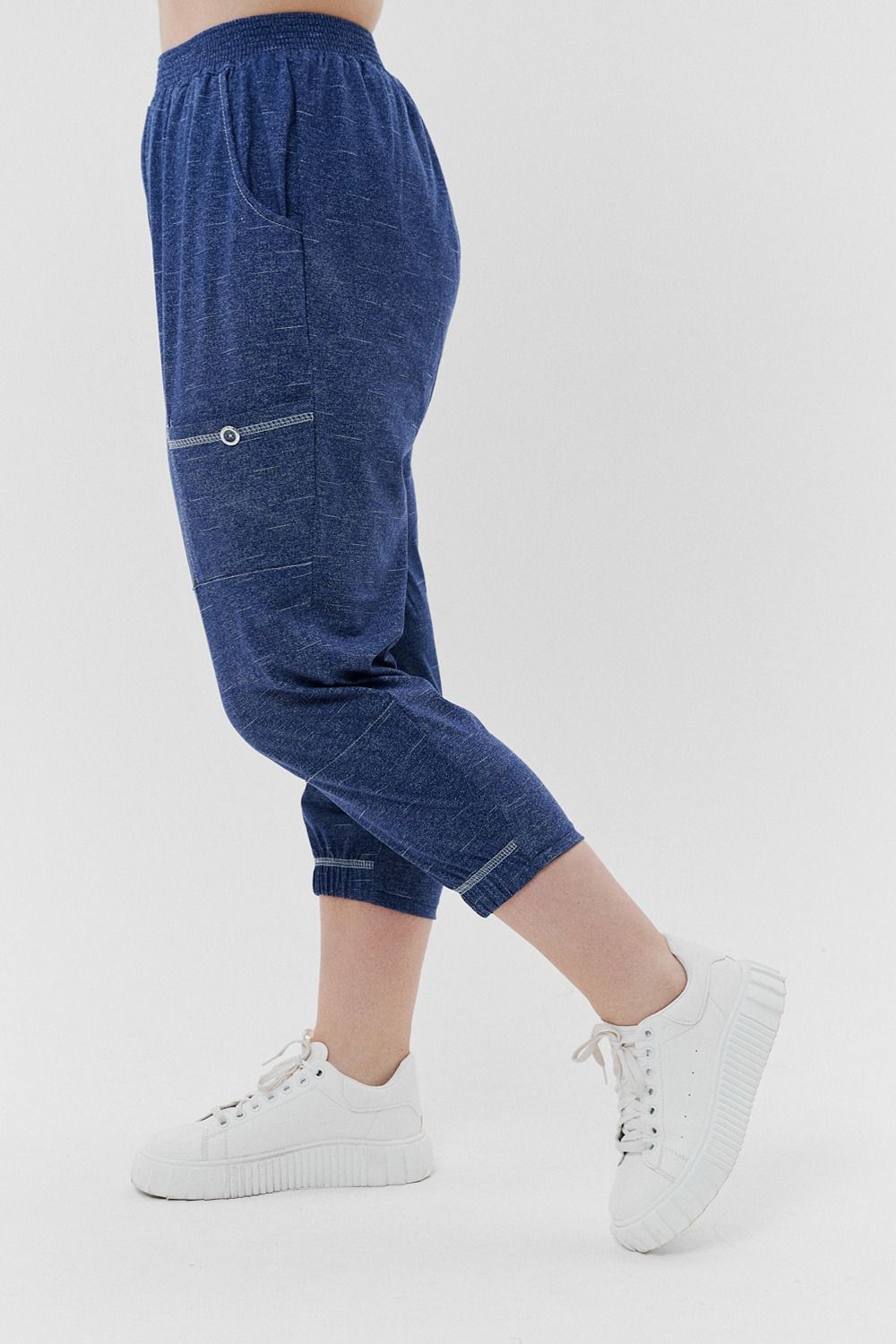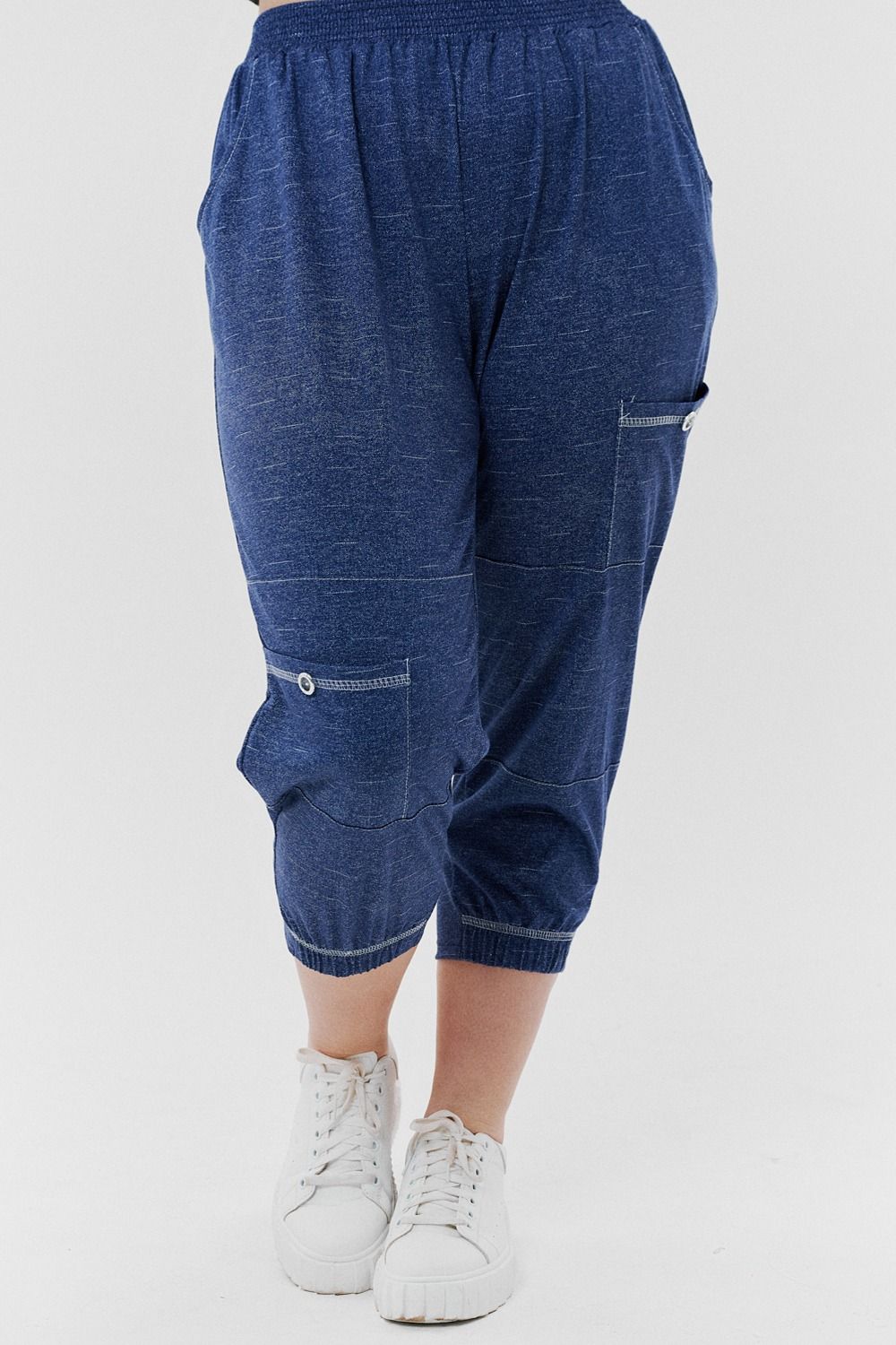 Брюки женские, "бананы". На передней части брюк внутренние карманы. Также имеются два накладных кармана с пуговицей, Один в верхней части брюк, другой на средней части брюк. Низ передней половинки брюк на резинке. Пояс прострочен на многоигольной машине.
