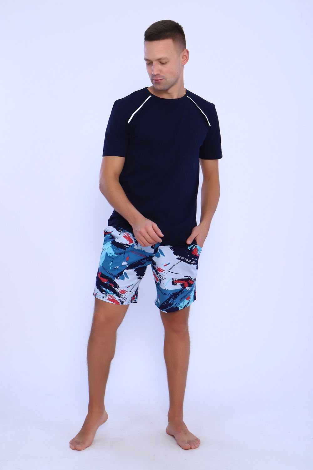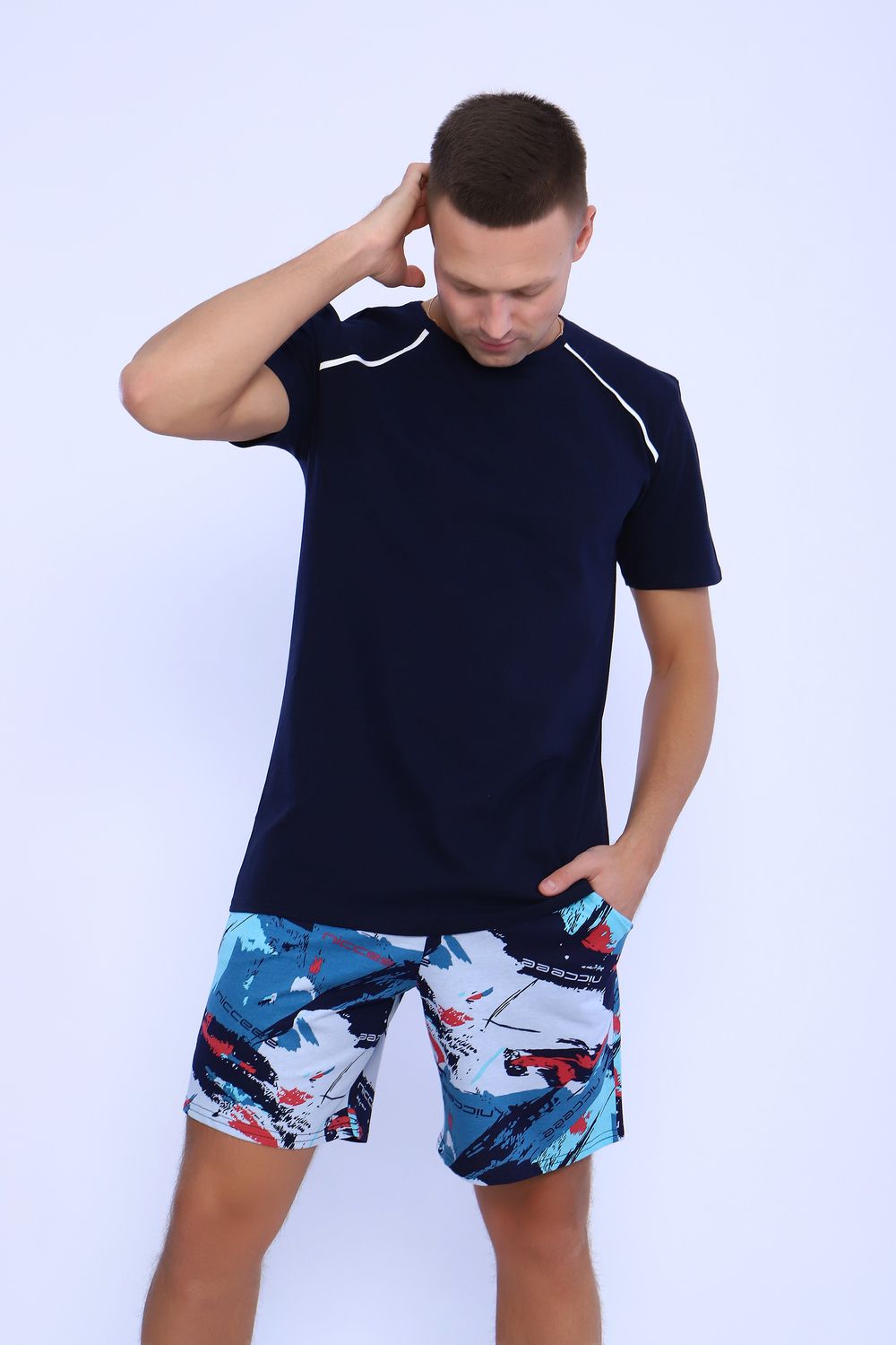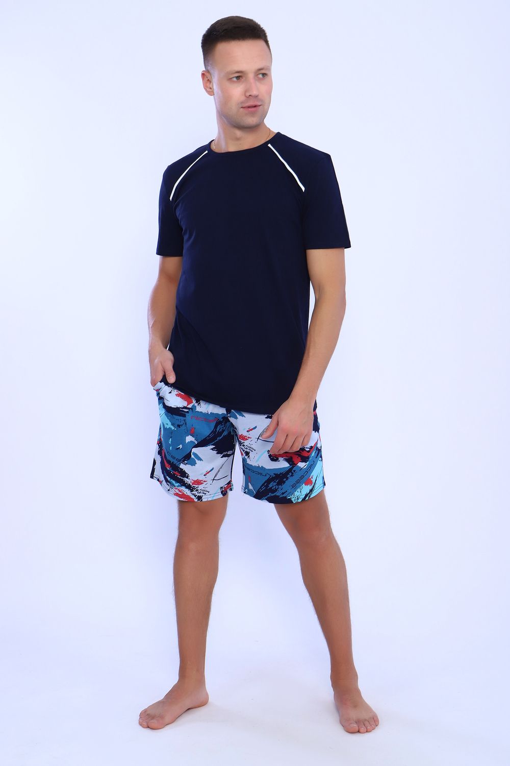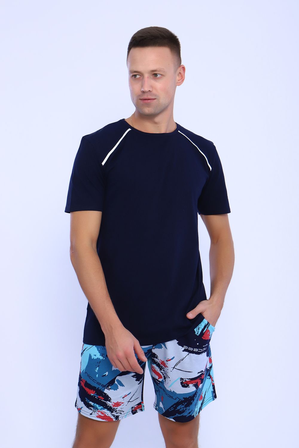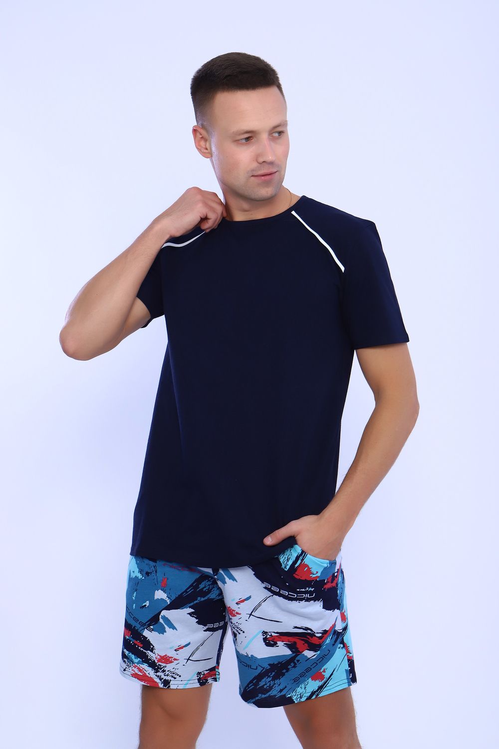 Мужской костюм состоит из футболки и шорты. Шорты с карманами, длина чуть выше колена. Есть голубой и темно-синий цвет, состав 100% хлопок. Комплект состоит из широкого размерного ряда. Отличный и удобный вариант на каждый день.