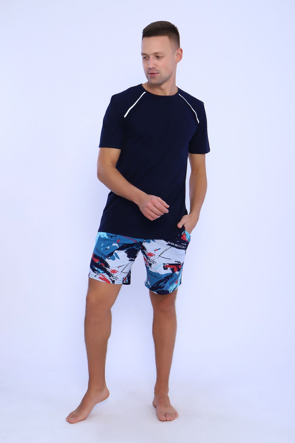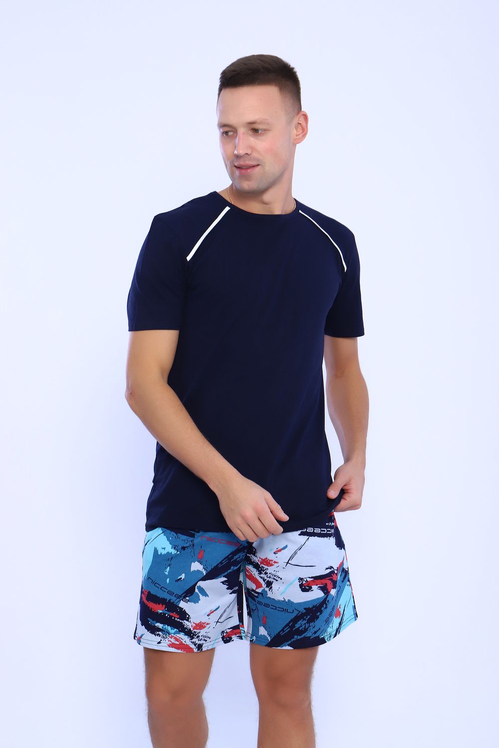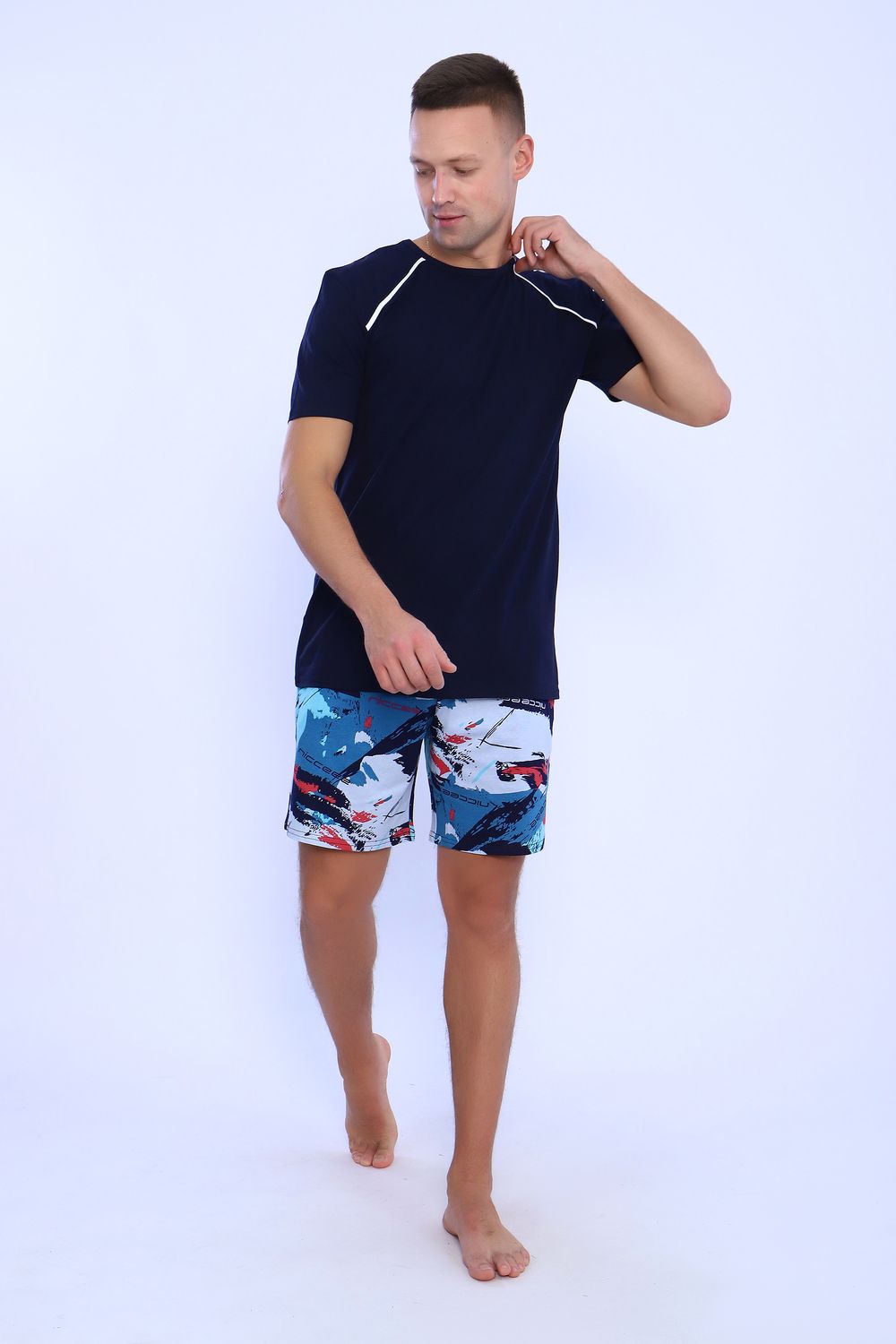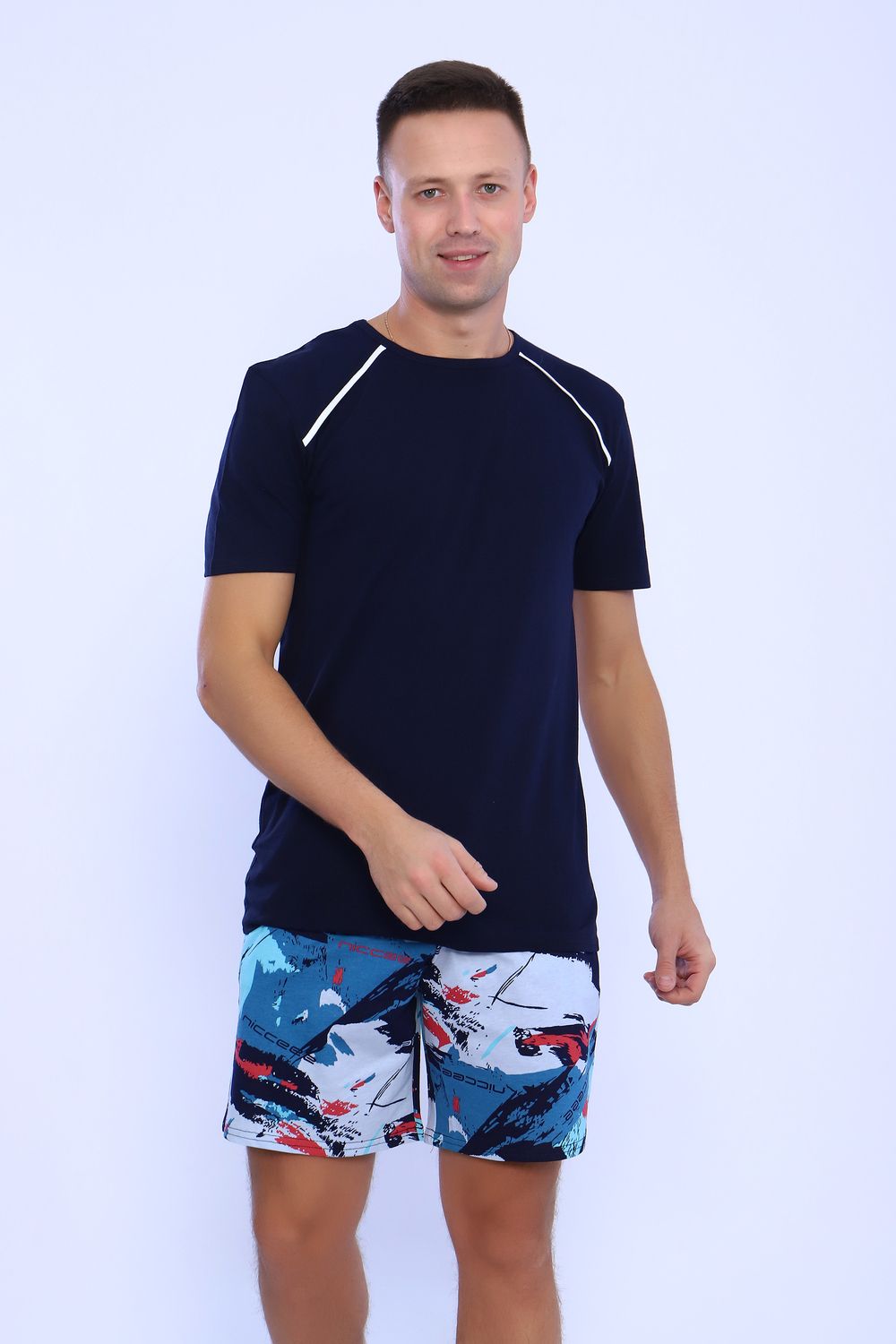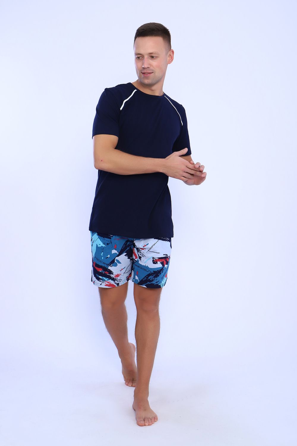Мужской костюм состоит из футболки и шорты. Шорты с карманами, длина чуть выше колена. Есть голубой и темно-синий цвет, состав 100% хлопок. Комплект состоит из широкого размерного ряда. Отличный и удобный вариант на каждый день.