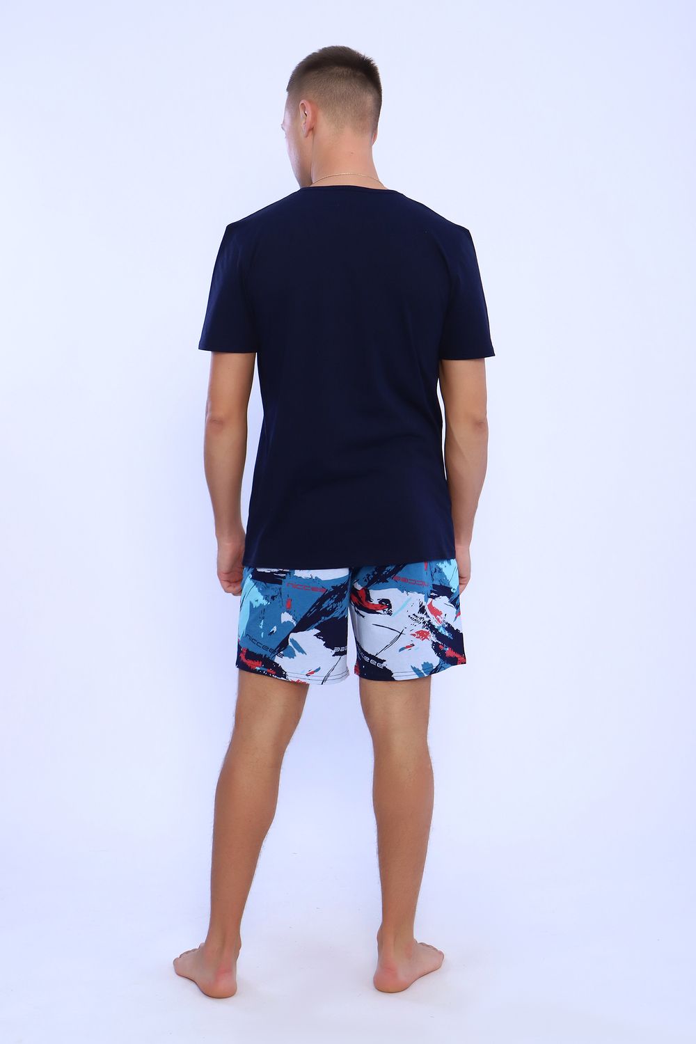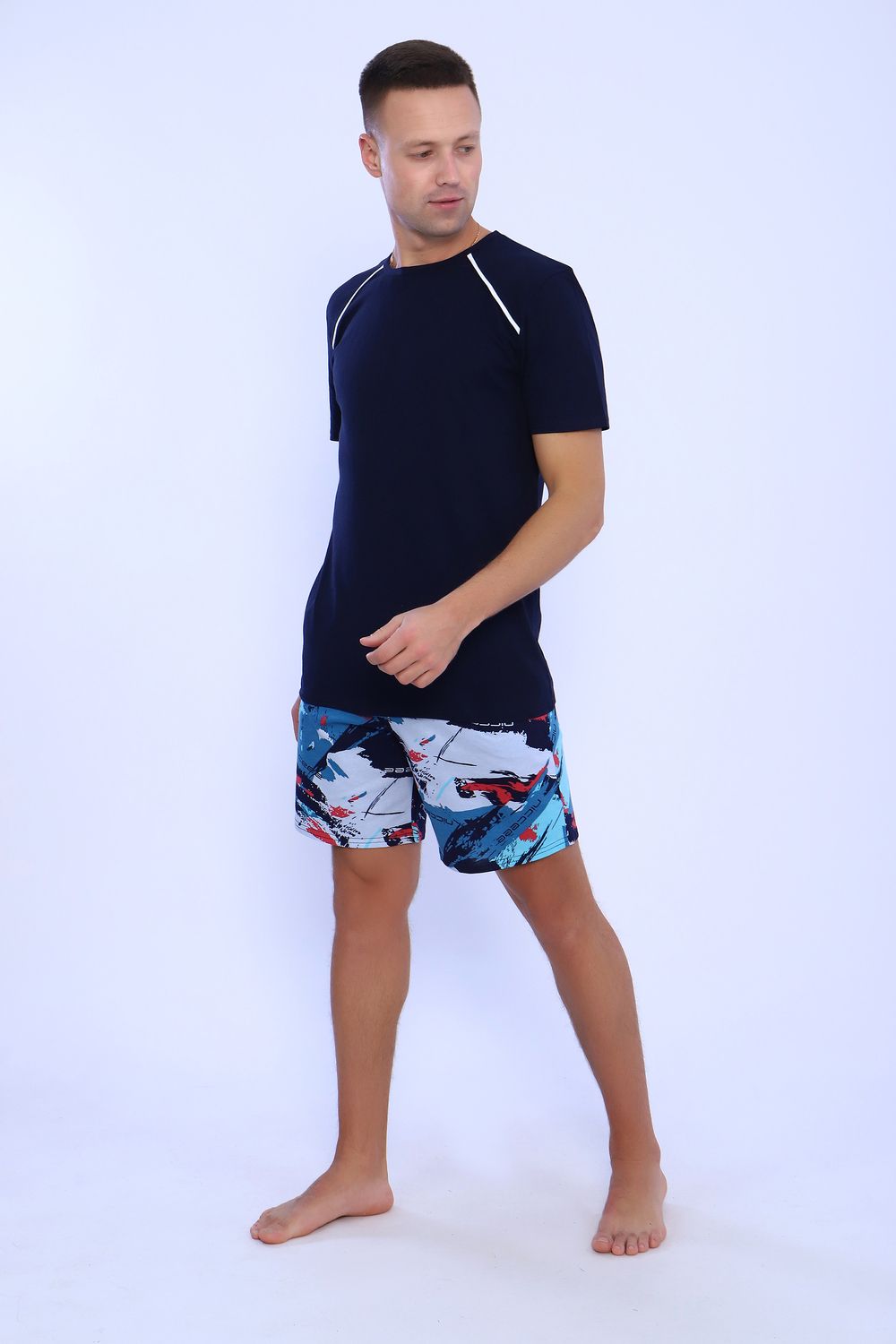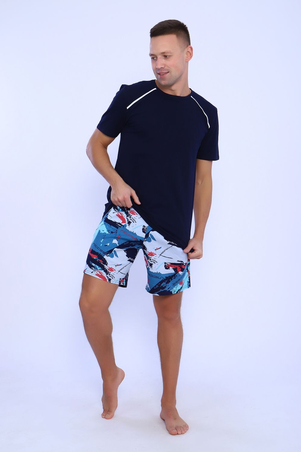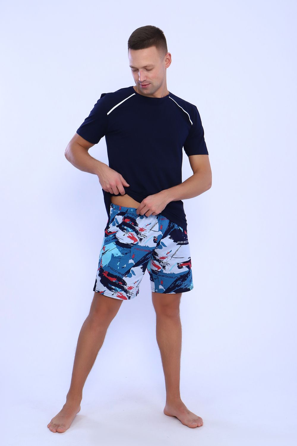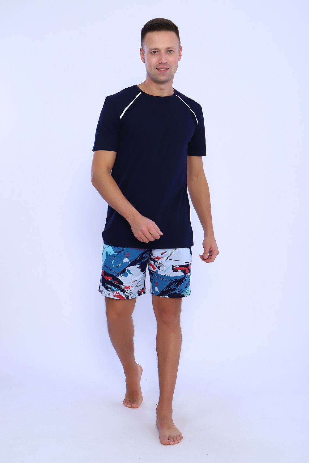 Мужской костюм состоит из футболки и шорты. Шорты с карманами, длина чуть выше колена. Есть голубой и темно-синий цвет, состав 100% хлопок. Комплект состоит из широкого размерного ряда. Отличный и удобный вариант на каждый день.