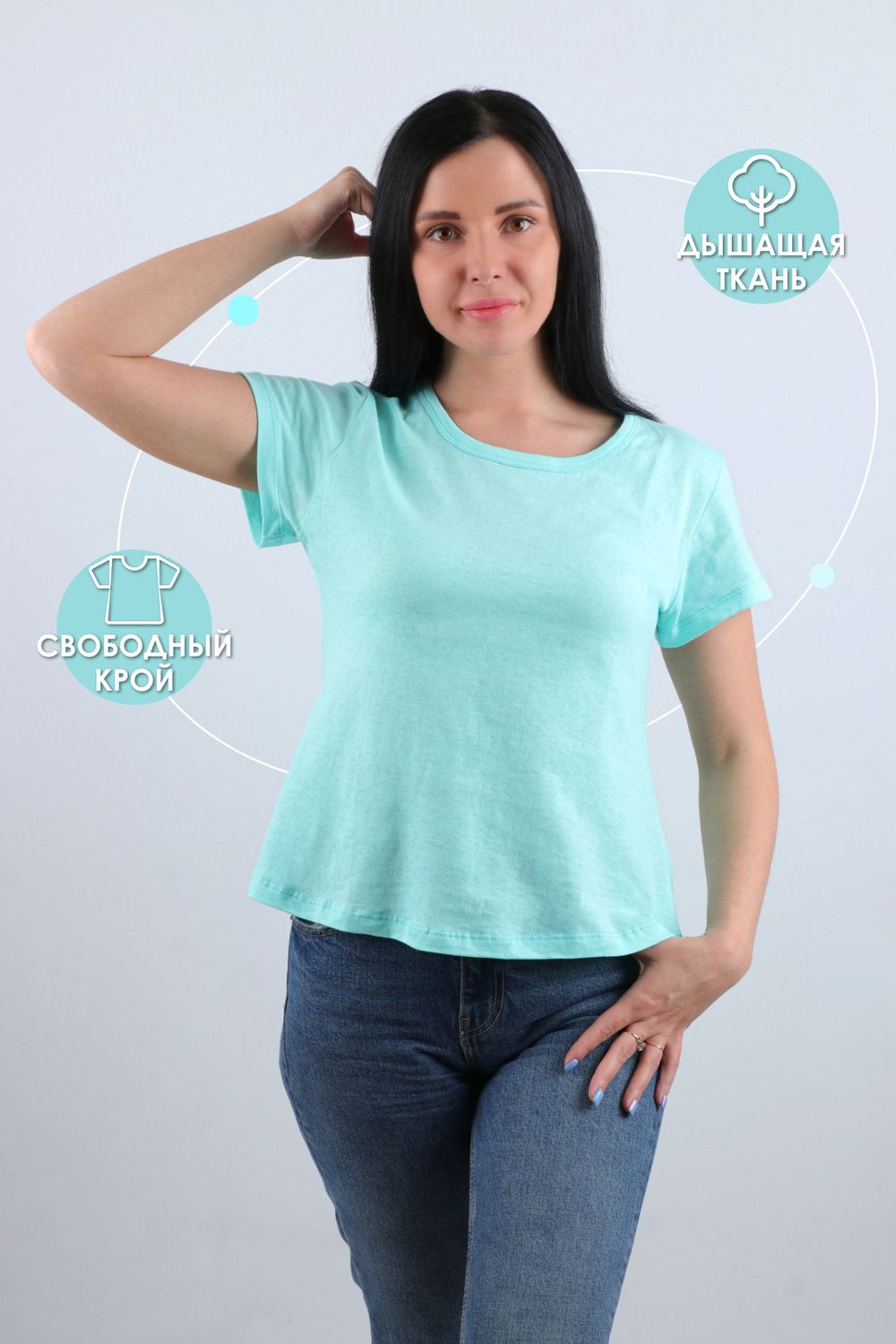 Женская базовая однотонная футболка из 100% натурального хлопка. Универсальная модель свободного покроя с короткими рукавами и округлым вырезом горловины прекрасно смотрится с джинсами, брюками и юбкой, ее можно надеть в офис под кардиган или пиджак.