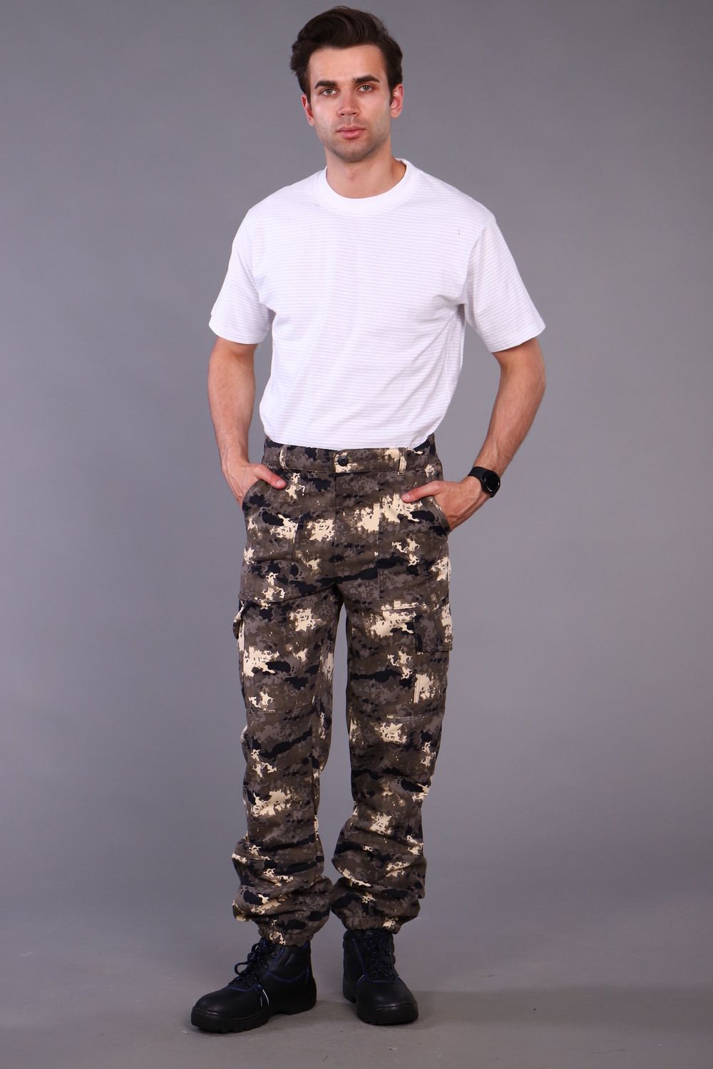 ➠ Брюки с цельнокроеным поясом, застегивающимся на петлю и пуговицу. Передние половинки состоят из двух частей: верхней и средней. На верхних частях расположены верхние накладные карманы и нижние накладные карманы с фигурными клапанами на пуговицах. Нижние карманы с объемом с одной стороны и переходят на задние половинки.