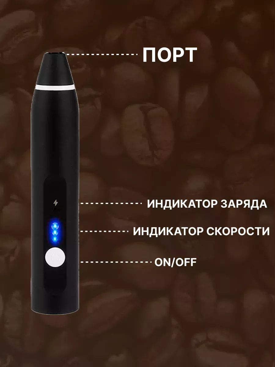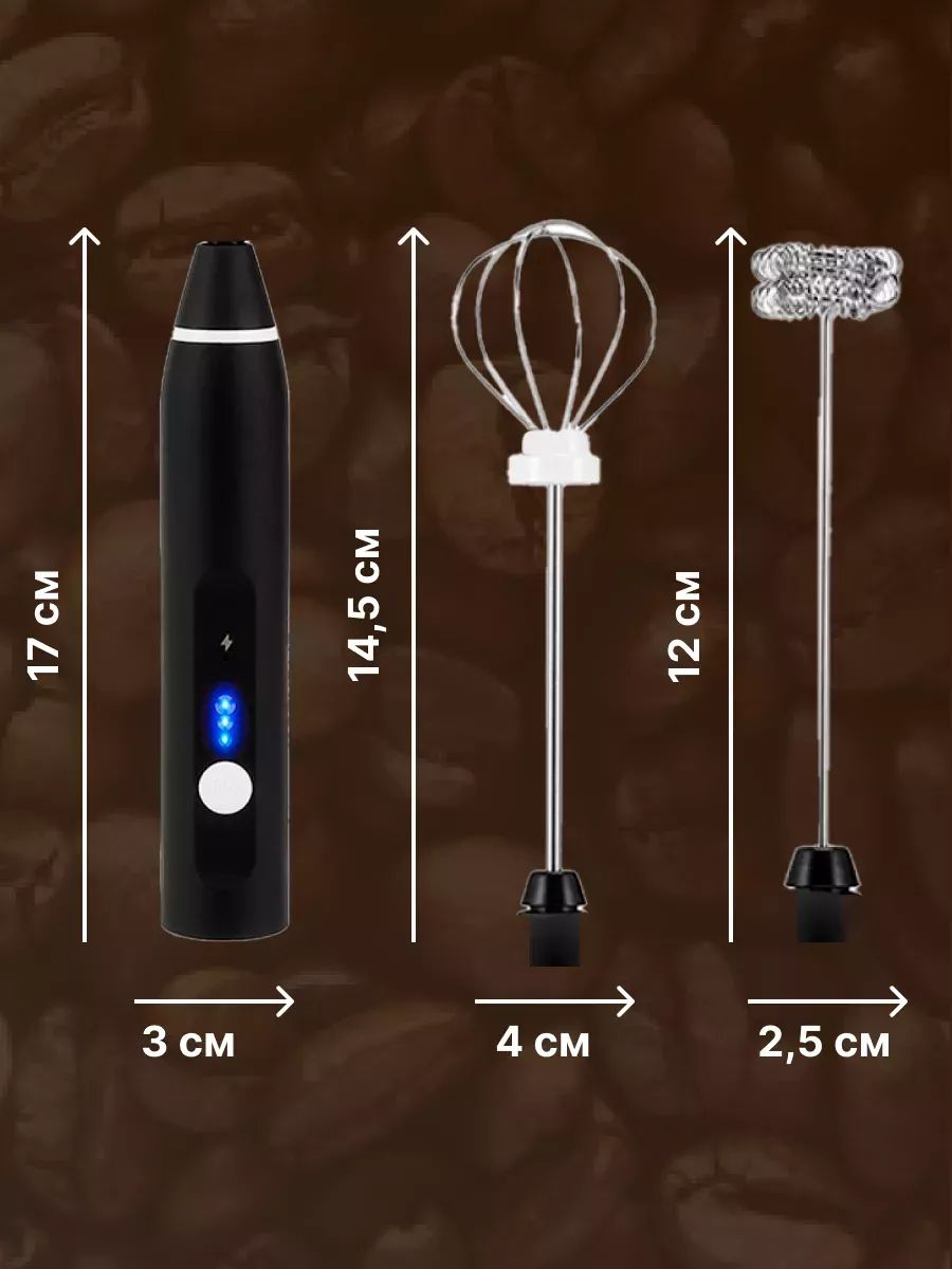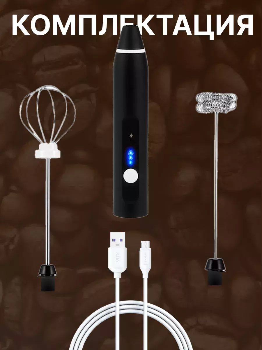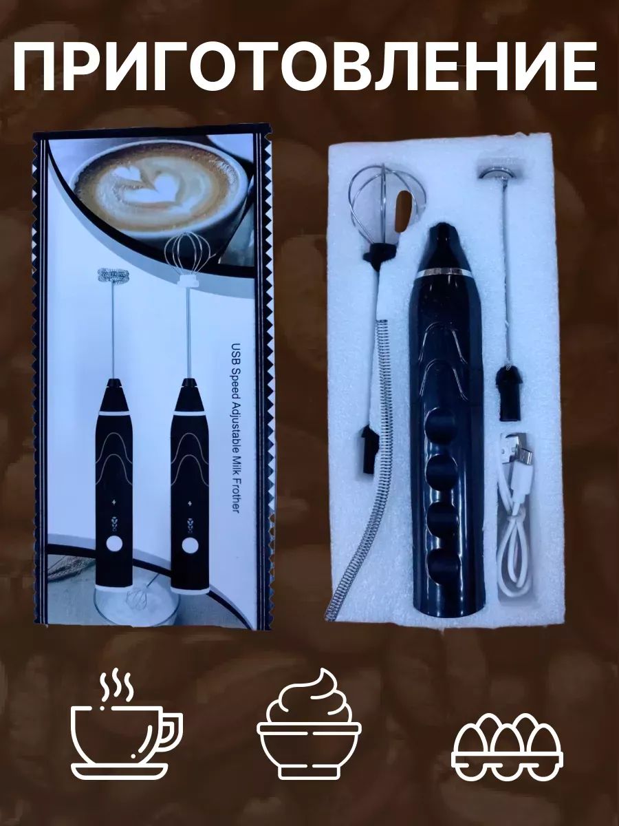 .еспроводной капучинатор - это компактный и мощный электрический вспениватель молока на аккумуляторе, который поможет Вам в создании густой пенки для ароматных напитков как латте, капучино, раф, а можно делать коктейли или протеин. Управление капучинатором очень простое и делается всего одной кнопкой: одно нажатие - ВКЛ на 1 скорости, еще одно нажатие - средняя скорость, еще одно нажатие высокая скорость. ВЫКЛ - нажать и удерживать 2 сек. 2 насадки в комплектке: насадка 1: идеально подойдет для взбивания молока. насадка 2: идельно для взбивания яиц. Смена насадок очень простая: для этого одной рукой держите капучинатор, а второй рукой слегка потяние насадку вверх и насадка выйдет из паза. Для установки другой насадки совместите пазы капучинатора с пазами насадки и вставьте до легкого щелчка.