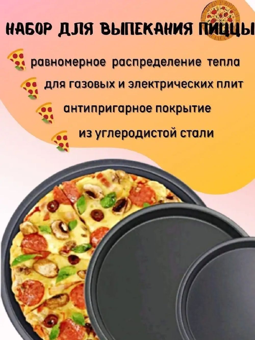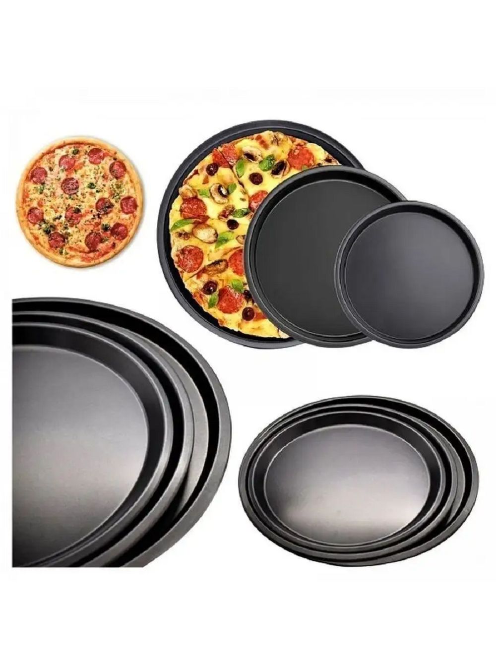 Круглые формы для пиццы изготовлены из углеродистой стали с антипригарным покрытием. Покрытие экологичное и безопасное для здоровья. В наборе 3шт. Размеры: 26, 29, 32см. Благодаря антипригарному покрытию нет необходимости использовать подсолнечное масло. Пища не пригорает и не прилипает к стенкам, легко достается из формы, сохраняя при этом аккуратный внешний вид. Изделие прослужит долго и обеспечит легкое и удобное приготовление вашей любимой пиццы. Формы разного диаметра позволят приготовить дома вкусную и ароматную пиццу. Особенности: приподнятые края для безопасной пиццы/запеченные хорошо на месте и для легкого захвата, антипригарное покрытие для легкого снятия и быстрой очистки, профессиональная конструкция из весовой стали обеспечивает равномерное нагревание для оптимальных результатов выпечки. Подходят как для газовых, так и для электрических плит.