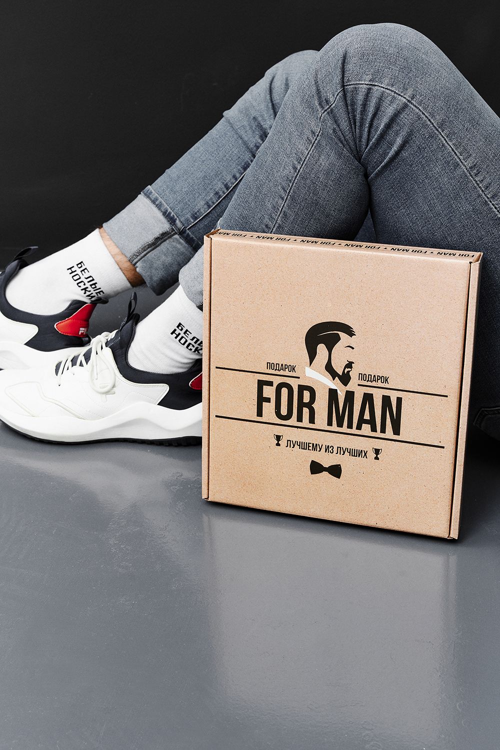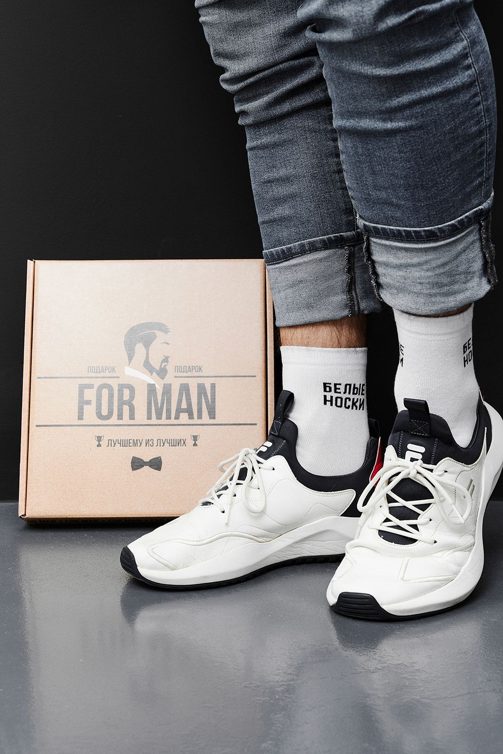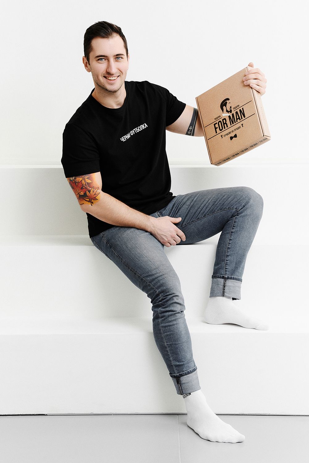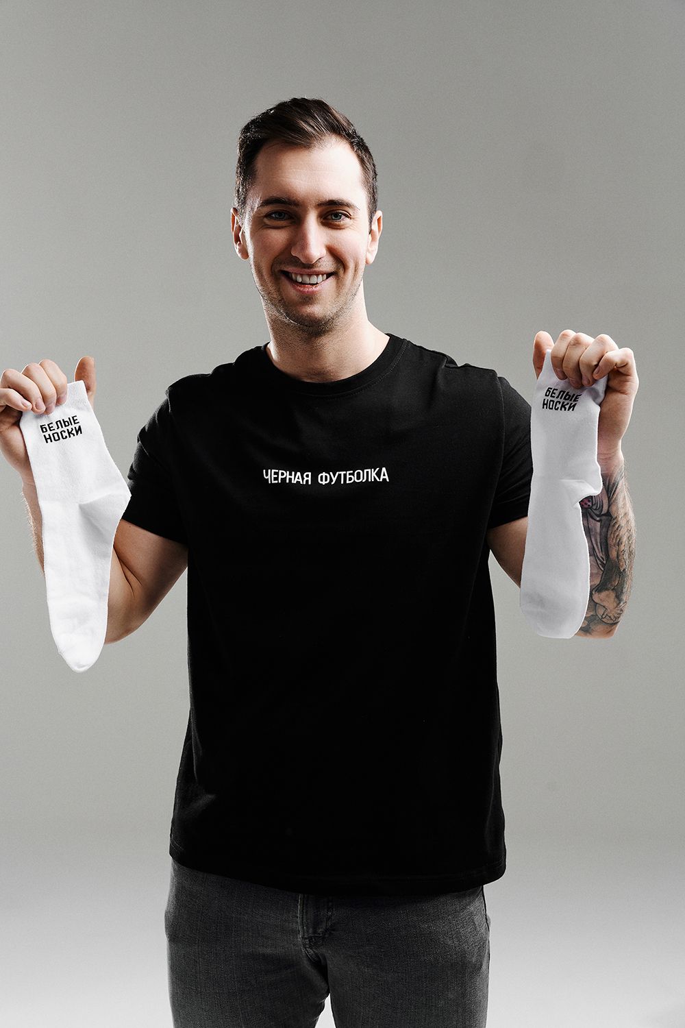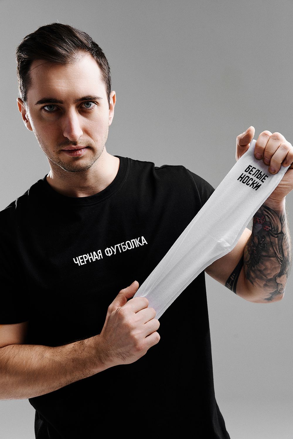 Подарочный набор "ЧЕРНАЯ ФУТБОЛКА-БЕЛЫЕ НОСКИ". Черная мужская футболка с принтом и носки с принтом подчеркнут вкус и чувство юмора. Подарочный набор упакован в крафтовую коробку с тематическим принтом. Футболка из 100% хлопка подойдет для повседневной носки и для выхода из дома. Мужская футболка подойдет для занятий спортом и для активных прогулок. Футболка будет отлично сидеть практически на любой фигуре. Носки подойдут к любой одежде и обуви. Изготовлены из высококачественного хлопка, который отлично впитывает влагу, пропускает воздух и подходит даже для самой чувствительной кожи. Хорошо сохраняют форму и цвет, устойчивы к истиранию. Подарочный набор "ЧЕРНАЯ ФУТБОЛКА-БЕЛЫЕ НОСКИ" будет отличным подарком второй половинке, близкому другу, отцу и дедушке. Рост модели на фото 183 см, размер 52. Размер носков 40-47.
