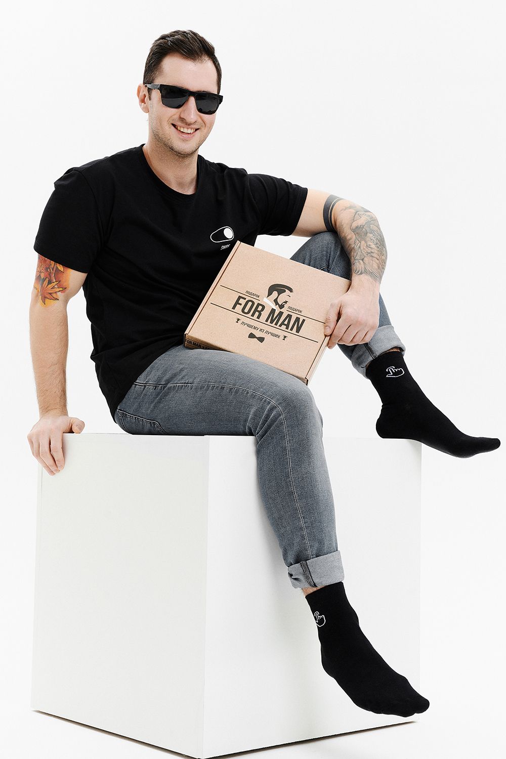 Подарочный набор "СВАЙП". Черная мужская футболка с принтом и носки с принтом подчеркнут вкус и чувство юмора. Подарочный набор упакован в крафтовую коробку с тематическим принтом. Футболка из 100% хлопка подойдет для повседневной носки и для выхода из дома. Мужская футболка подойдет для занятий спортом и для активных прогулок. Футболка будет отлично сидеть практически на любой фигуре. Носки подойдут к любой одежде и обуви. Изготовлены из высококачественного хлопка, который отлично впитывает влагу, пропускает воздух и подходит даже для самой чувствительной кожи. Хорошо сохраняют форму и цвет, устойчивы к истиранию. Подарочный набор "СВАЙП" будет отличным подарком второй половинке, близкому другу, отцу и дедушке. Размер носков 40-47.