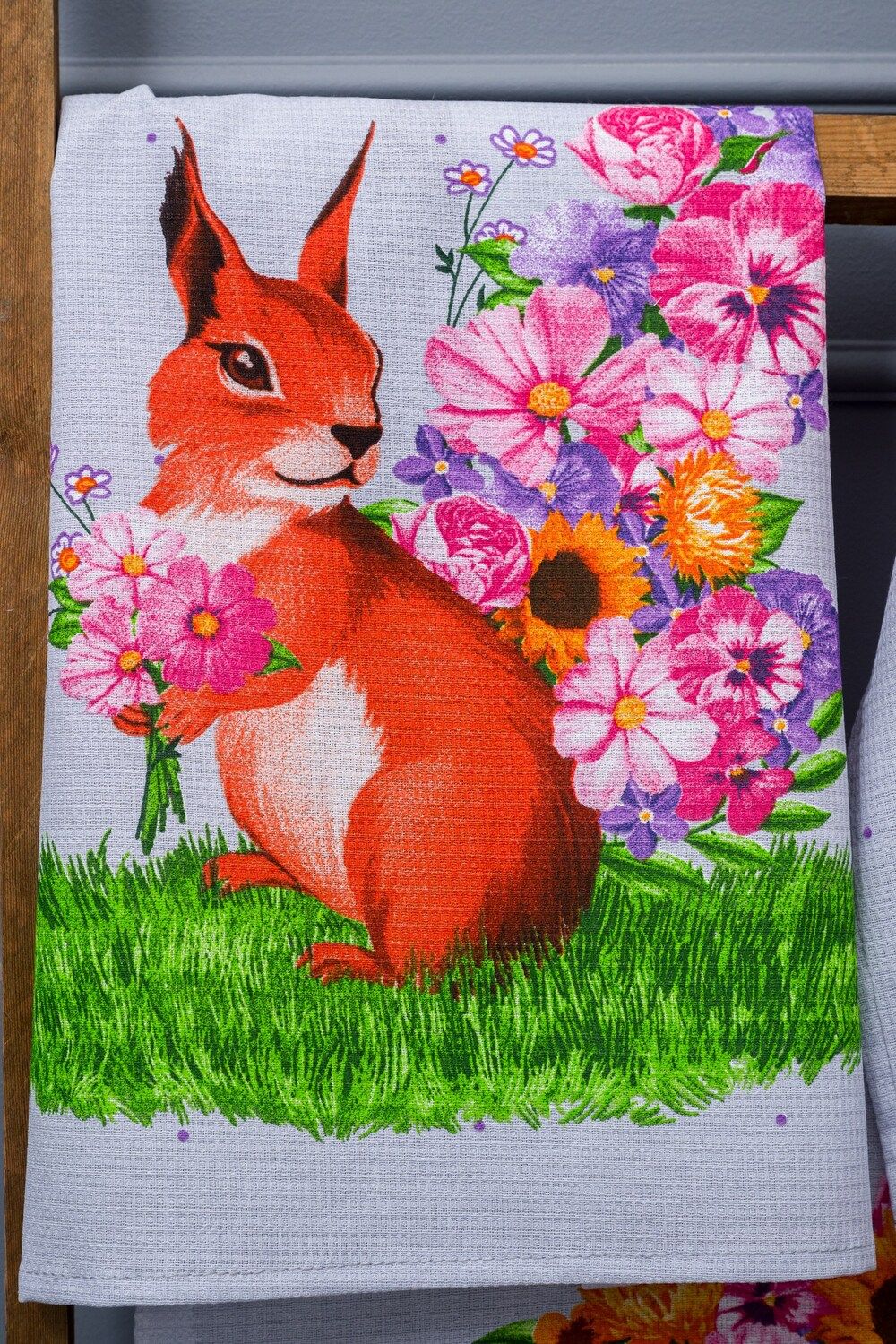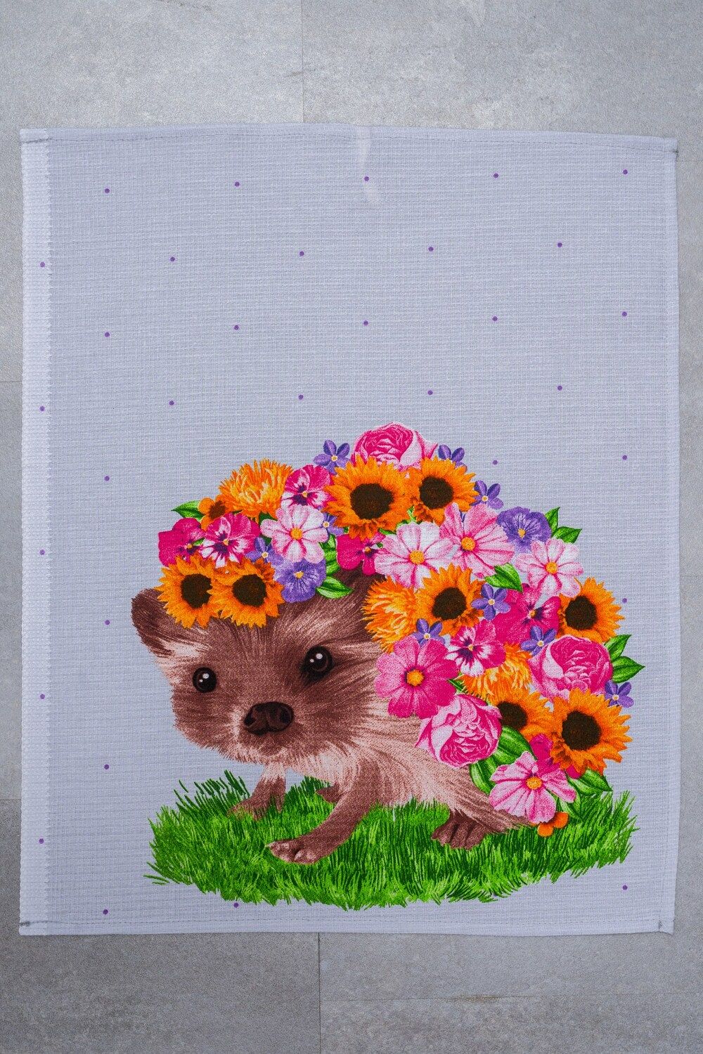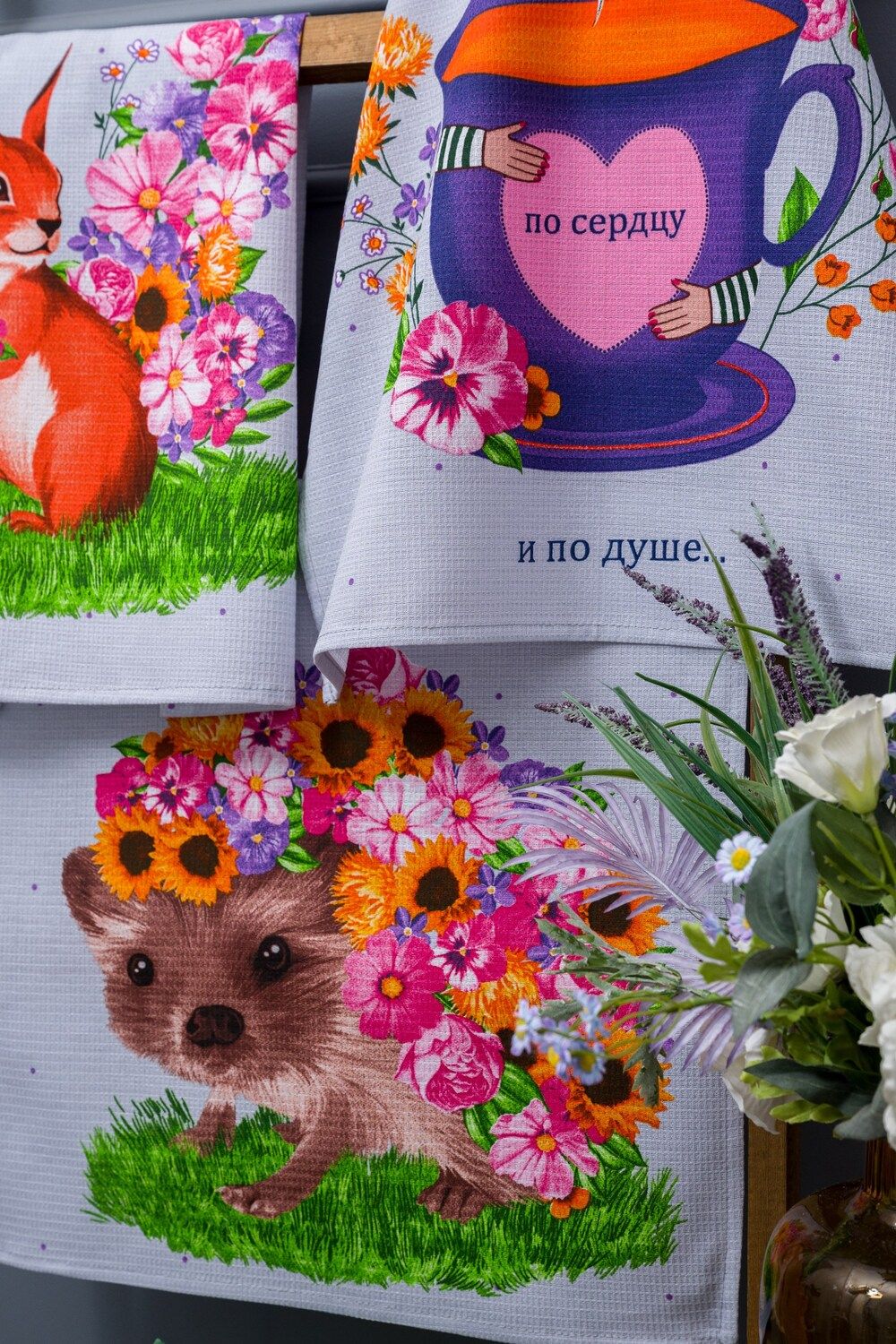 Этот набор кухонных полотенец "Цветочное настроение" - идеальное дополнение к вашей кухне. В наборе представлены 3 полотенца серого цвета с яркими цветами. Два полотенца украшены милыми изображениями белки и ежика, которые придадут вашей кухне уют и тепло.