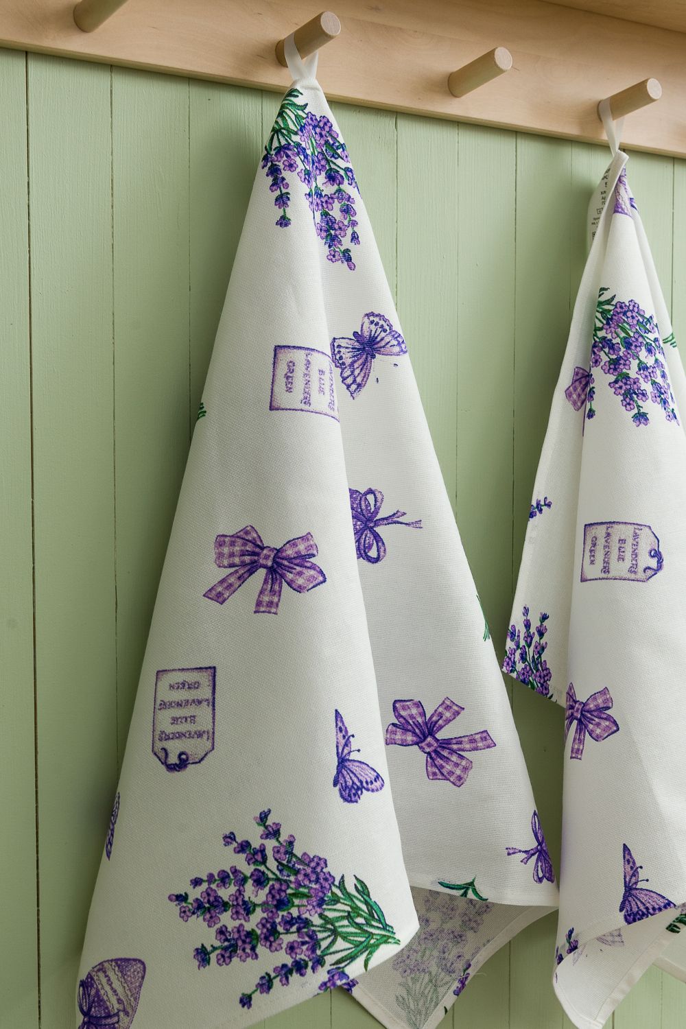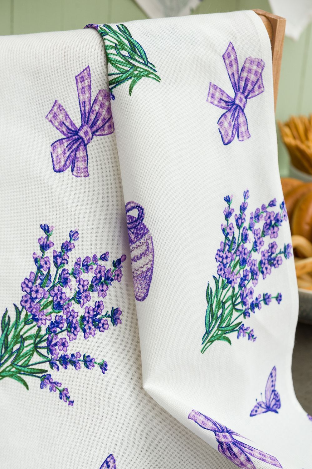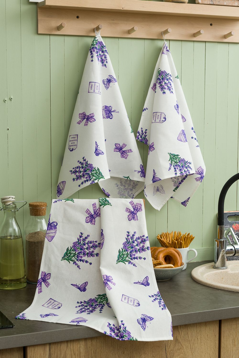 Набор из трех светлых полотенец размером 48*60, выполненных из белой рогожки с изображением цветов, сердечек и бабочек. К каждому полотенцу пришита петелька. В дополнение к полотенцам вы можете также купить скатерть Сиреневая дымка.