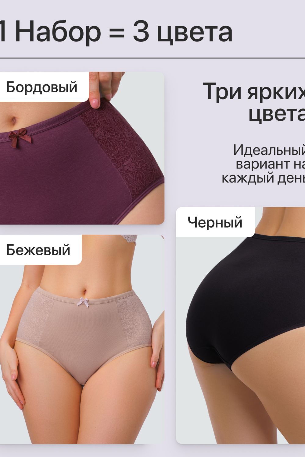 Набор трусов OIRO 3903 3 шт. хлопковые высокие - черн,беж,бордо