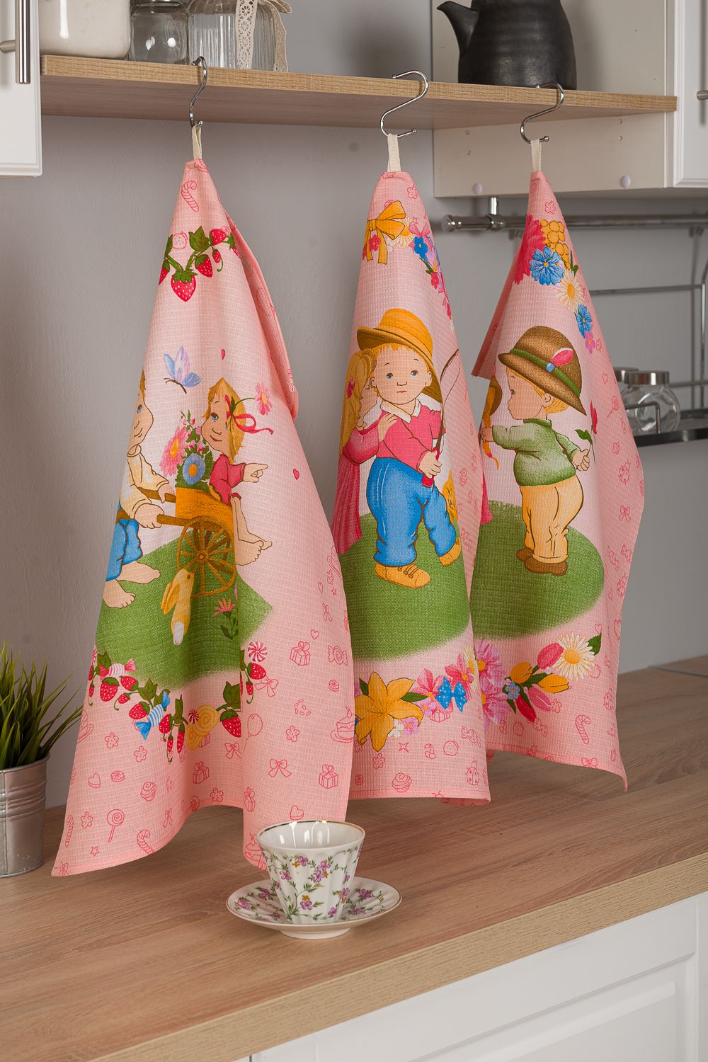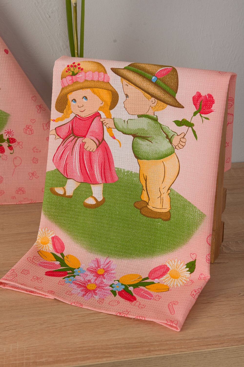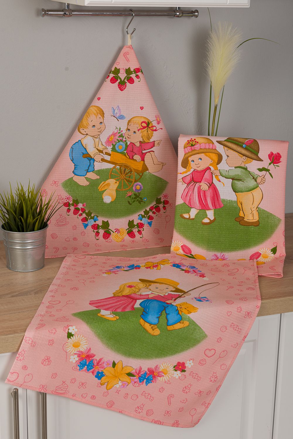 Набор из трех полотенец с петелькой размером 60*48 Весеннее настроение. Изделия выполнены из вафельного полотна с милым рисунком. На полотенцах изображена счастливая пара, на розовом фоне с сердечками. Такой набор подойдет для подарка для любимых на любой весенний праздник.