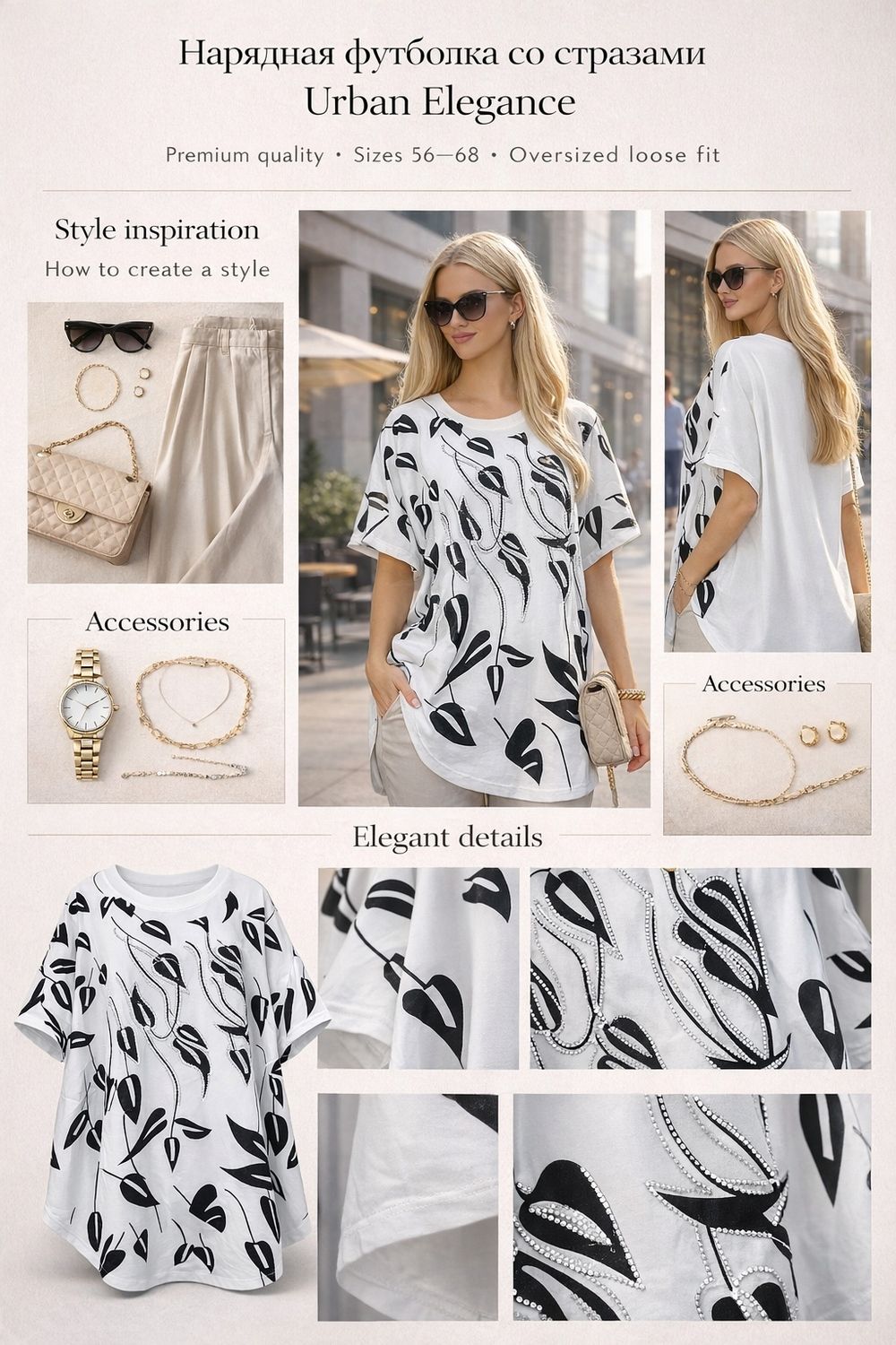 Нарядная футболка-туника oversize со стразами «Urban Elegance», арт. F8113 — где повседневный комфорт встречается с городской роскошью — это современная интерпретация базовой футболки: свободный оверсайз-крой, изысканный графичный принт и утончённые стразы превращают её в настоящий must-have для женщин, ценящих элегантность без излишеств.