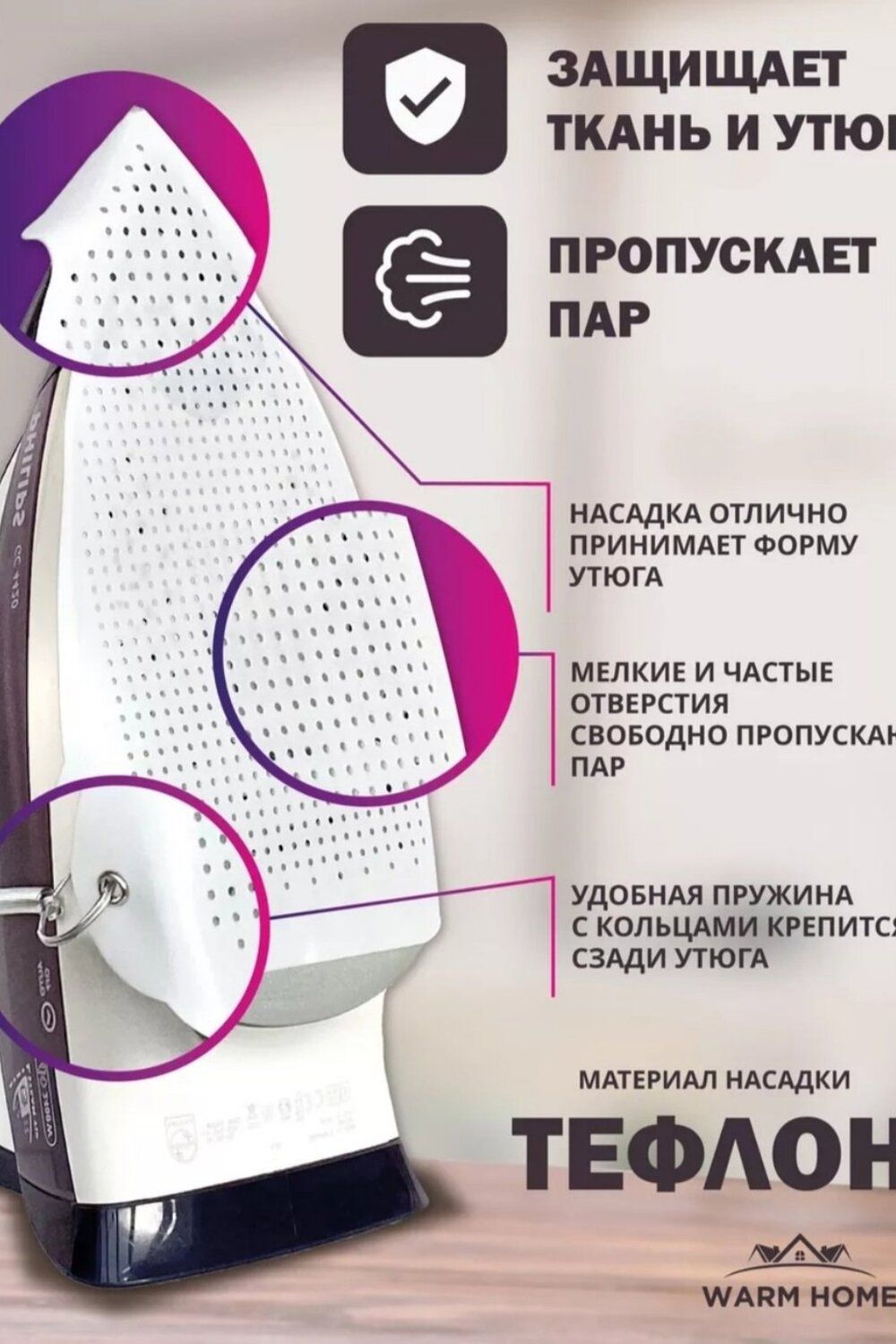 Насадка для утюга — незаменимый аксессуар для безопасной глажки деликатных тканей. Она защищает от появления блеска, пятен и повреждений, обеспечивая идеальный уход за вышивкой, аппликациями и другими нежными материалами. Благодаря специальным отверстиям, насадка идеально подходит для утюгов с функцией подачи пара, равномерно распределяя его по поверхности ткани и эффективно разглаживая складки. Этот аксессуар предотвращает пригорание тканей, защищает подошву утюга от загрязнений и царапин, продлевая срок службы устройства. Насадка обеспечивает лёгкое скольжение, делая процесс глажки более быстрым и комфортным. Универсальная конструкция позволяет использовать её с утюгами всех марок и моделей. Незаменимый выбор для тех, кто ценит качественный уход за одеждой и текстилем.