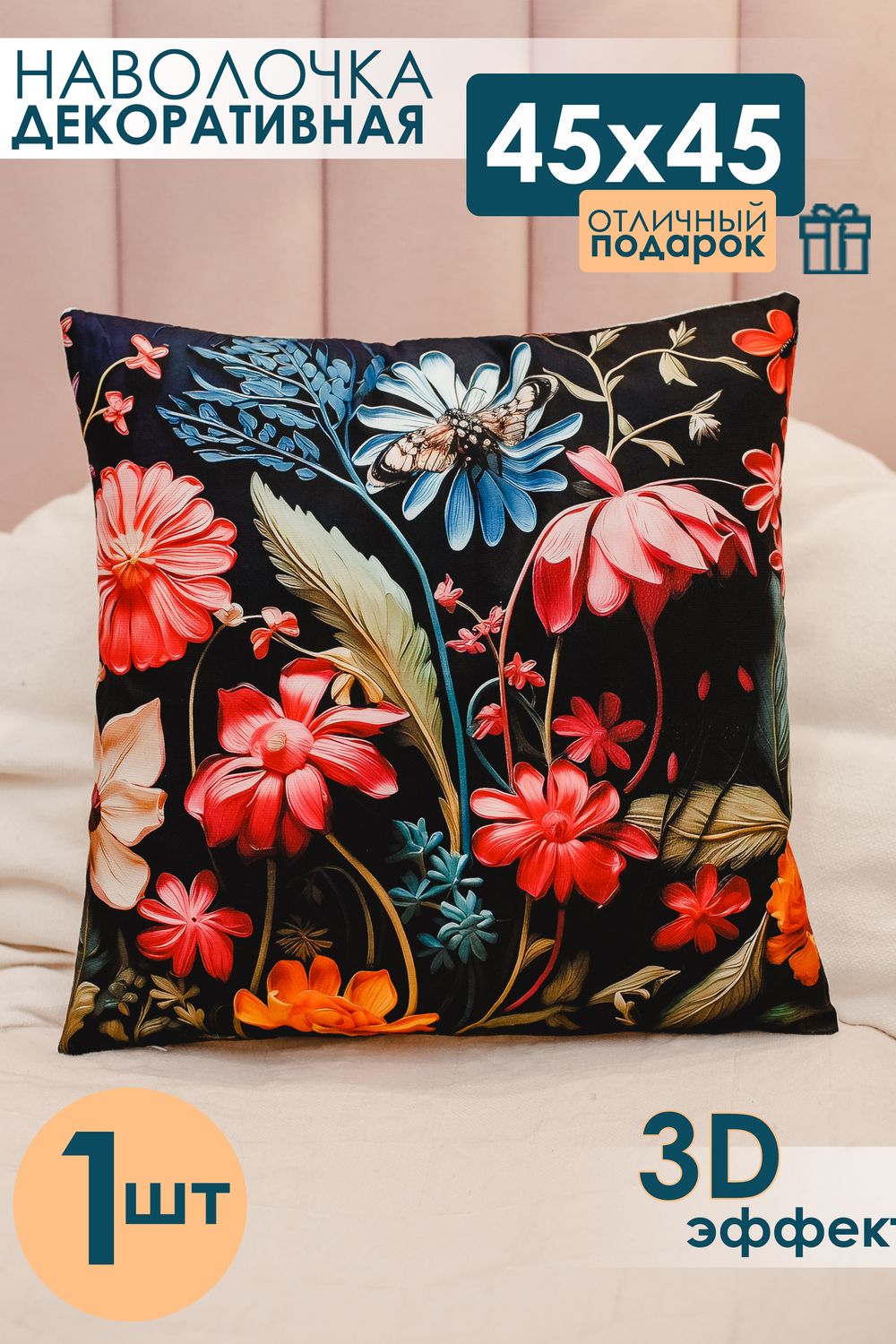 Наволочка декоративная 1 шт 3D эффект - черный+букет