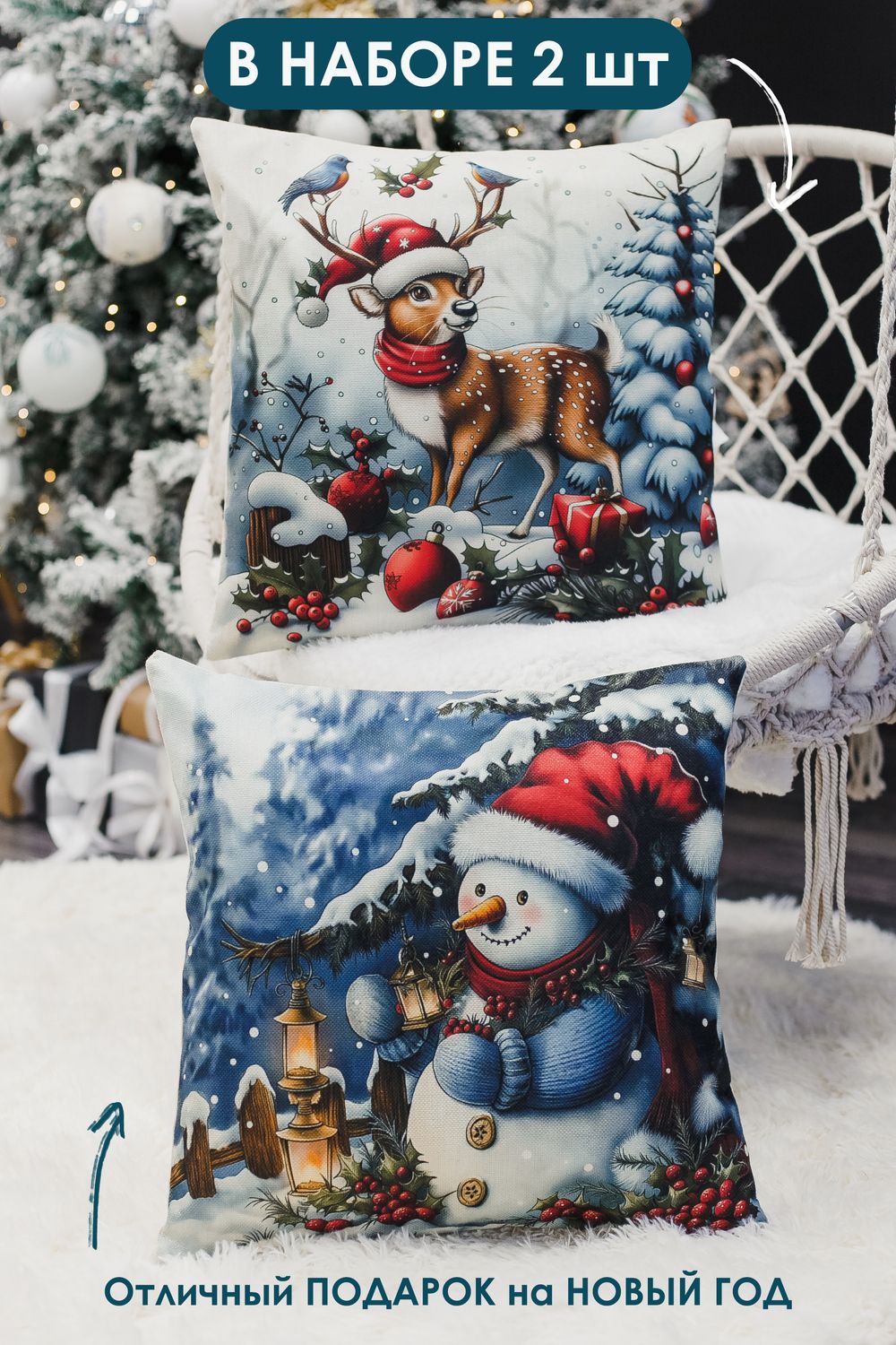 Наволочка декоративная новогодняя 2 шт рогожка - ОленьШапкаСнеговик
