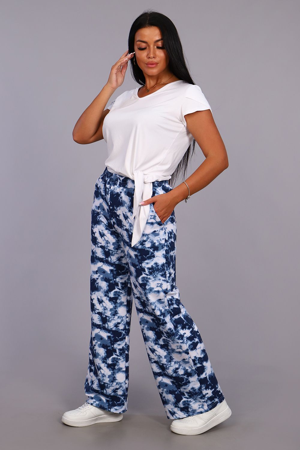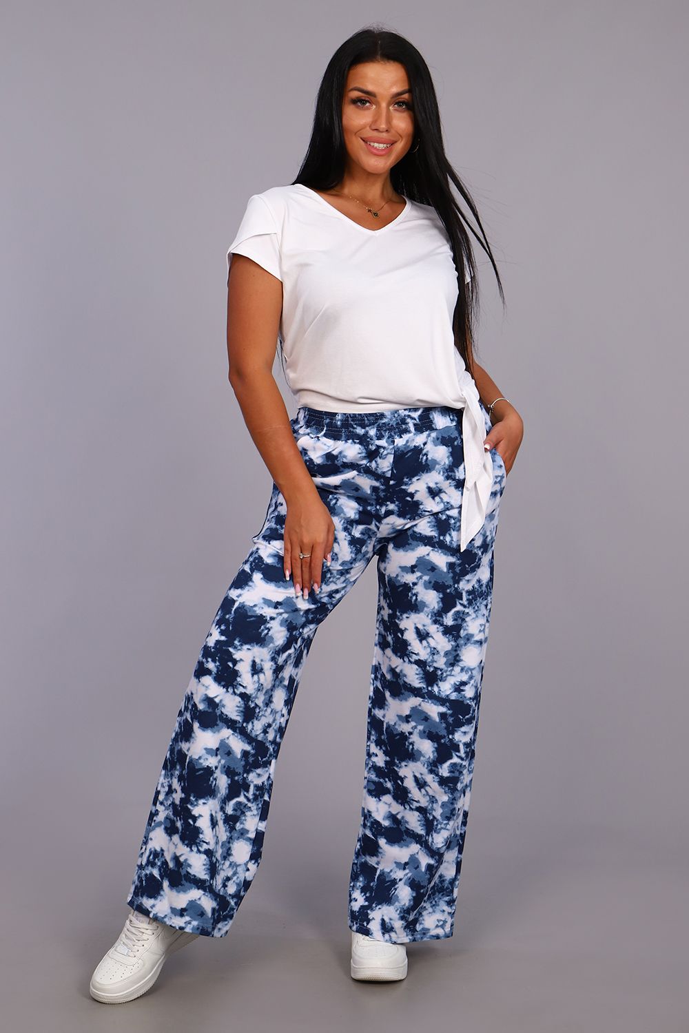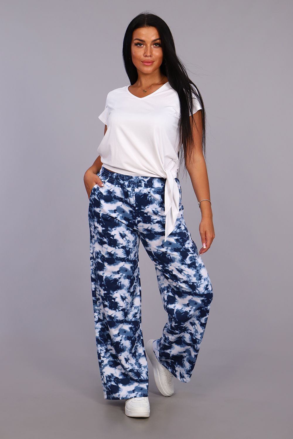 Женские модные брюки-палаццо выполнены из футера в стиле тай-дай. Тай-дай стал настолько большим феноменом, что даже смог проникнуть в уличную и высокую моду, где совершенно не затерялся и получил множество интересных интерпретаций. Высокая удобная посадка, вместительные боковые карманы и качественно обработанный на специальной машине пояс - все это позволит Вам чувствовать себя максимально комфортно. В брюках такого плана Вы будете выглядеть неординарно, модно и стильно.