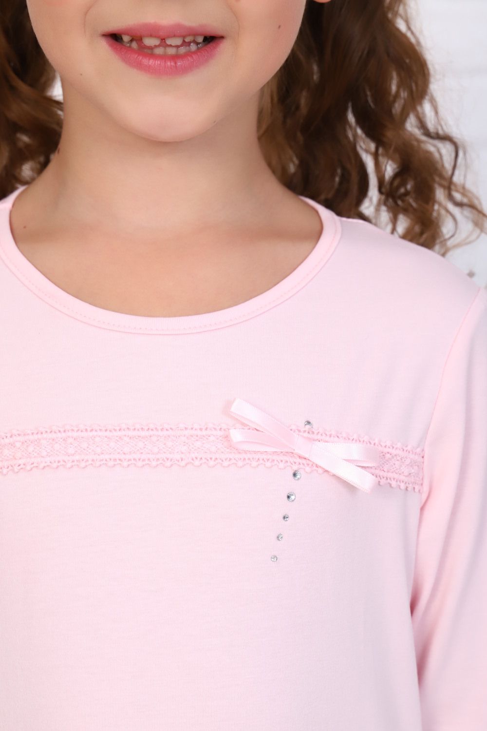 Блузка для девочек младшего и старшего школьного возраста, из однотонного трикотажного полотна. Блузка прилегающего силуэта, с втачным рукавом. Спереди и на спинке отсутствуют линии членения. Рукава длинные. Низа рукавов и изделия подогнуты. Горловина окантована. Спереди по линии груди настрочено кружево и прикреплен декоративный элемент из страз и атласной ленты.