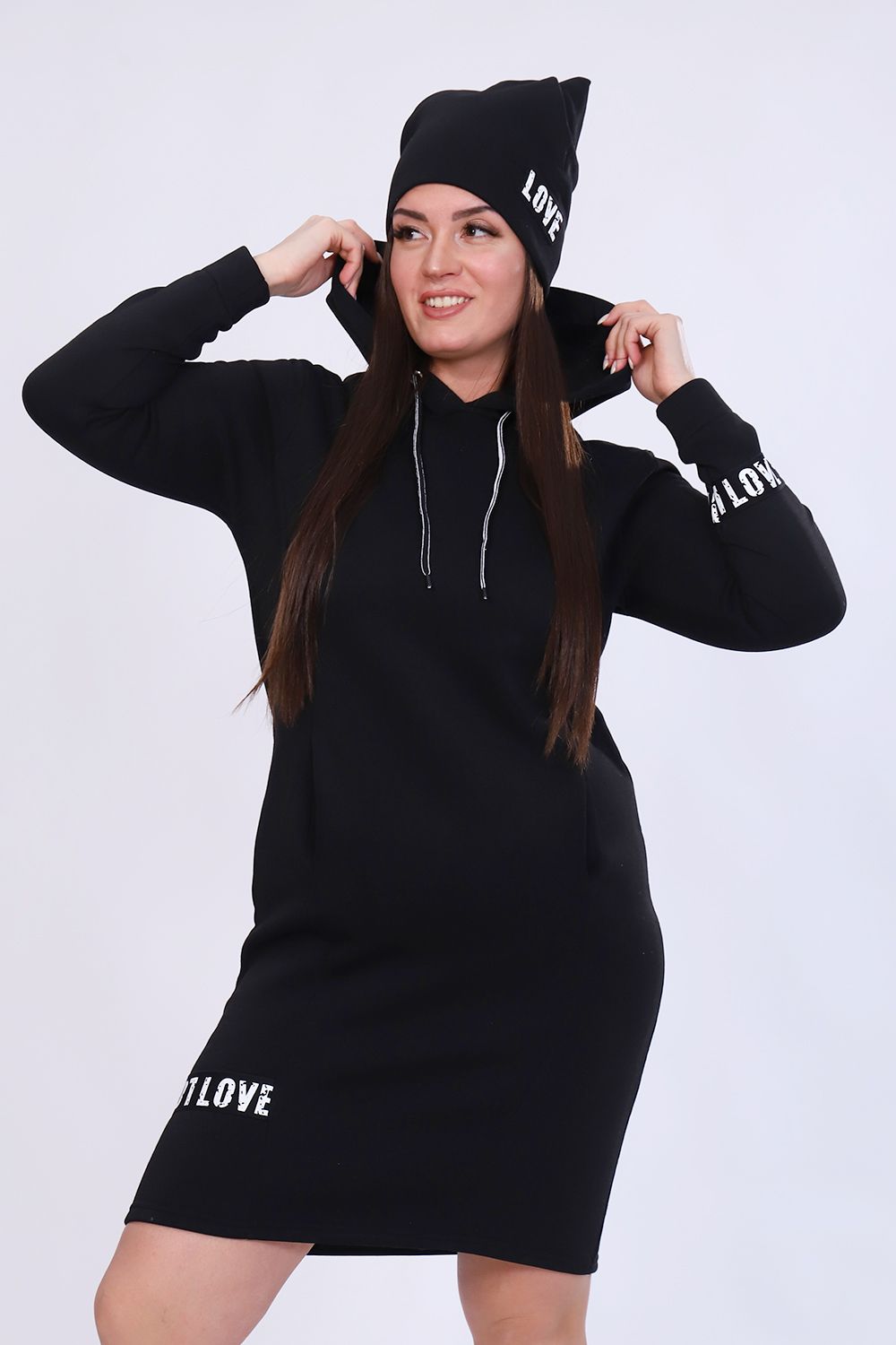 Комплект одежды платье + шапка. Платье прямого силуэта, с капюшоном на шнуровке через люверсы. Длинный рукав на манжетах, на одном рукаве декоративная надпись. На передней полочке внутренние карманы и декоративная надпись. Шапка с отворотом и декоративными ушками. Размер шапки 46-60. Удобно и практично.