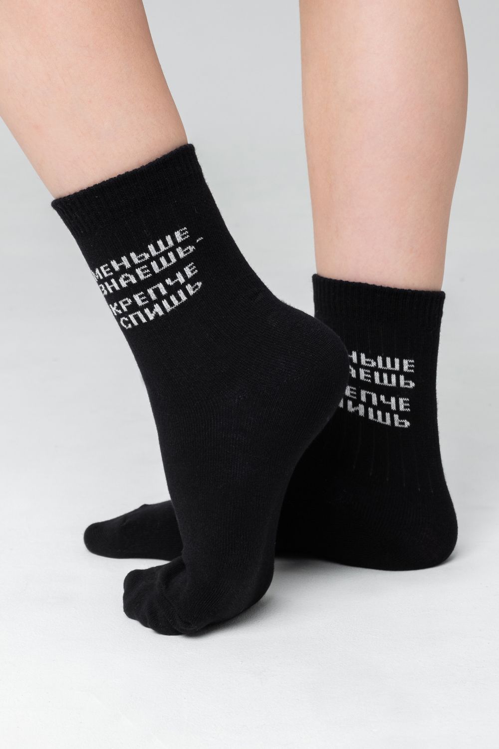Подростковые носочки с надписью "Меньше знаешь - крепче спишь", связанные из натурального хлопка. Креативная модель мягко облегает ногу, не доставляя дискомфорт в течение всего дня. Носки сочетаются с разной обувью, подходят как мальчикам, так и девочкам.