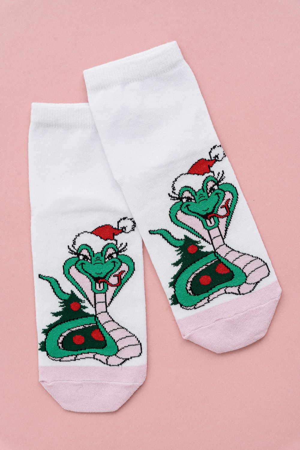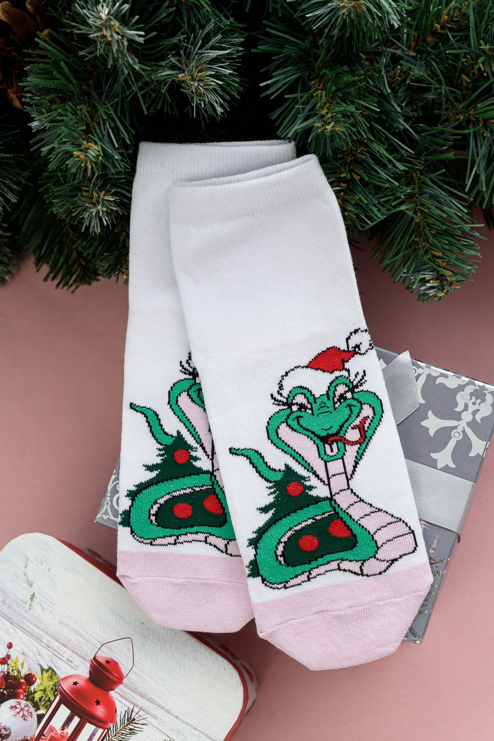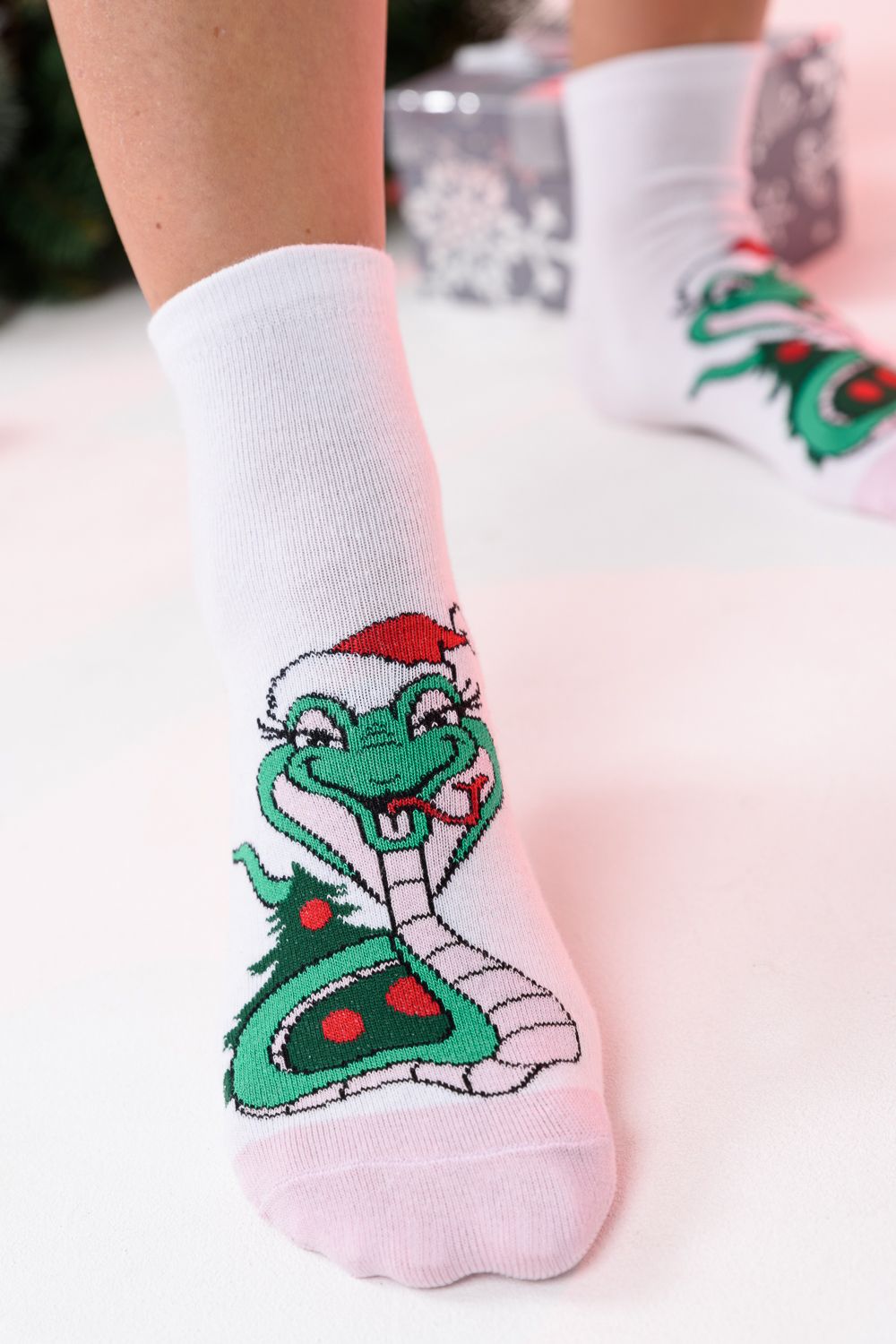 Оригинальные женские новогодние носки. В комплекте 1 пара. На основной части носка изображение символа будущего года Змеи.