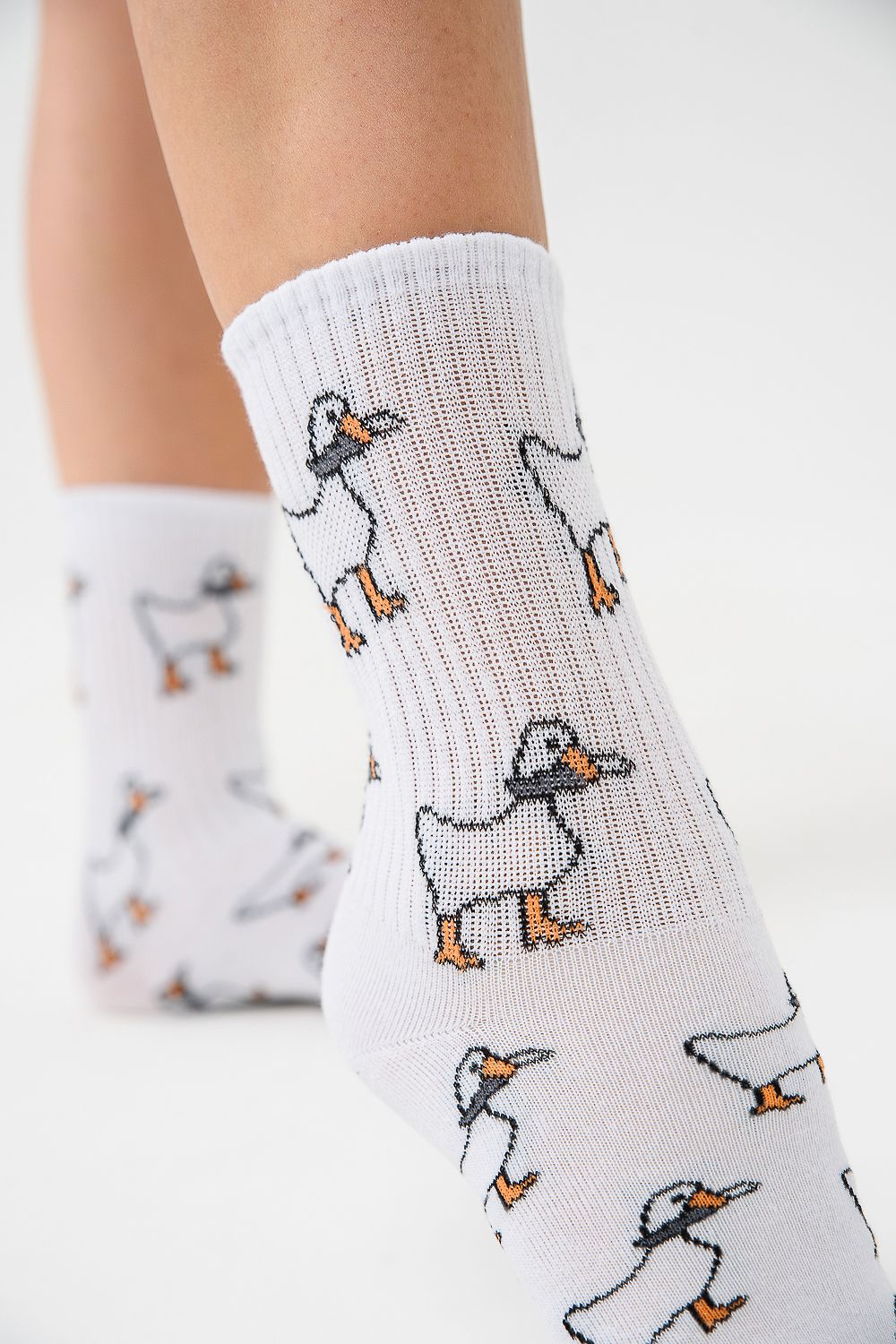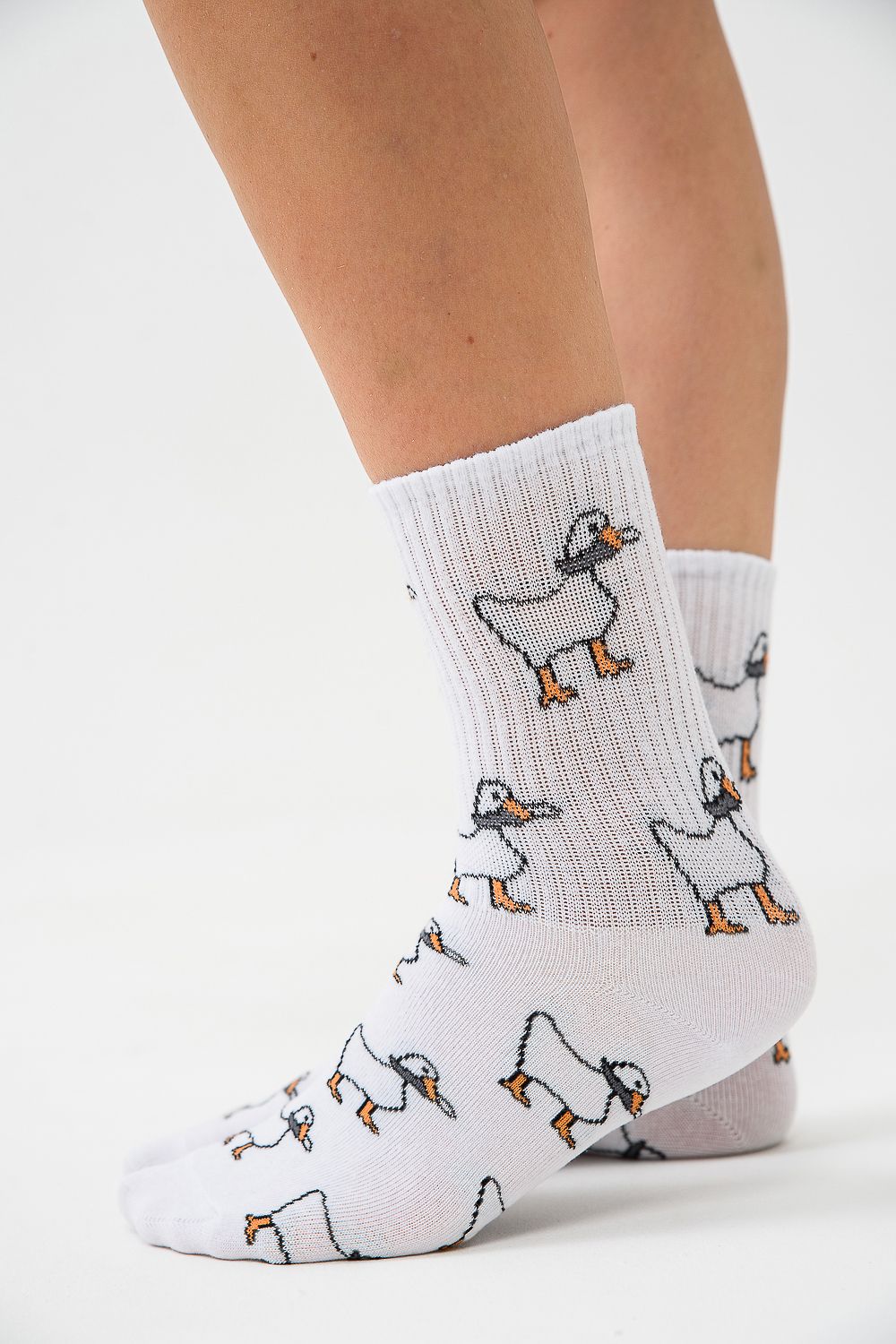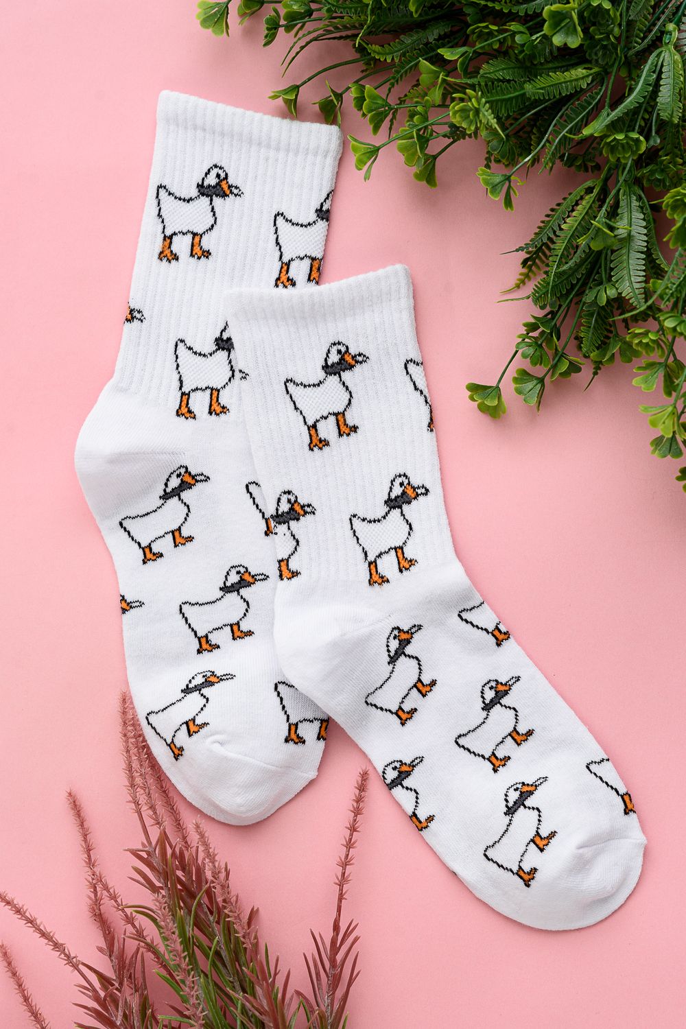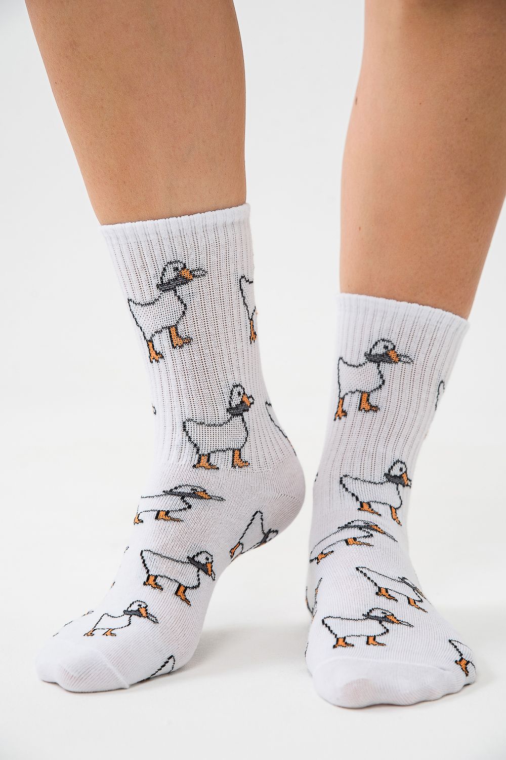 Трендовые носки для женщин. Широкая резинка, по всему носку изображение гусей. В наборе 2 пары.
