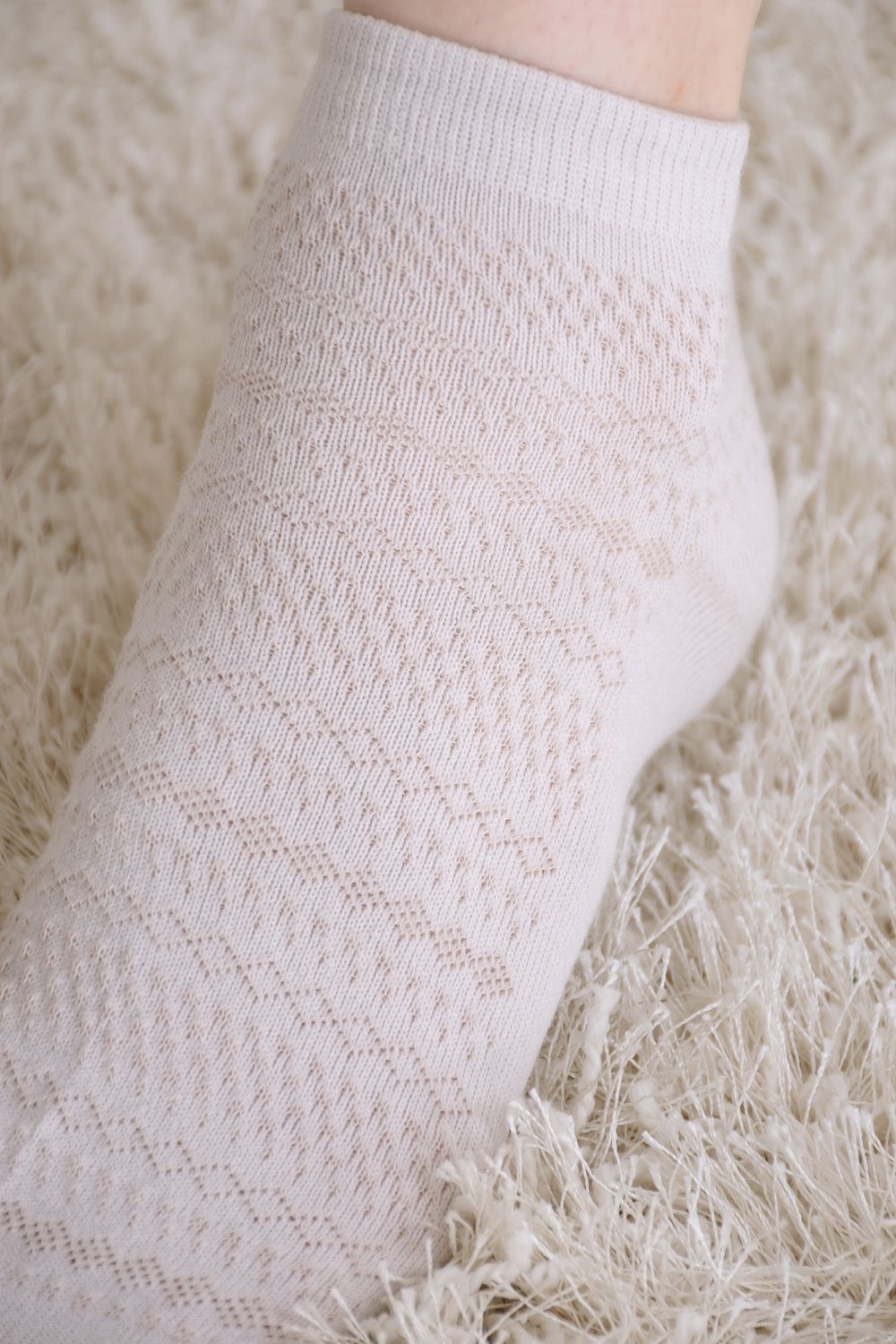 Ажурные женские носочки в спокойных оттенках - бежевом и белом. На резинке, по верху ажурный рисунок, по стопе - гладкие. В упаковке 3 пары одного цвета.
