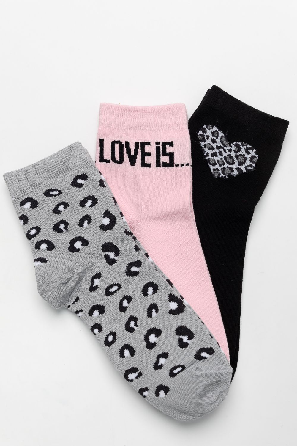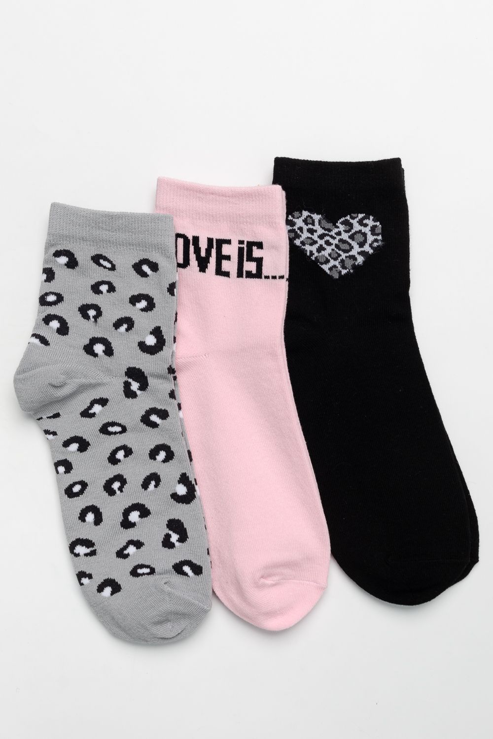 -Набор стильных женских носков. Вставки в модной леопардовой тематике и вывязанная надпись LOVE IS. В упаковке 3 пары. Отличный сувенир на любой праздник - 14 февраля, 8 марта, День рождения и по любому поводу