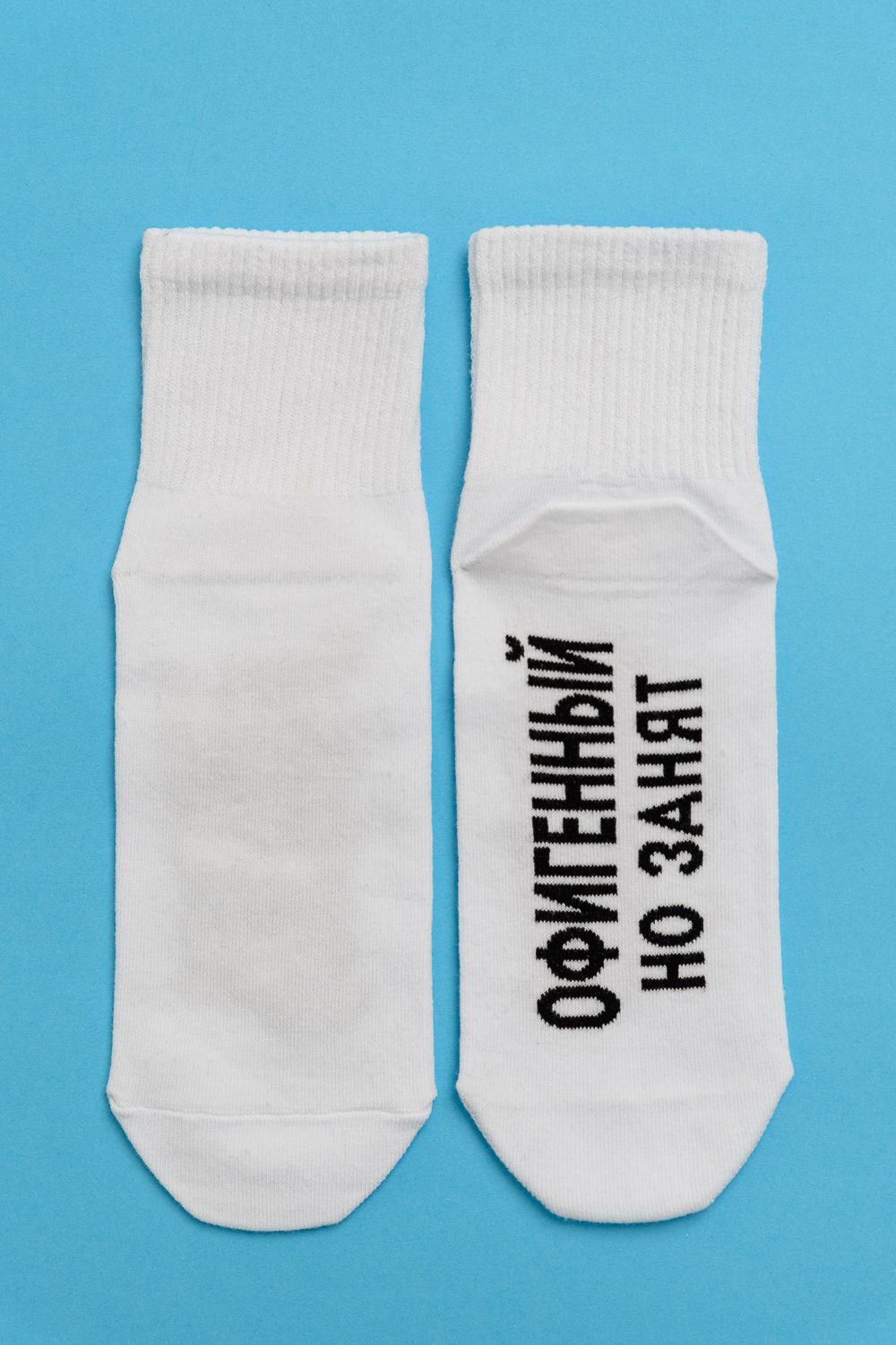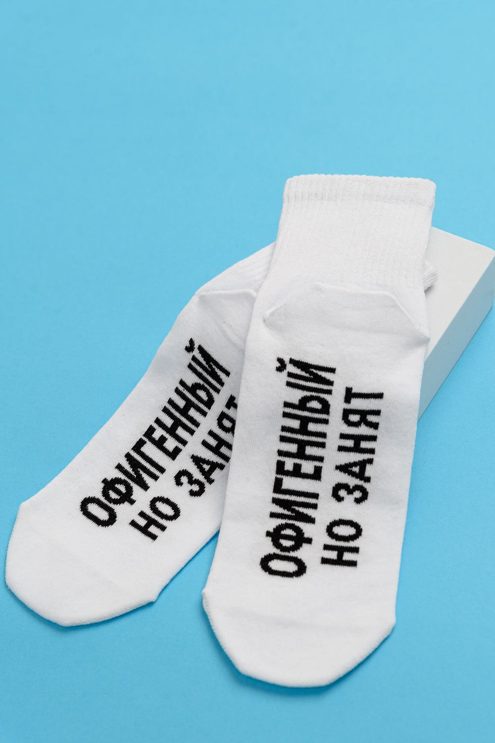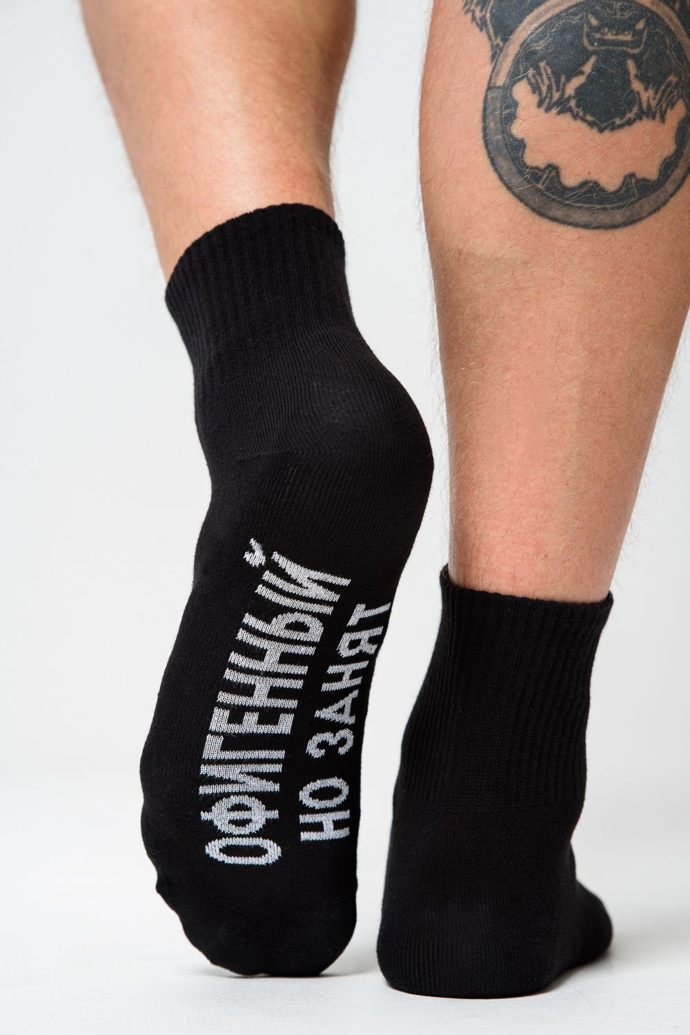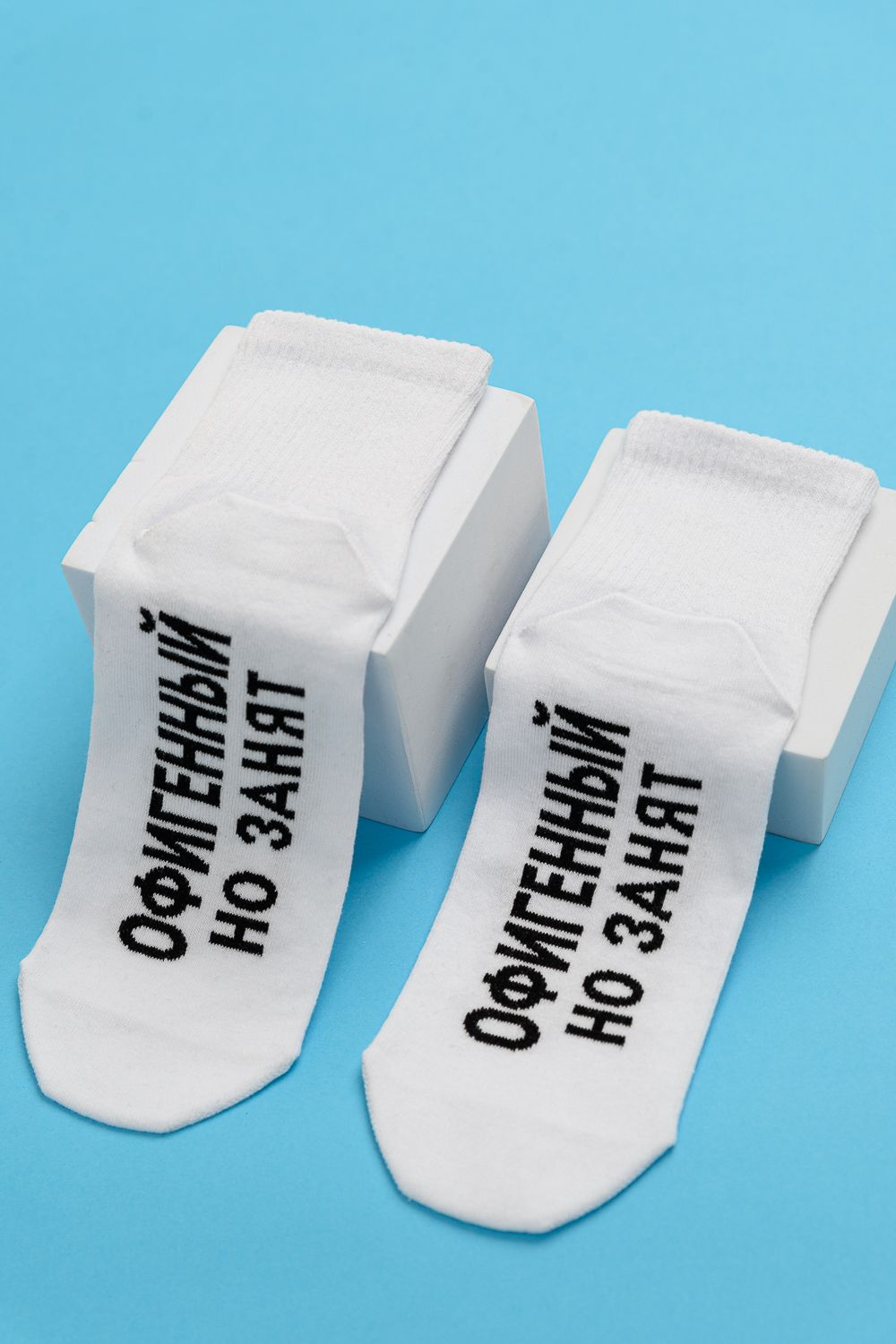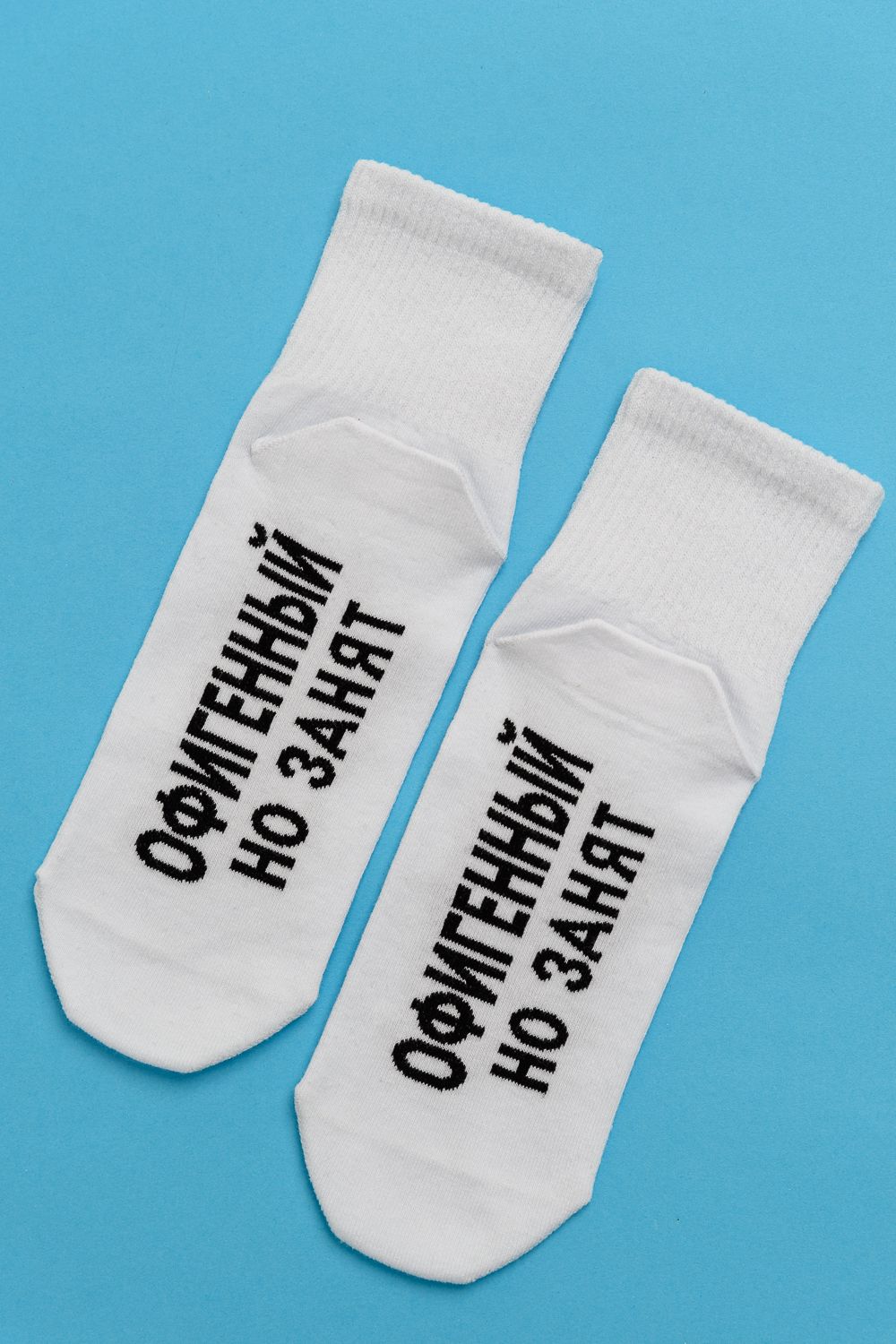 Мужские носки в комплекте 2 пары. Широкая резинка по всей верхней части носка. Надпись на стопе "Офигенный, но занят"