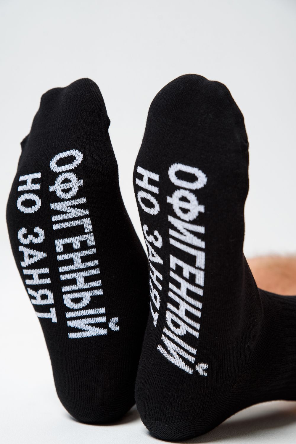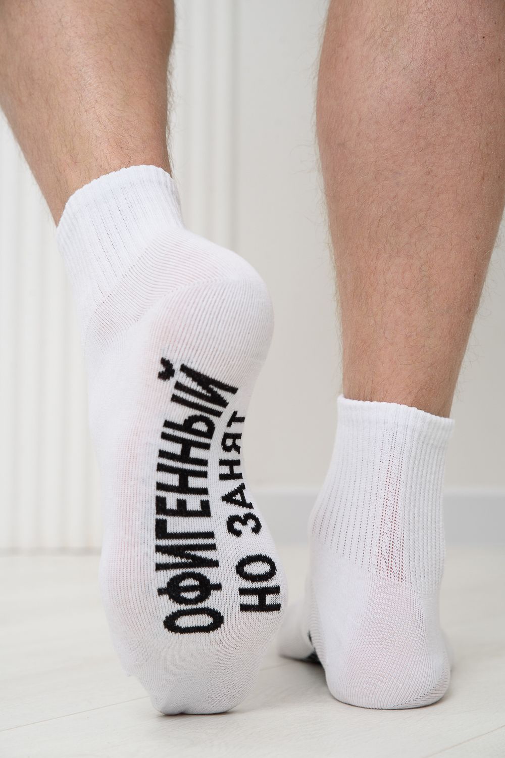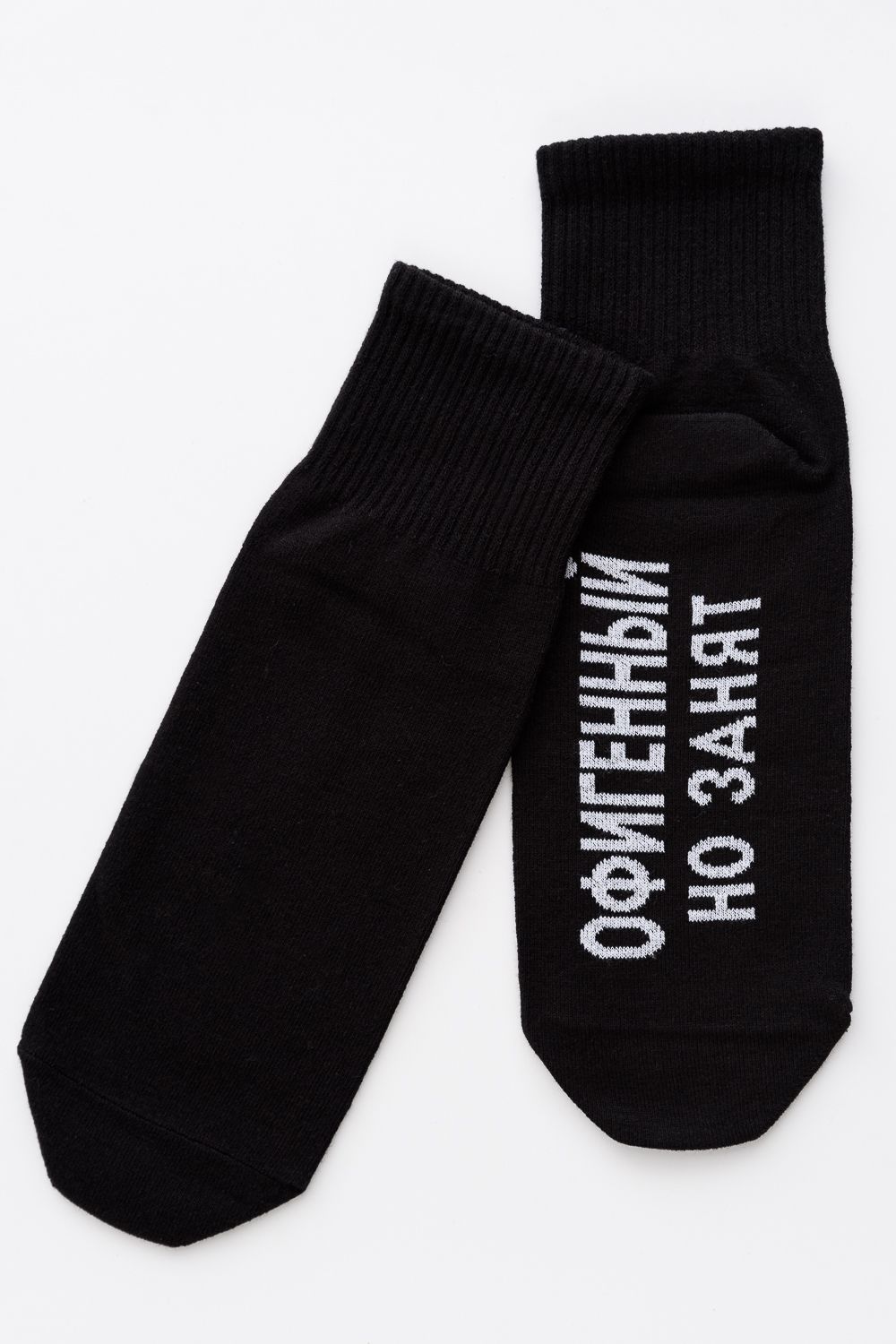 Мужские носки в комплекте 3 пары. Широкая резинка по всей верхней части носка. Надпись на стопе "Офигенный, но занят"