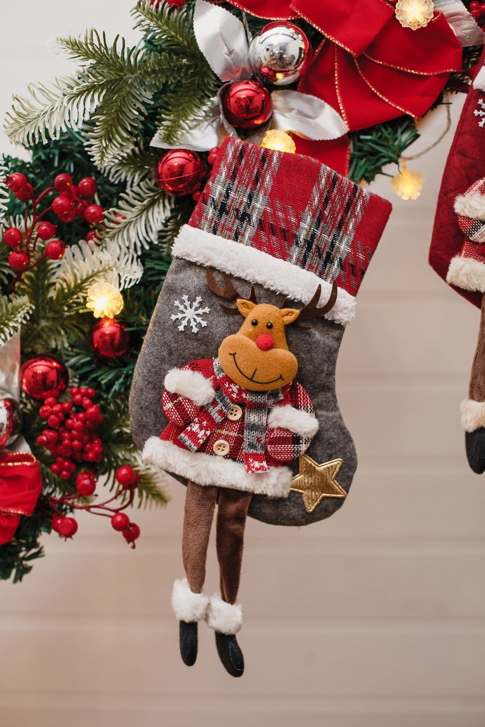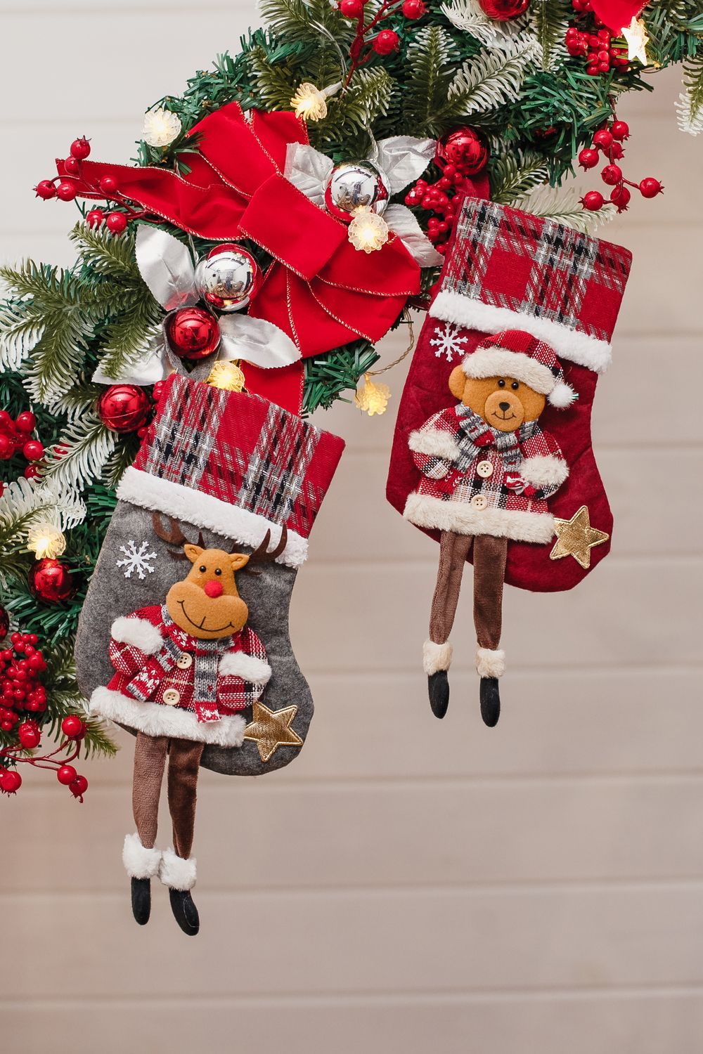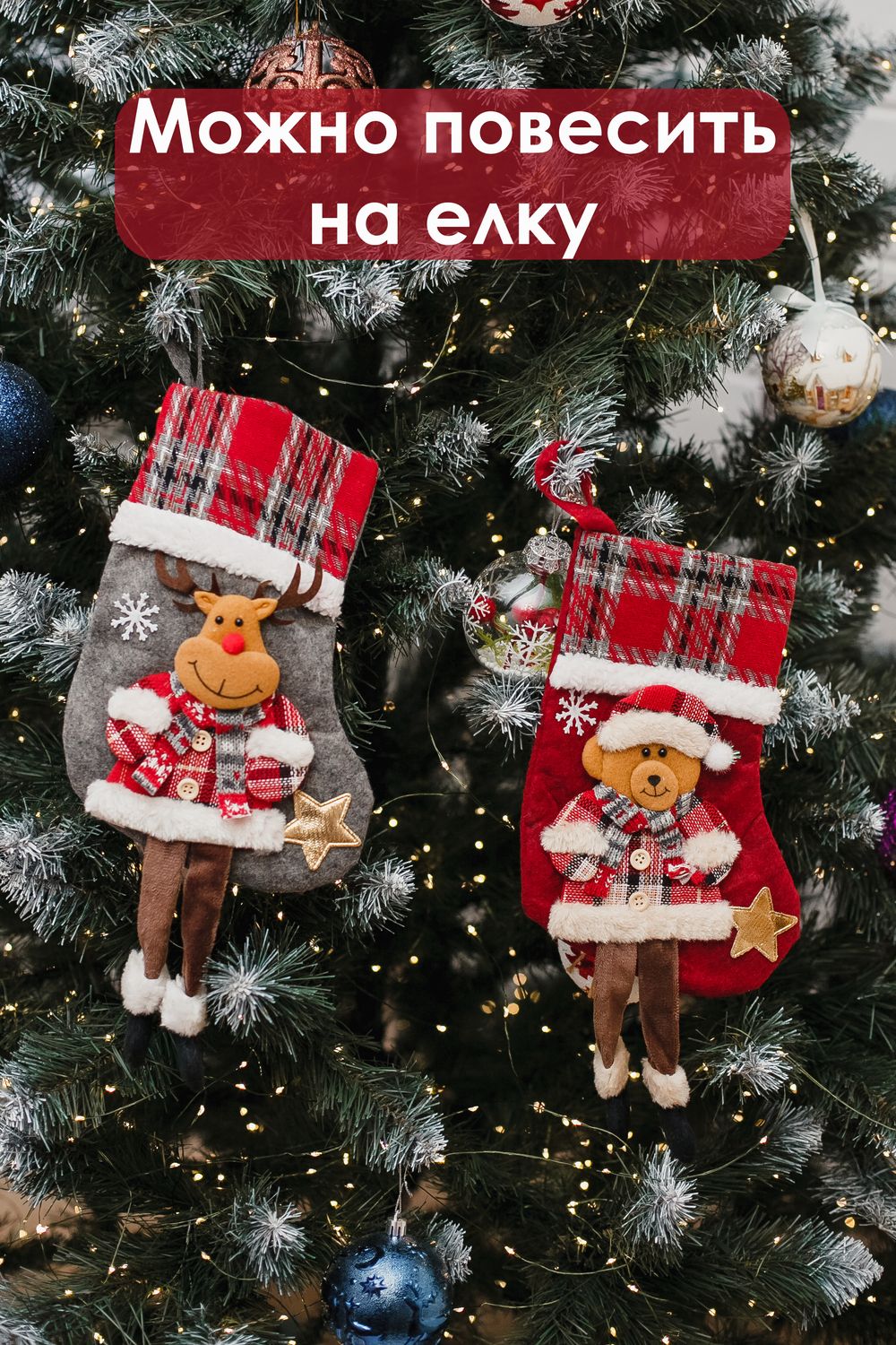 Подарочный носок‑сапожок — это одновременно милый декор и удобная, экологичная упаковка для новогодних презентов. Корпус выполнен из плотной ткани. Аппликация — олень или мишка — вырезана и сшита из фетра, дополнена декоративной строчкой, помпонами и элементами, придающими лицам животных выразительность и объём.