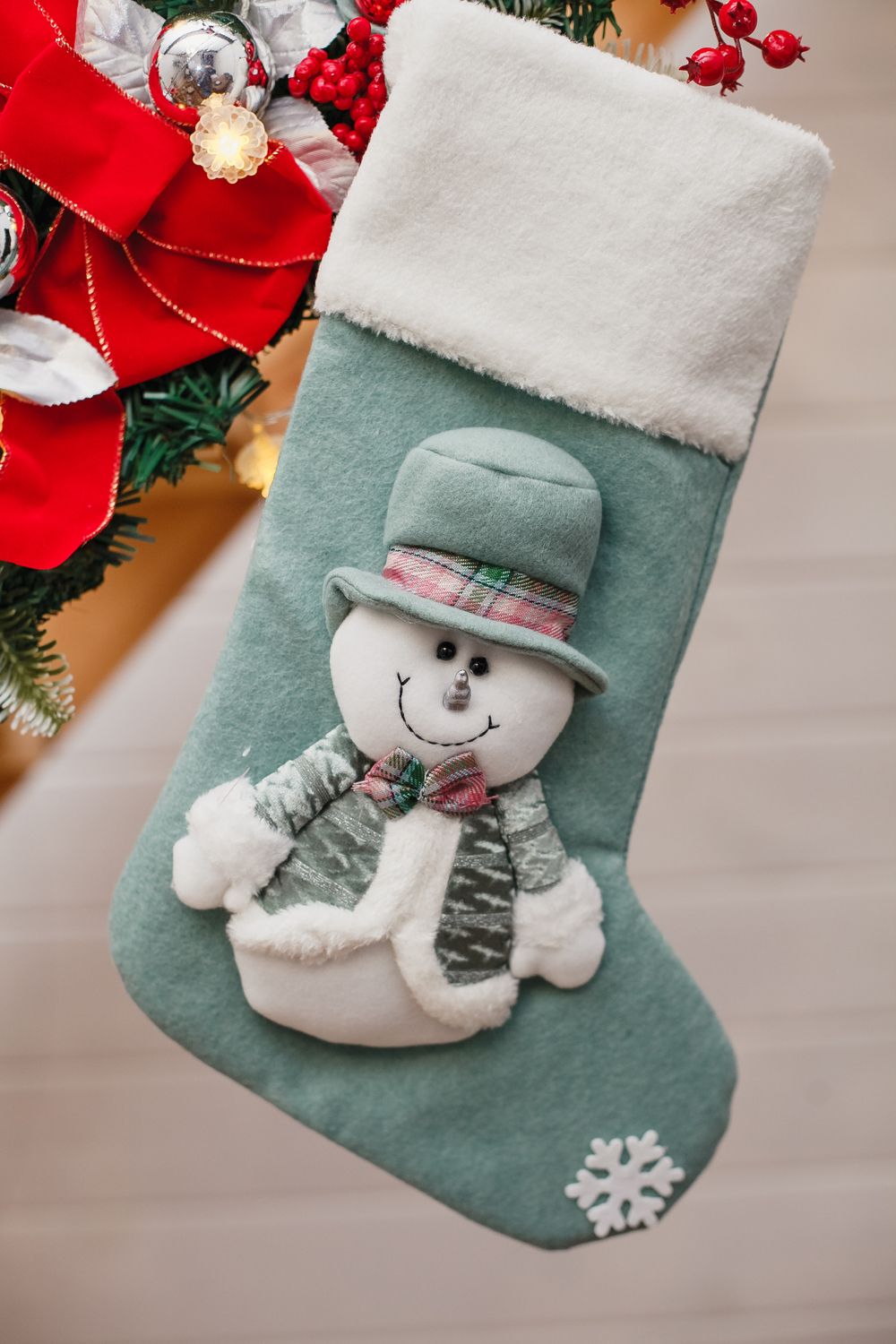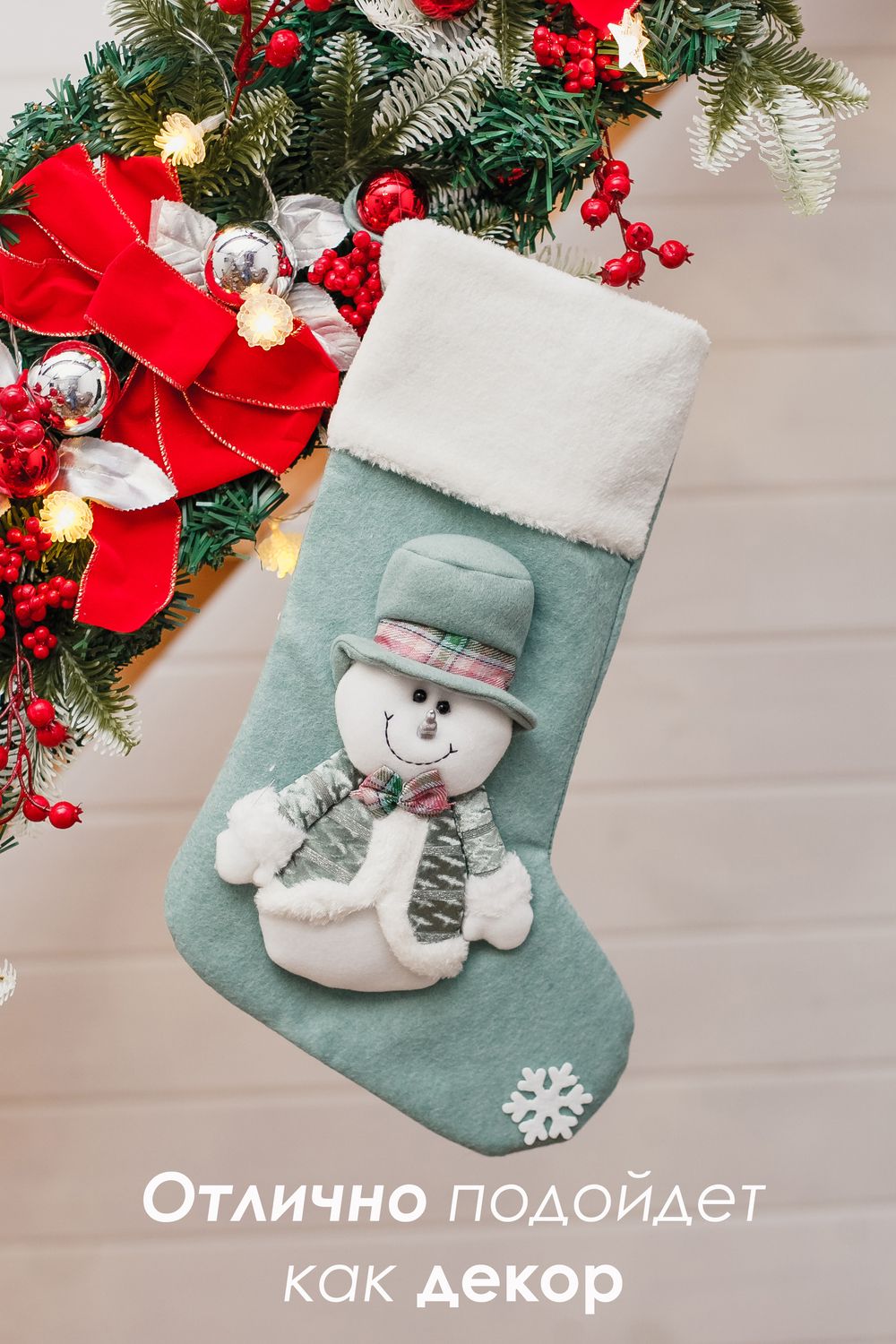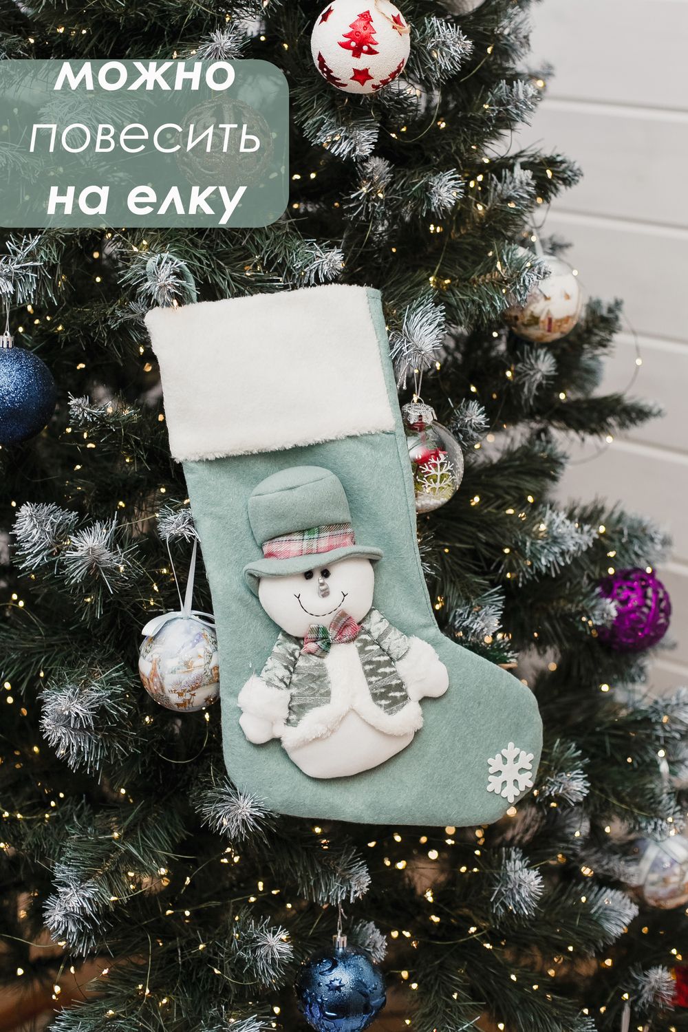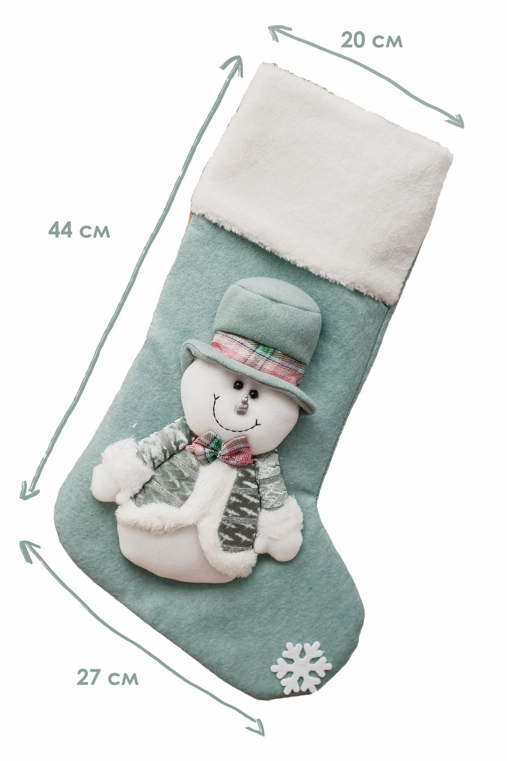 Новогодний носок для подарков зеленый - снеговик