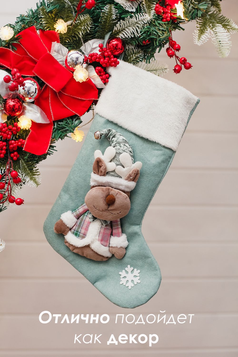 Это отличный выбор для семейной упаковки, корпоративных наборов и тематических подарков. Носок выглядит как самостоятельный подарок. Сапожек новогодний — не просто упаковка: он сам по себе становится частью подарка и может использоваться снова и снова.