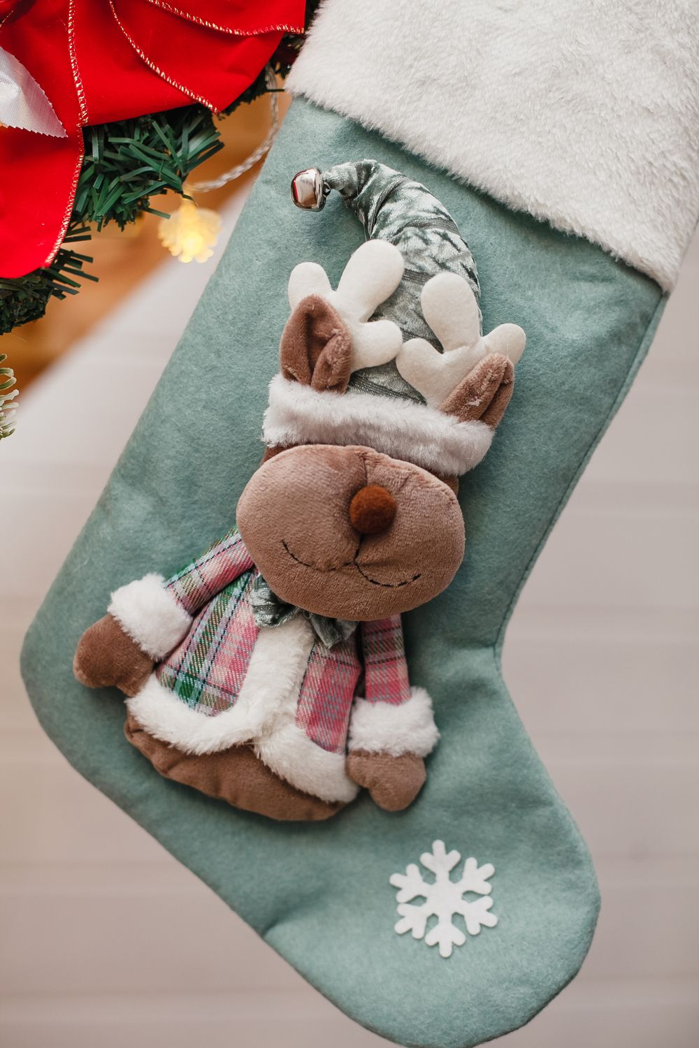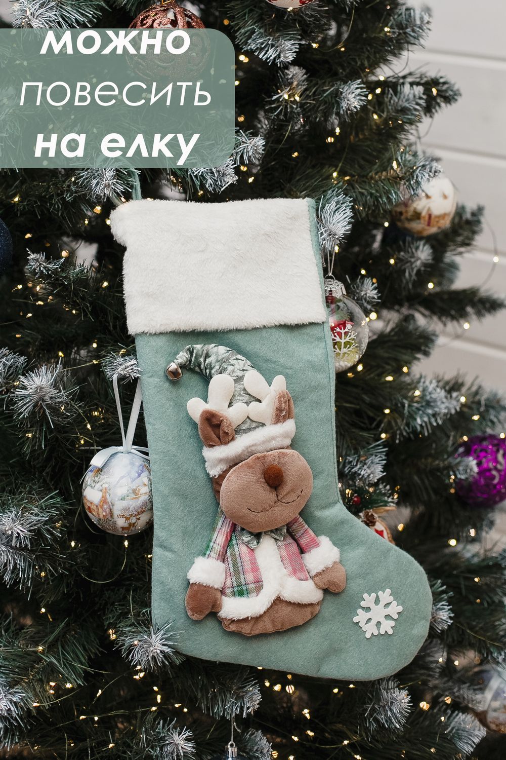 Главная фишка модели — висячие ножки. Ножки добавляют динамики при подвешивании и создают игривый акцент на камине, поручне или ёлке. Верхний край снабжён петлёй для подвеса.