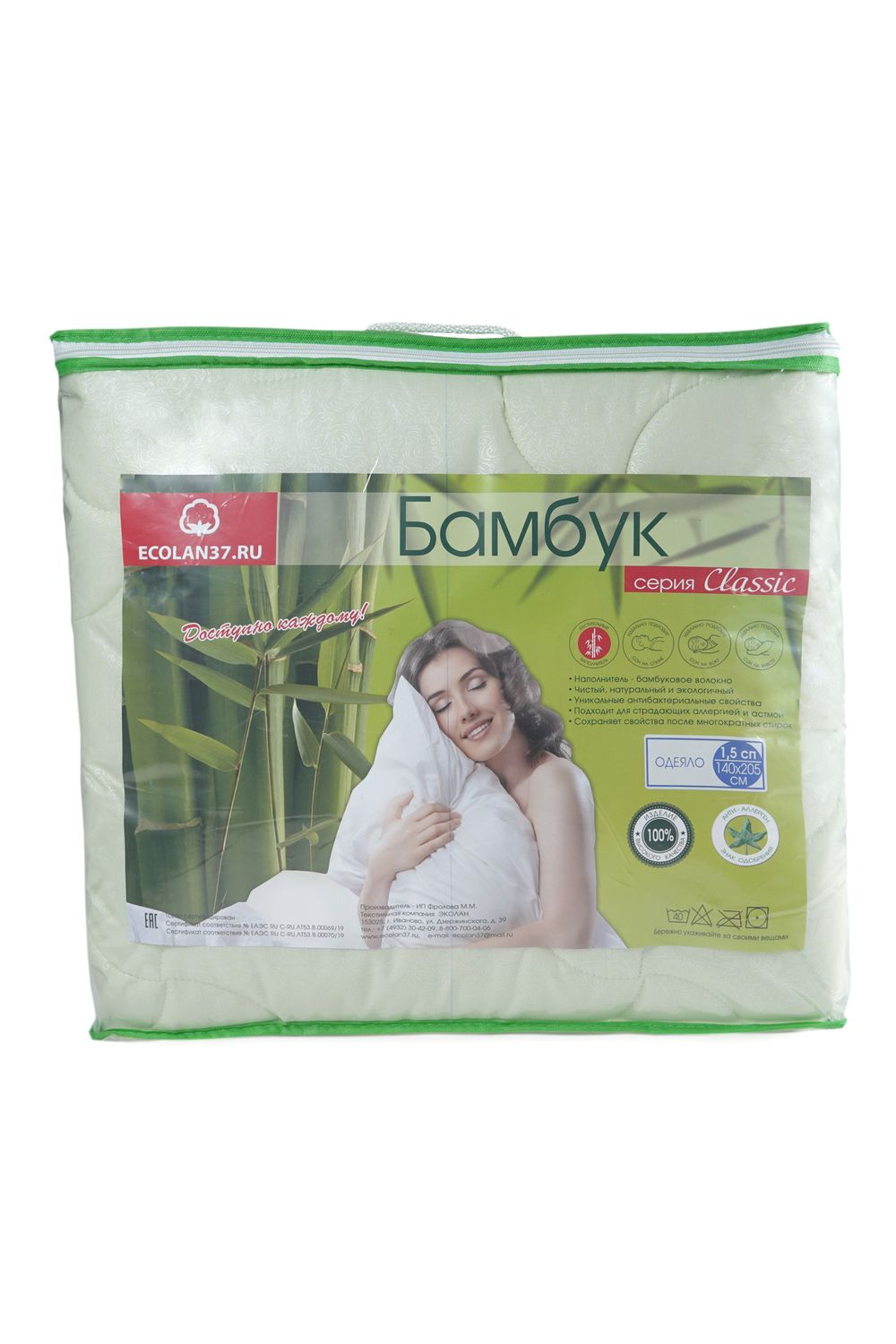Размеры: 1,5сп - 140х205см, 2сп - 170х205см, евро1 - 200х220см, евро2 - 220х240см, ткань - полиэстер, наполнитель - бамбуковое волокно 50%, полиэфирное волокно 50%, плотность - 300гр/м, упаковка - чемодан на молнии