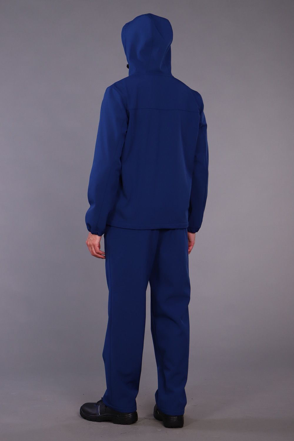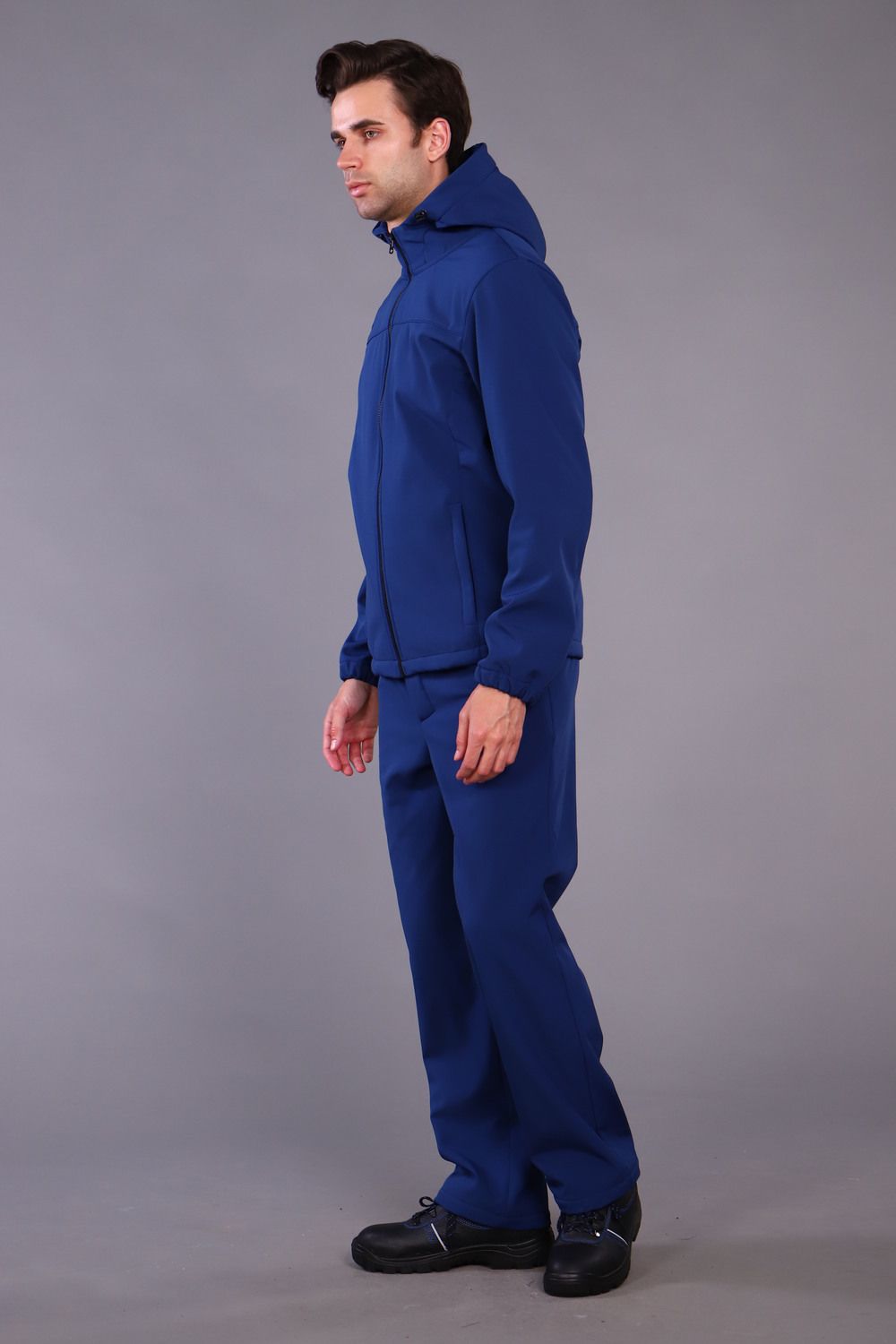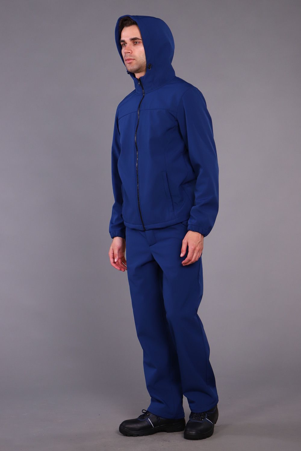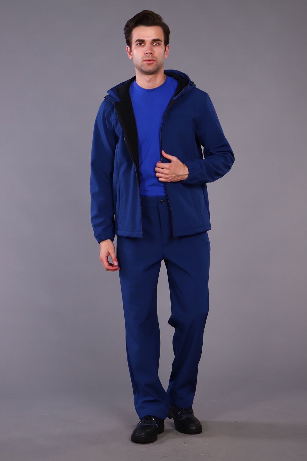 Куртка прямого силуэта, с центральной бортовой застёжкой на молнию, с притачным поясом. Карманы накладные с наклонной линией входа, рукава втачные на манжетах, капюшон на кулисе. Брюки с застежкой на пуговицу, пояс брюк имеет эластичные резинки по бокам для удобной посадки. Так же на брюках два кармана с косым входом. Костюм выполнен из ткани Софтшелл имеет хорошие водоотталкивающие свойства, внутренний слой ткани флисовый. Благодаря флисовому слою костюм очень теплый и комфортный. Температурный режим от + 5 до +20 градусов цельсия.