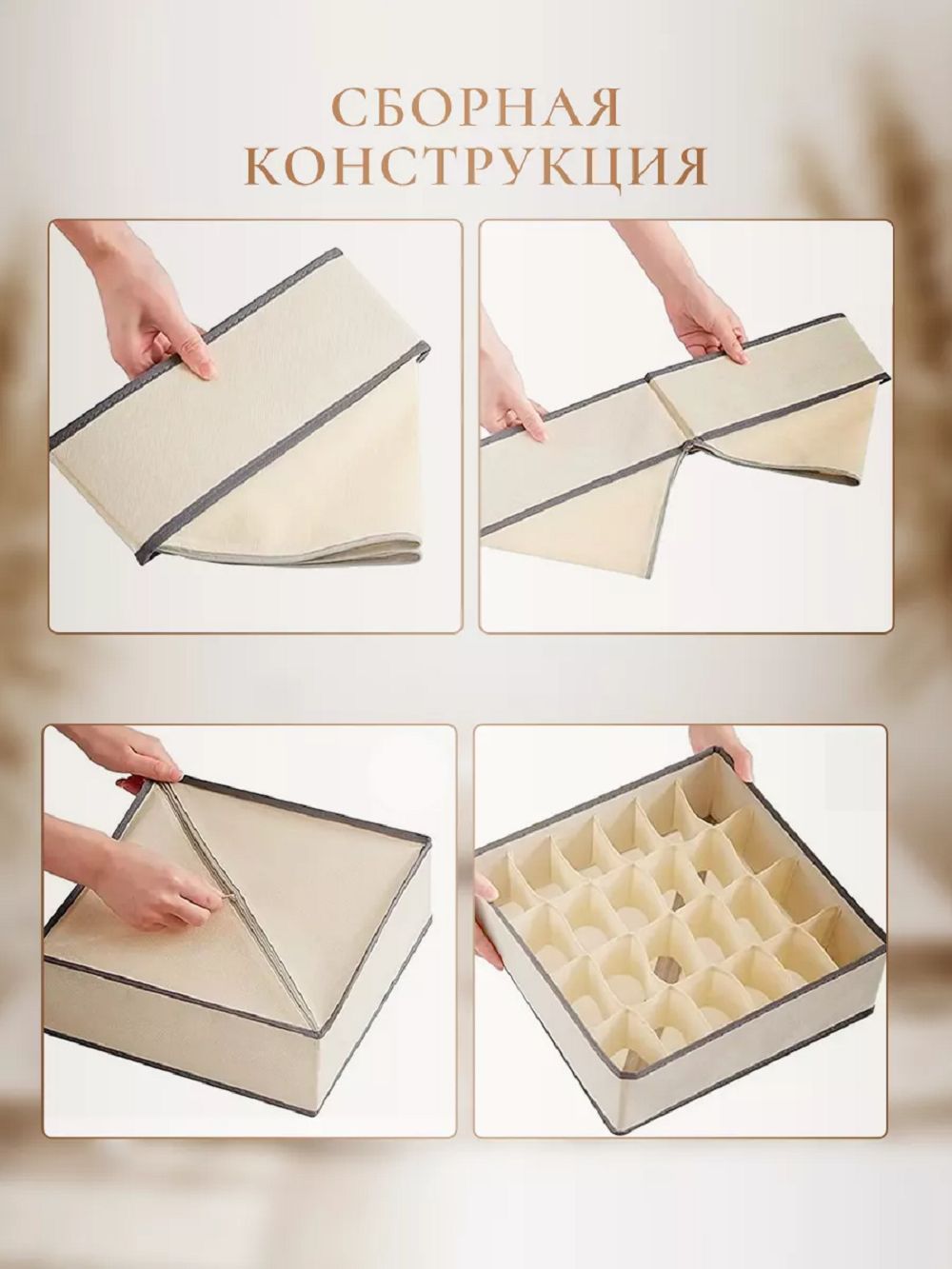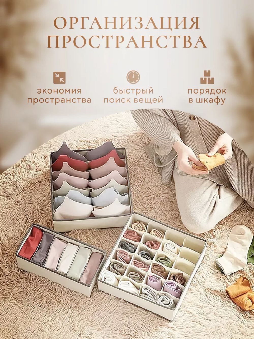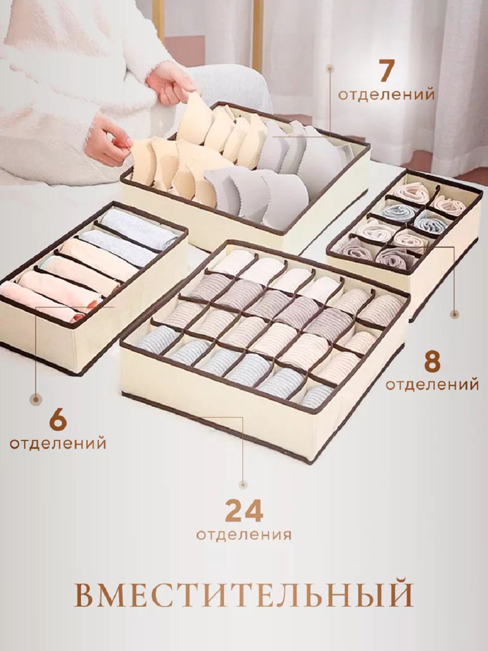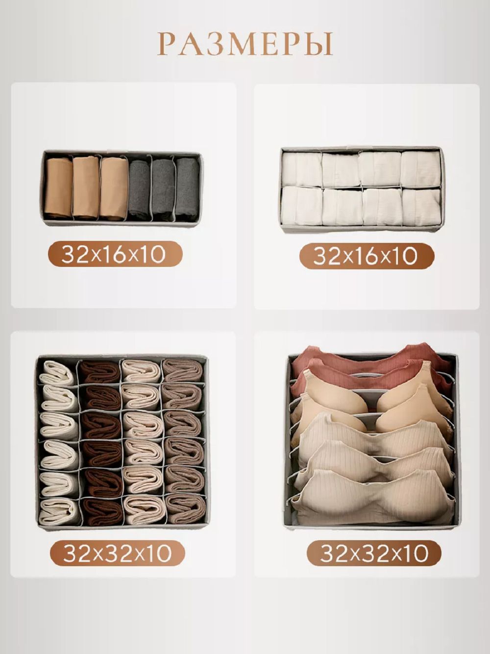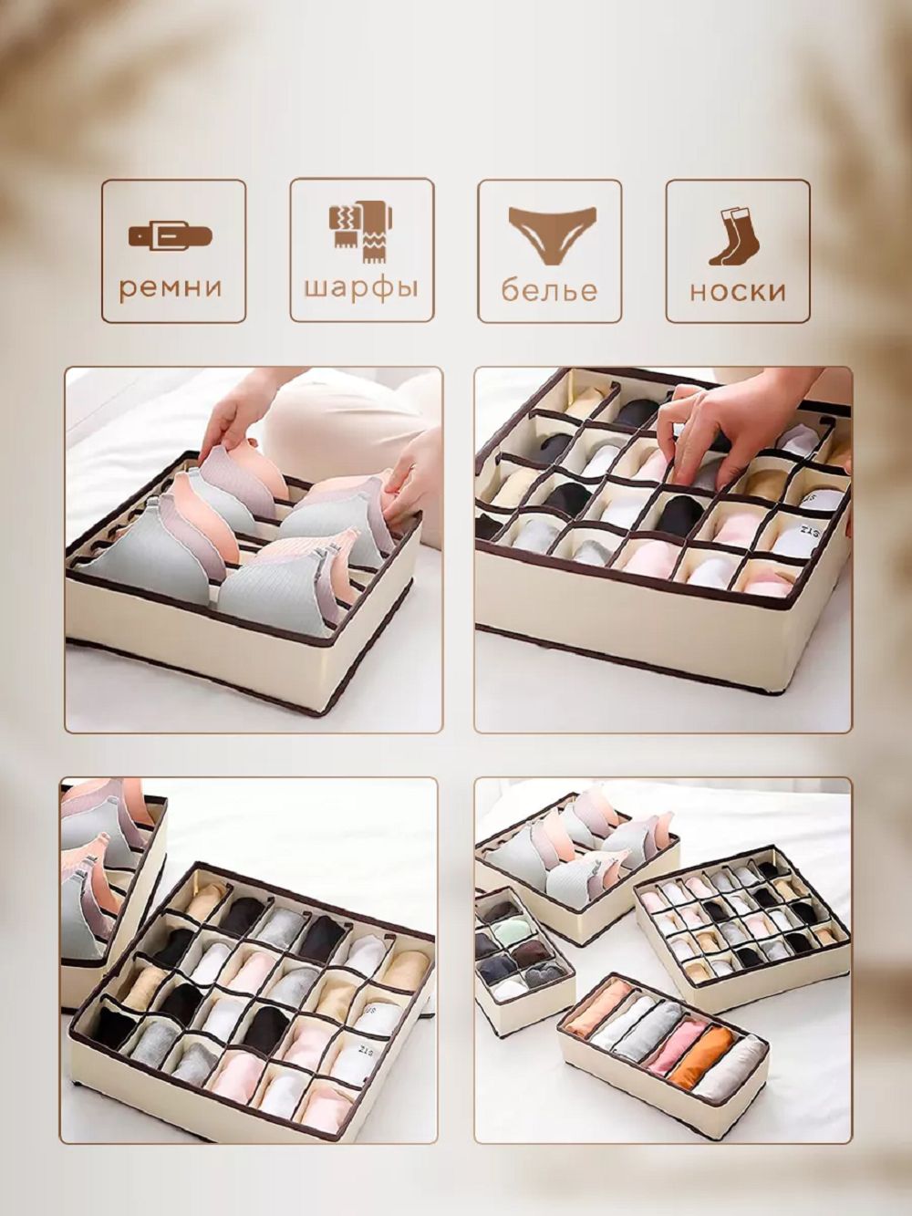 Набор, состоящий из 4 шт текстильных органайзеров для хранения белья разных цветов, незаменим для организации пространства в вашем шкафу или в ящиках комода. Разные по размеру кофры с перегородками имеют удобные и компактные ячейки. С этими кейсами вы сможете легко рассортировать свои вещи и аксессуары, а также украшения и разные мелочи по отдельным секциям. Ящички идеально подойдут для хранения носков, детских вещей или мелких предметов. Мягкий и складной дизайн делает их удобными не только для использования дома, но и для путешествий. Они прекрасно помещаются в дорожной сумке при транспортировке и помогают создать порядок и домашний уют в любом месте - в квартире, на даче или в туристической поездке. Универсальные тканевые чехлы можно использовать в спальне или ванной, на полке в шкафчике в гардеробной или в прихожей. Каждый маленький и большой отсек удобен для хранения нижнего белья, например бюстгальтеров или лифчиков, мужских, женских и детских трусов и других предметов одежды ребенка.