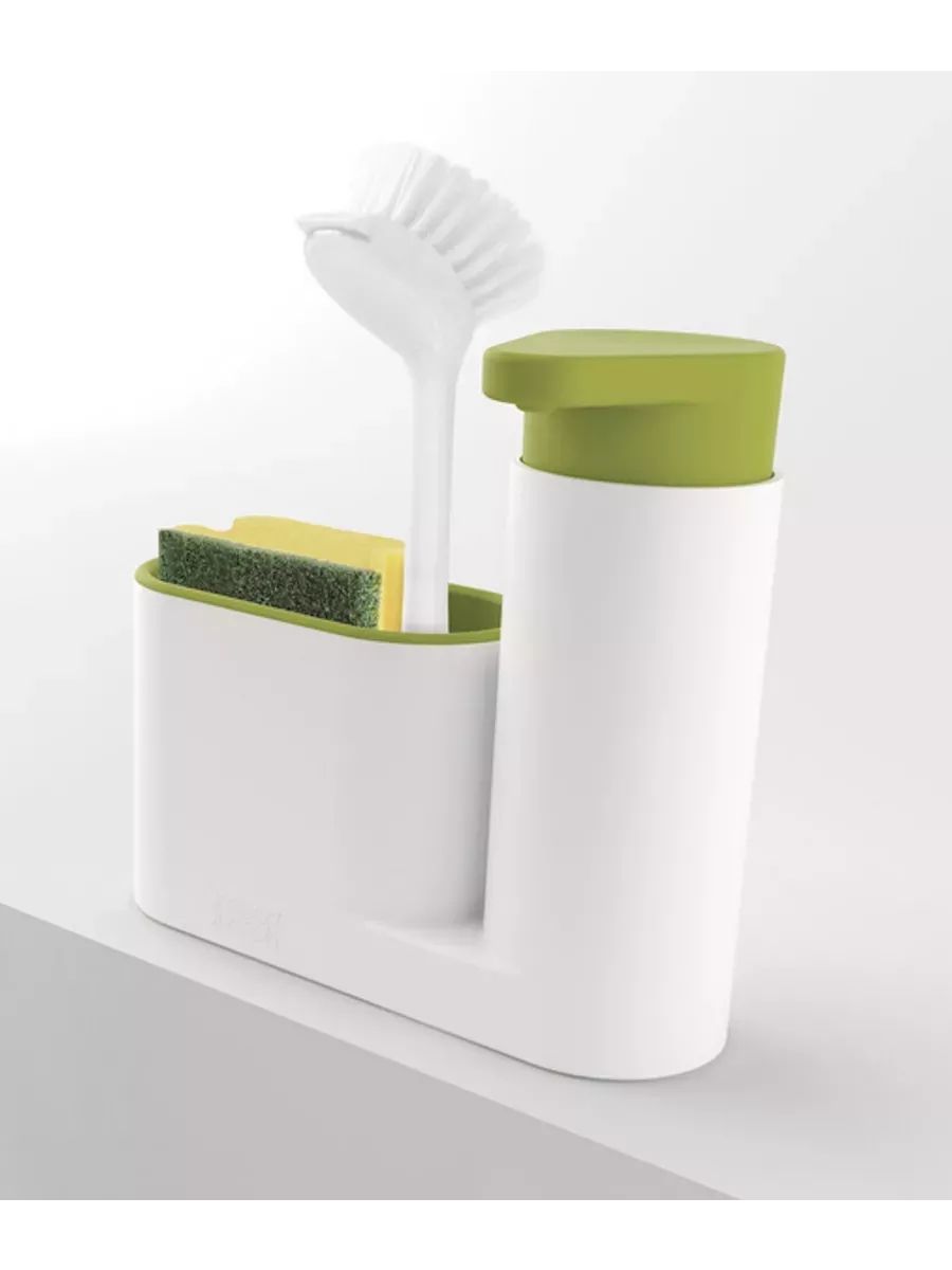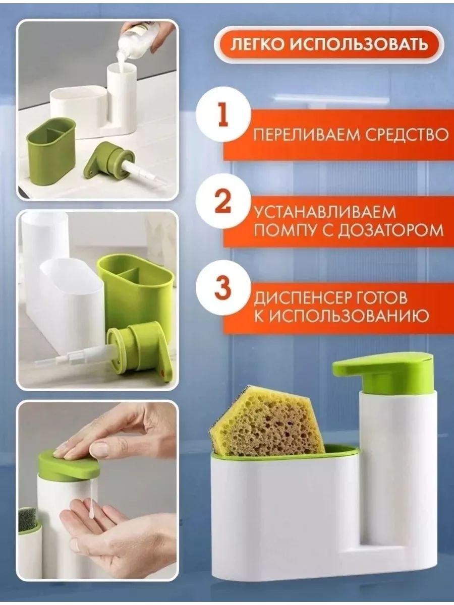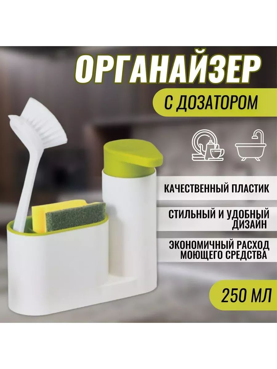 Представленный органайзер с дозатором включает в себя подставку, на которой размещаются ёмкость с диспенсером для жидкого моющего или уходового средства объемом 250 мл и съемный стакан для хранения с двумя отделами. Подойдет для ванной комнаты, для кухни, для бани. Органайзер компактный, но вместительный. В съёмные стаканы легко помещается все необходимое