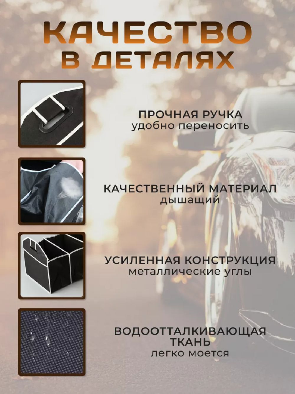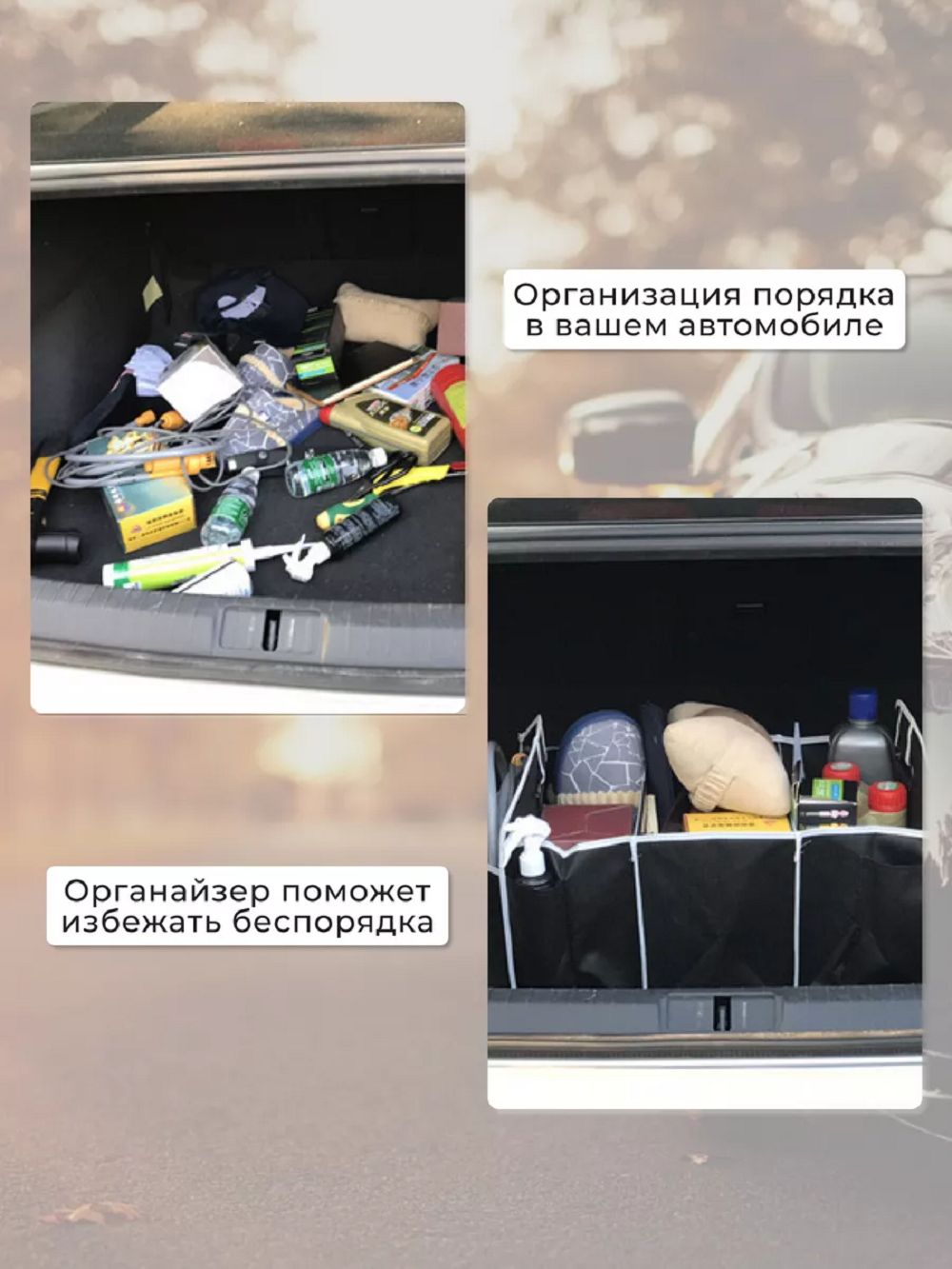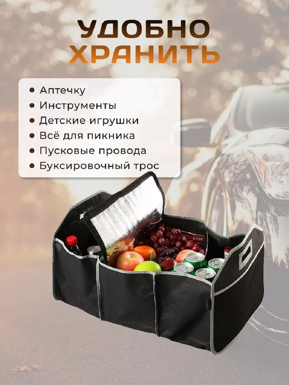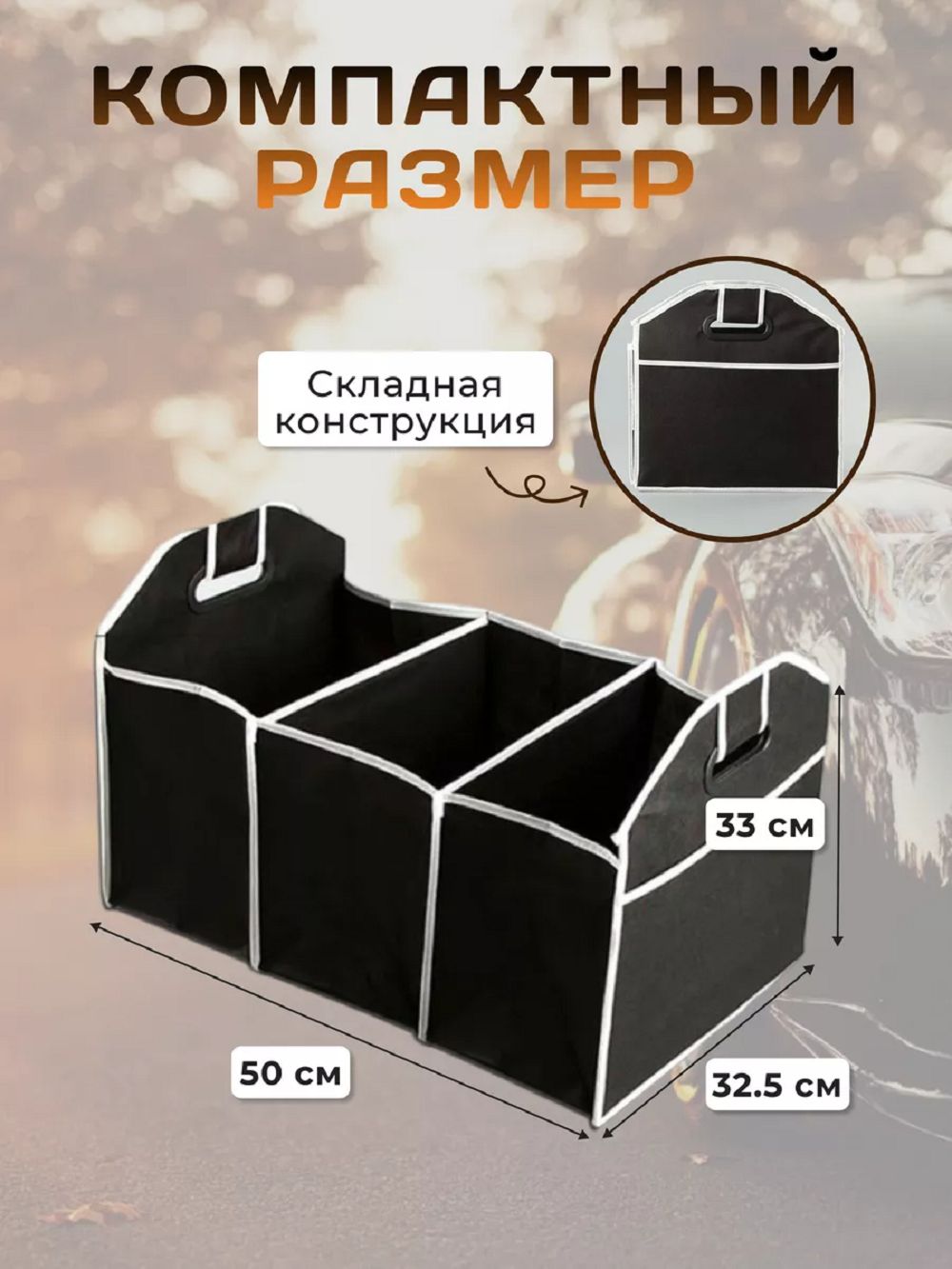 Практичная сумка органайзер для автомобиля! Вместительная сумка для багажника поможет сэкономить место и навести порядок в Вашем авто. Автомобильные аксессуары больше не разлетятся по багажнику во время поездки. Для удобства переноса органайзер оснащен прочной ручкой. Габариты сумки 50 х 32 см, а объем - 40 литров, поэтому в него поместятся необходимые в машине инструменты и другое. Благодаря своей конструкции и усиленным металлическим углам органайзер в багажник складной прослужит долгие годы, изготовлен из качественного материала, его можно протирать влажной салфеткой или губкой.