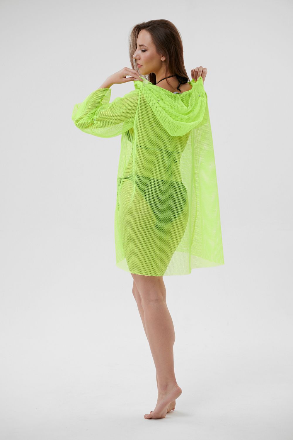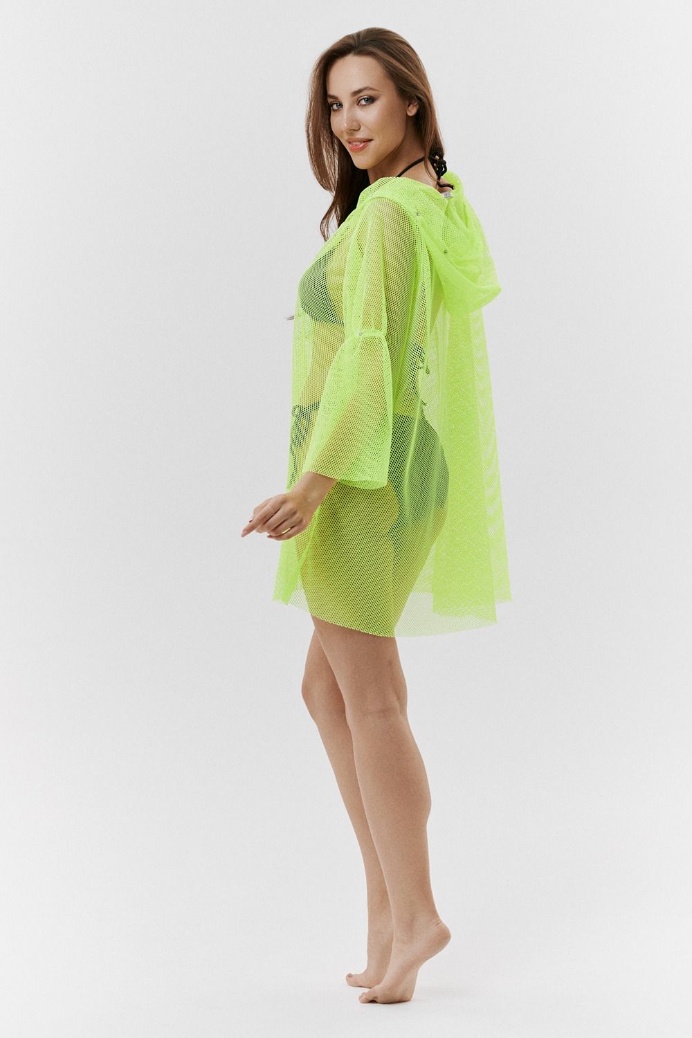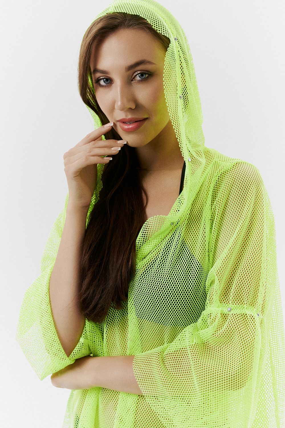 Туника женская пляжная, свободного силуэта, с капюшоном и длинным рукавом. Декорирована хальнитенами.