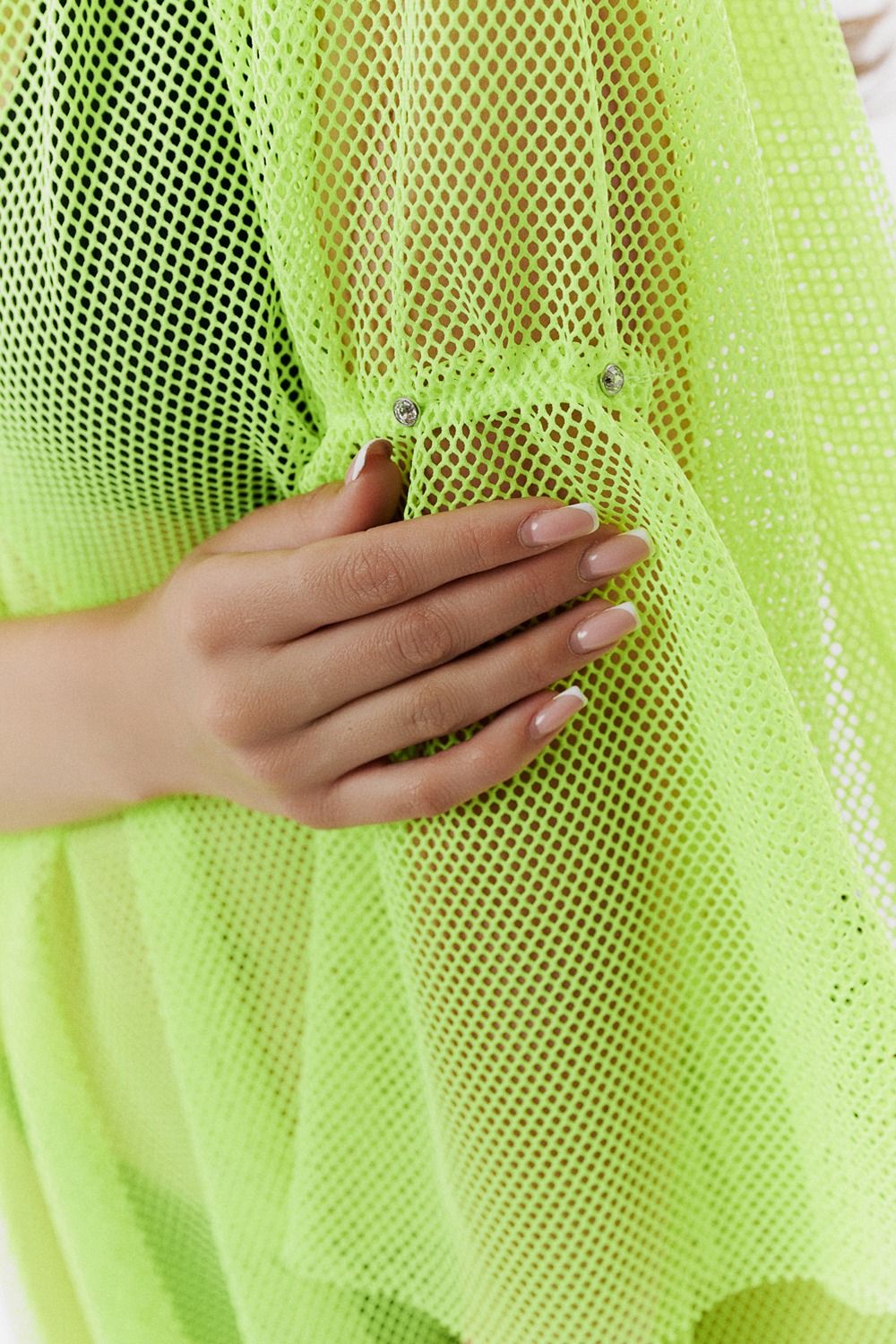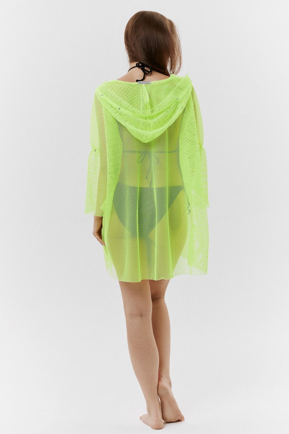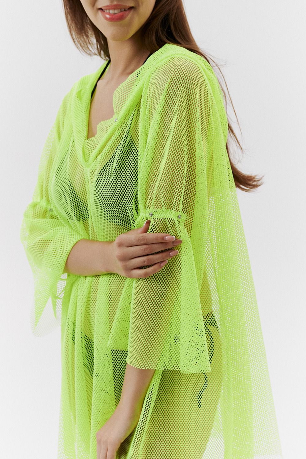 Туника женская пляжная, свободного силуэта, с капюшоном и длинным рукавом. Декорирована хальнитенами.