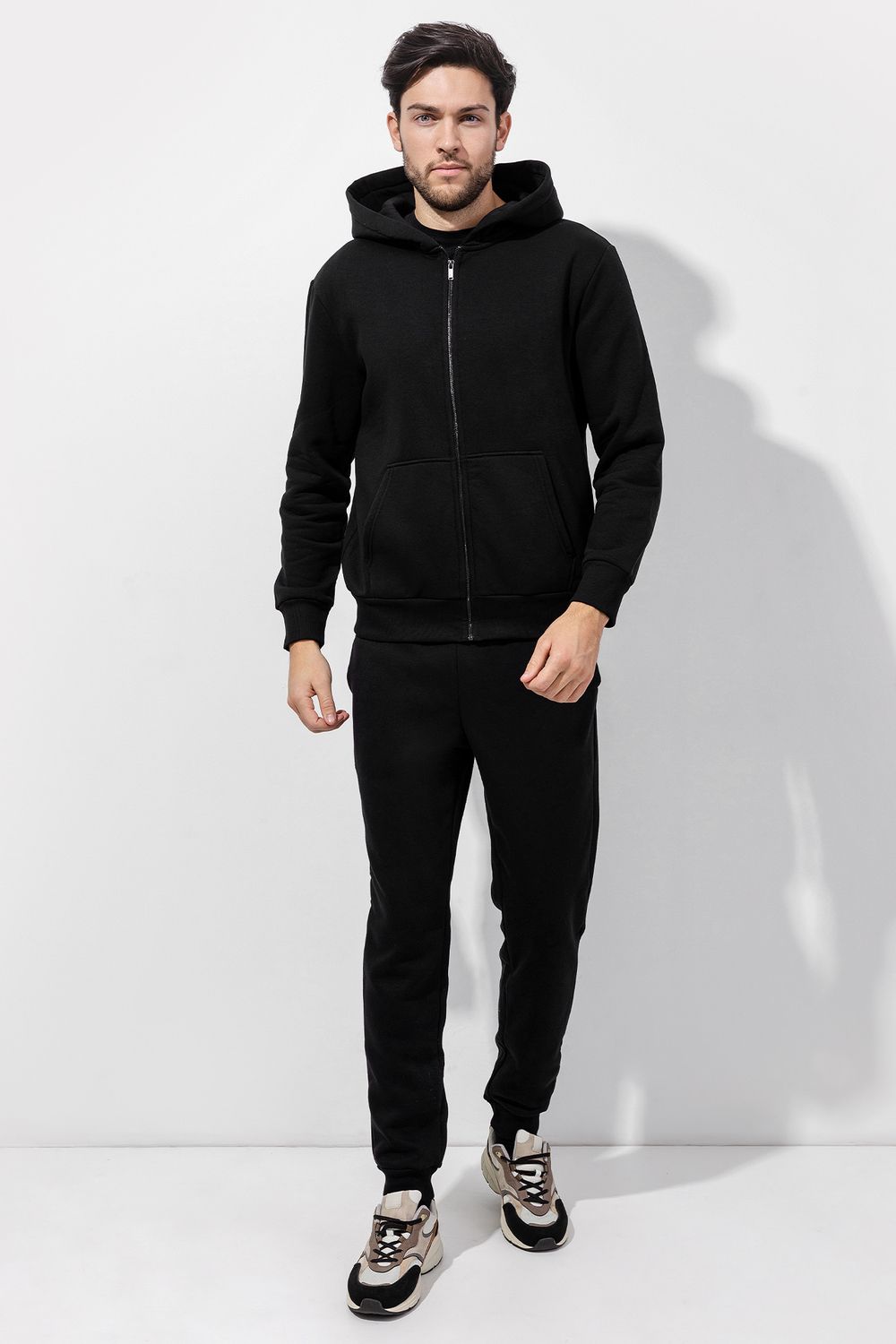 Стильные мужские брюки-джоггеры из трикотажного футера с теплым подчесом. Силуэт зауженный, штанины с манжетами. Есть удобные боковые карманы. В поясе – эластичная тесьма и шнурок-затяжка. Просто, комфортно, актуально!