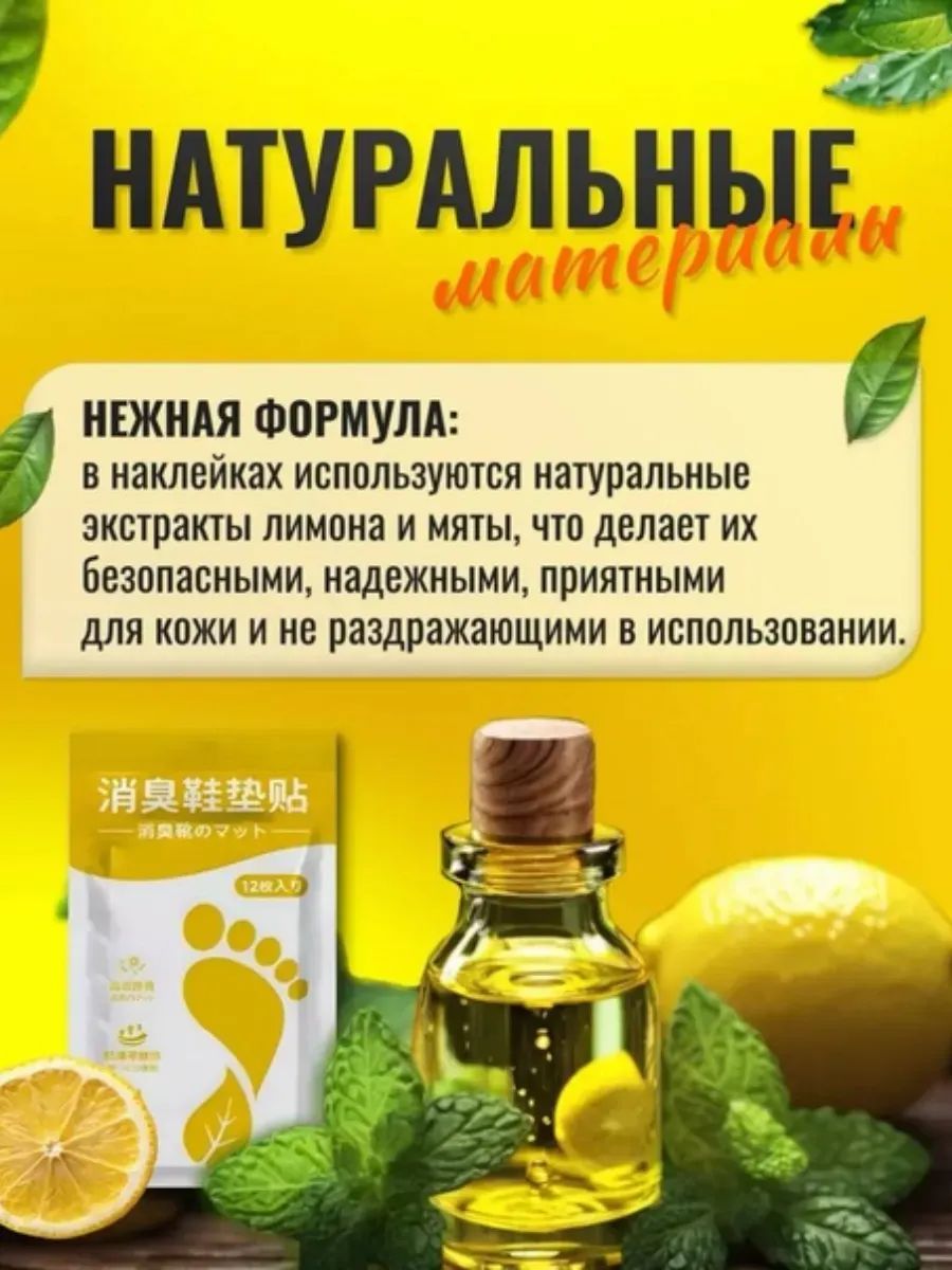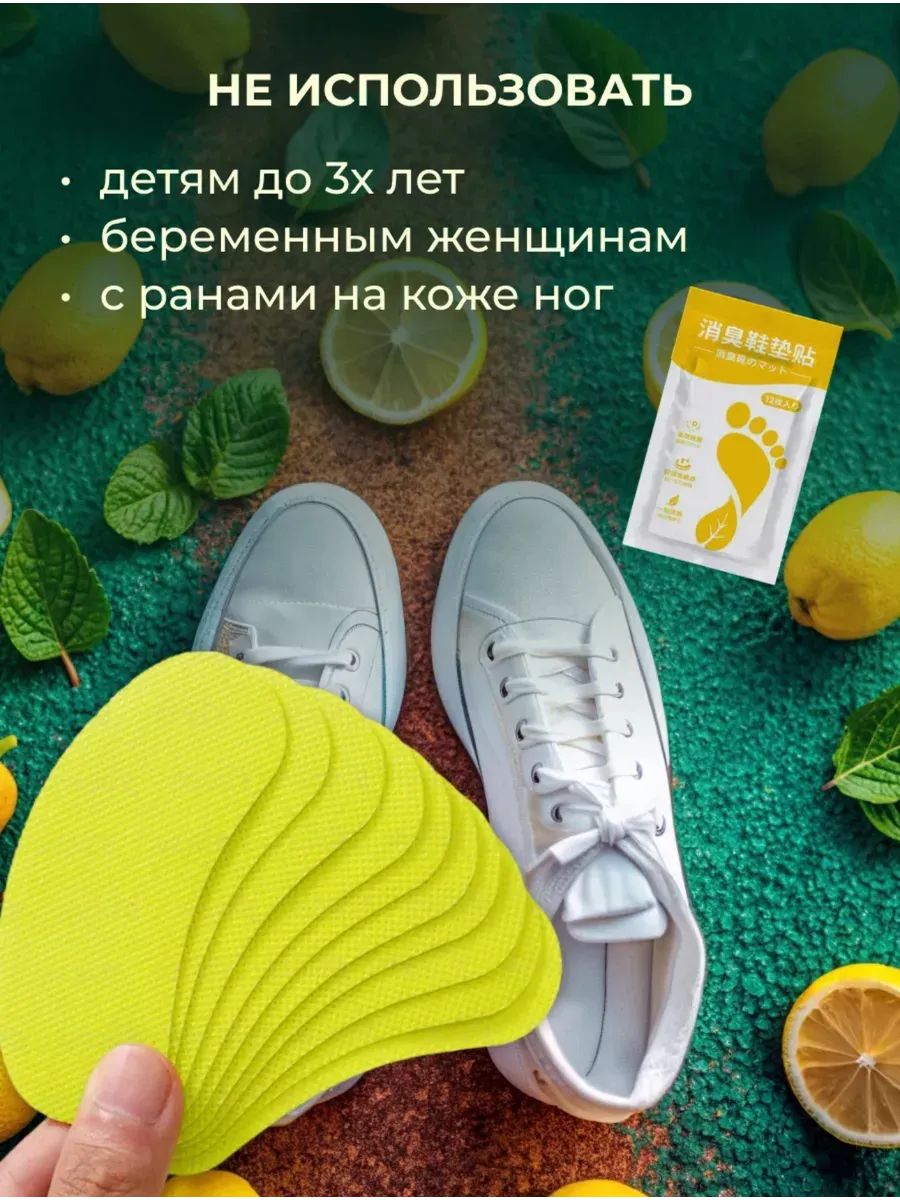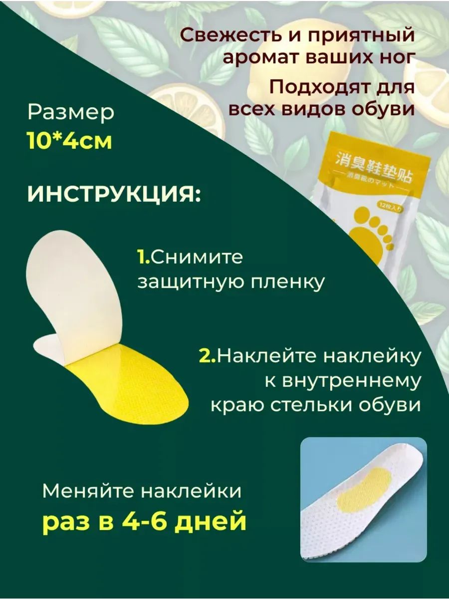 Патчи для обуви - это эффективное решение проблемы неприятного запаха ног. Наклейки, содержащие антиперспирантные вкладыши, которые легко крепятся на внутреннюю часть стельки. Обеспечивают длительную защиту от пота и неприятных ощущений. Благодаря уникальной формуле стика, дезодорант легко наклеивается внутрь oбуви и остается незаметным. В отличии от спрей Тимурова не оставляют следов на носках. Ароманаклейки антизапах предназначены как для мужчин, так и для женщин, идеально подходят для активного образа жизни. Специальные ароматические накладки эффективно защищают от повышенного потоотделения и помогают поддерживать ощущение свежести на протяжении 4-6 дней. Парфюмированный аромат сделают вашу обувь свежей и приятной на протяжении всего дня. Наш освежитель со временем снижает потоотделение работает как антисептик для ног. Набор патчей 12 штук. Наш ароматизатор обеспечат надежную защиту от запаха и бактерий, не повреждая материалы стельки. Попробуйте наши аксессуары с ароматом лимона - и ваша обувь всегда будет свежей и приятной! Благодаря маленьким размерам пачей их легко можно брать с собой в дорогу. Незаменимый помощник для спортсменов, офисных работников и всех, кто ценит комфорт и свежесть.