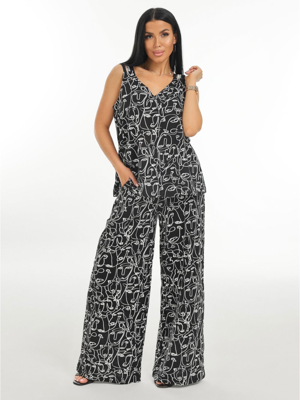 Классический домашний комплект для дома двойка от бренда lovetex.store Российского производства с яркими и уникальными принтами, рисунками. Состоит из широких брюк палаццо с высокой посадкой и футболки с рукавом три четверти. Удобные брюки на резинке на талии не стеснят движения даже во время активной игры с ребенком, а майка свободного кроя скроет недостатки фигуры. Женский домашний костюм выполнен из качественного и мягкого 100 % хлопка, что позволяет коже дышать, поэтому в нем комфортно заниматься бытом, спать и встречаться с близкими на домашних вечерах. Пижамный оверсайз (oversize) костюм отлично подойдёт девочкам, девушкам, женщинам и бабушкам, за счёт широкой размерной сетки. Среди покупателей часто встречаются беременные, кормящие и будущие мамы, потому что хлопковая пижама это забота о себе и своём комфорте! В нашем комплекте вы сможете чувствовать себя красивой, сексуальной, современной. Есть модель на выбор с футболкой с коротким рукавом и с укороченными брючками бриджи Хилари. Выбирайте с учетом личных предпочтений и уровня терморегуляции. Любителям оверсайз пижамы рекомендуем примерить размер побольше.
