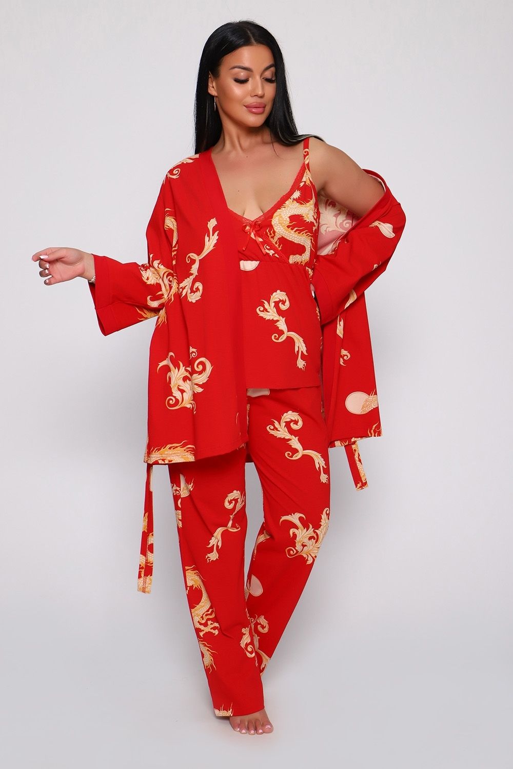 Элементы: Включает три предмета: топ на бретелях с кружевной отделкой, свободные брюки и халат с рукавом 3/4.