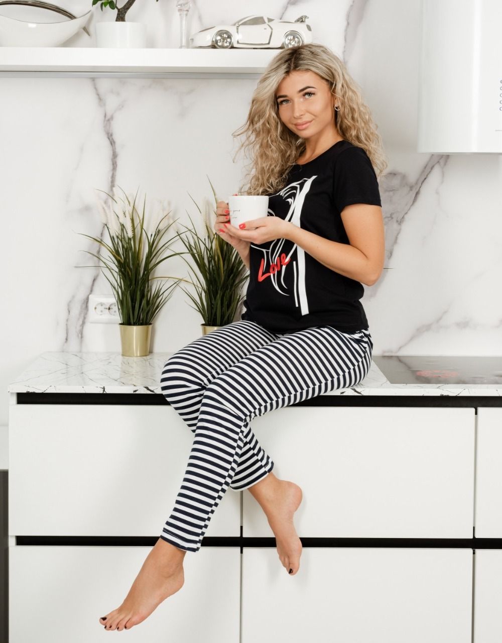 Пижама женская с брюками. Выполнена из натурального хлопка. Футболка украшена стильным принтом. Брюки в данной модели имеет полуприлегающий покрой и удачно подчеркивают достоинства фигуры. Выполнена из натурального хлопка, дизайн - всегда актуальная полоса, расположенная по длине изделия, визуально удлиняет и придает стройность фигуре.