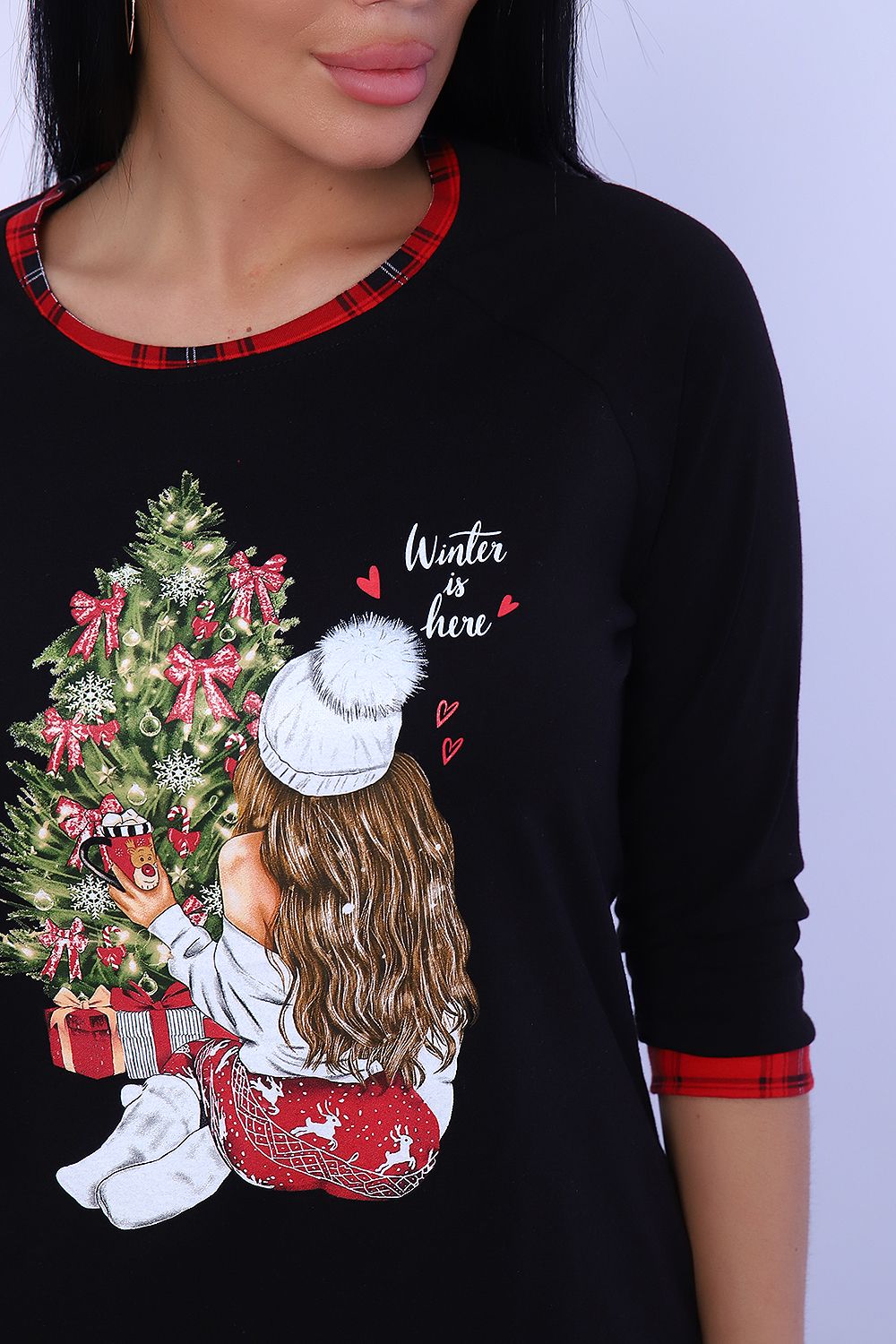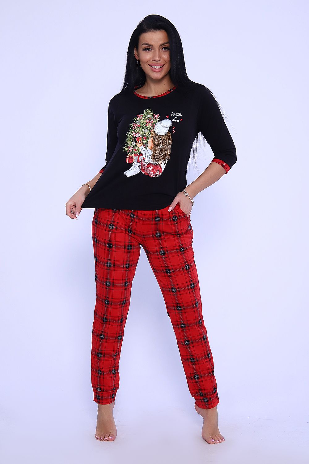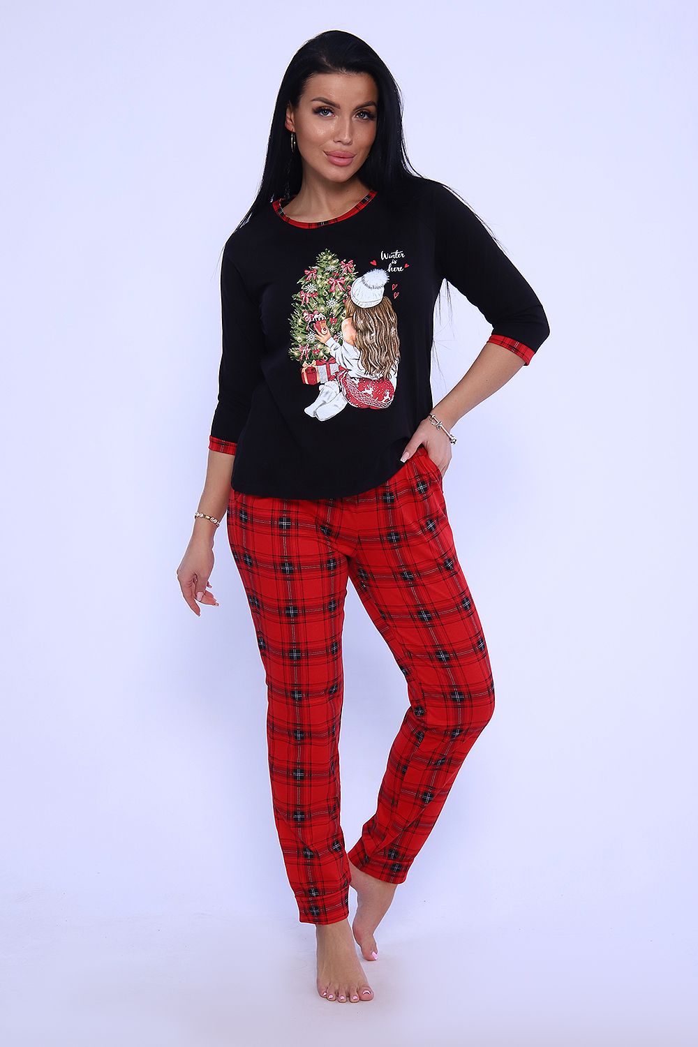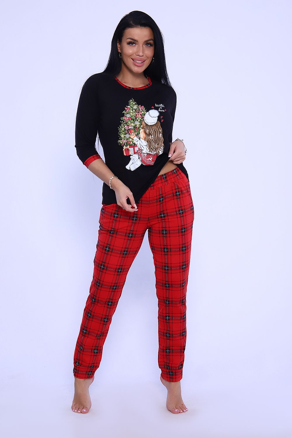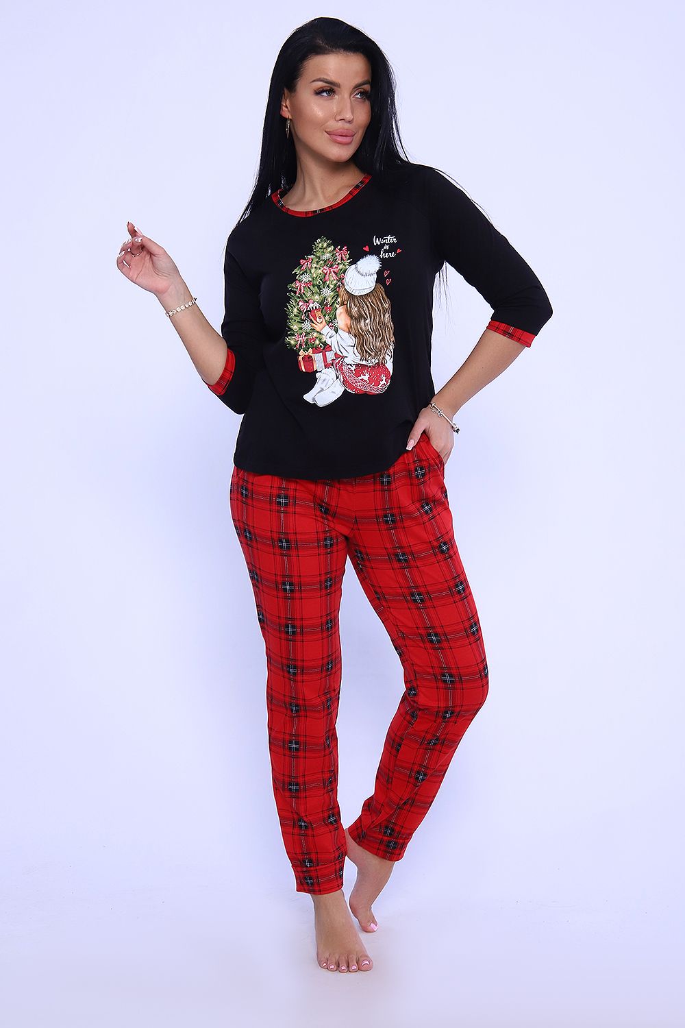 Яркая пижама для каждого дня и веселого праздника, порадует вас. Пижама из мягкой кулирки с принтом подарит вам уют и хорошее настроение. Джемпер с рукавом реглан, манжет и обтачка в тон брюк, брюки с притачным поясом и карманами, манжет внизу.