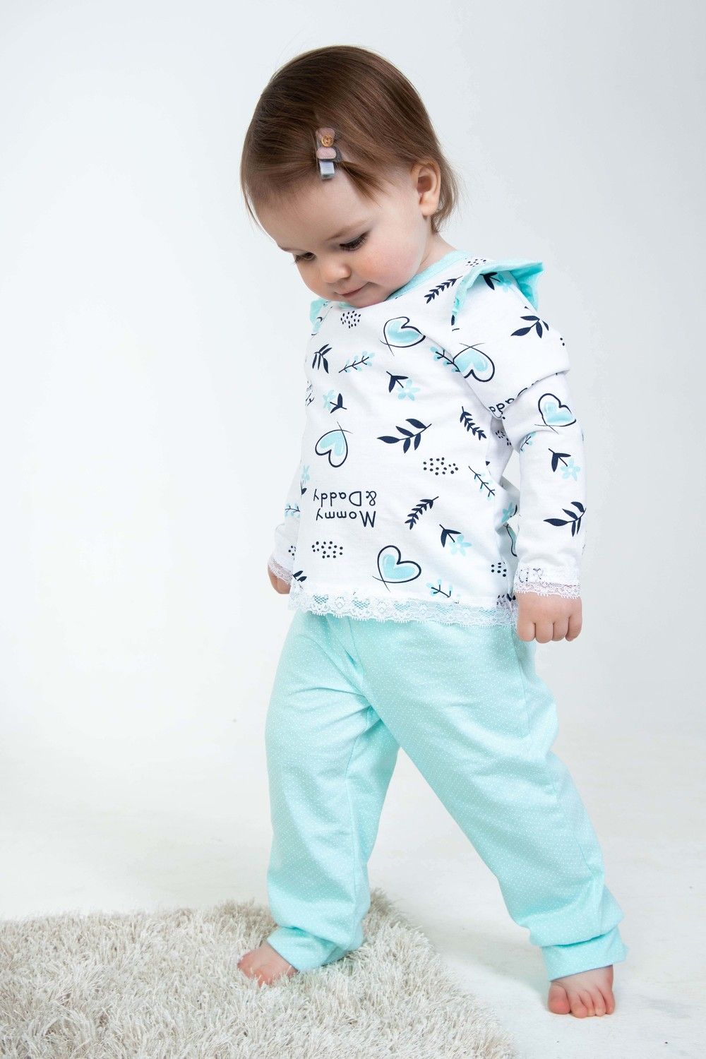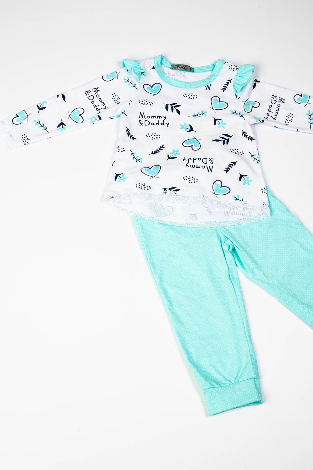 Детская пижамка для девочек, идеальный комплект для сна. Данная модель обеспечит Вашей малышке тепло, уют и, что очень важно, здоровый крепкий сон. Кофточка свободного кроя с длинными рукавами, в комплекте с простыми и легкими брючками. Низки рукавов и кофты отделаны мягким кружевом. Штанишки на манжете.