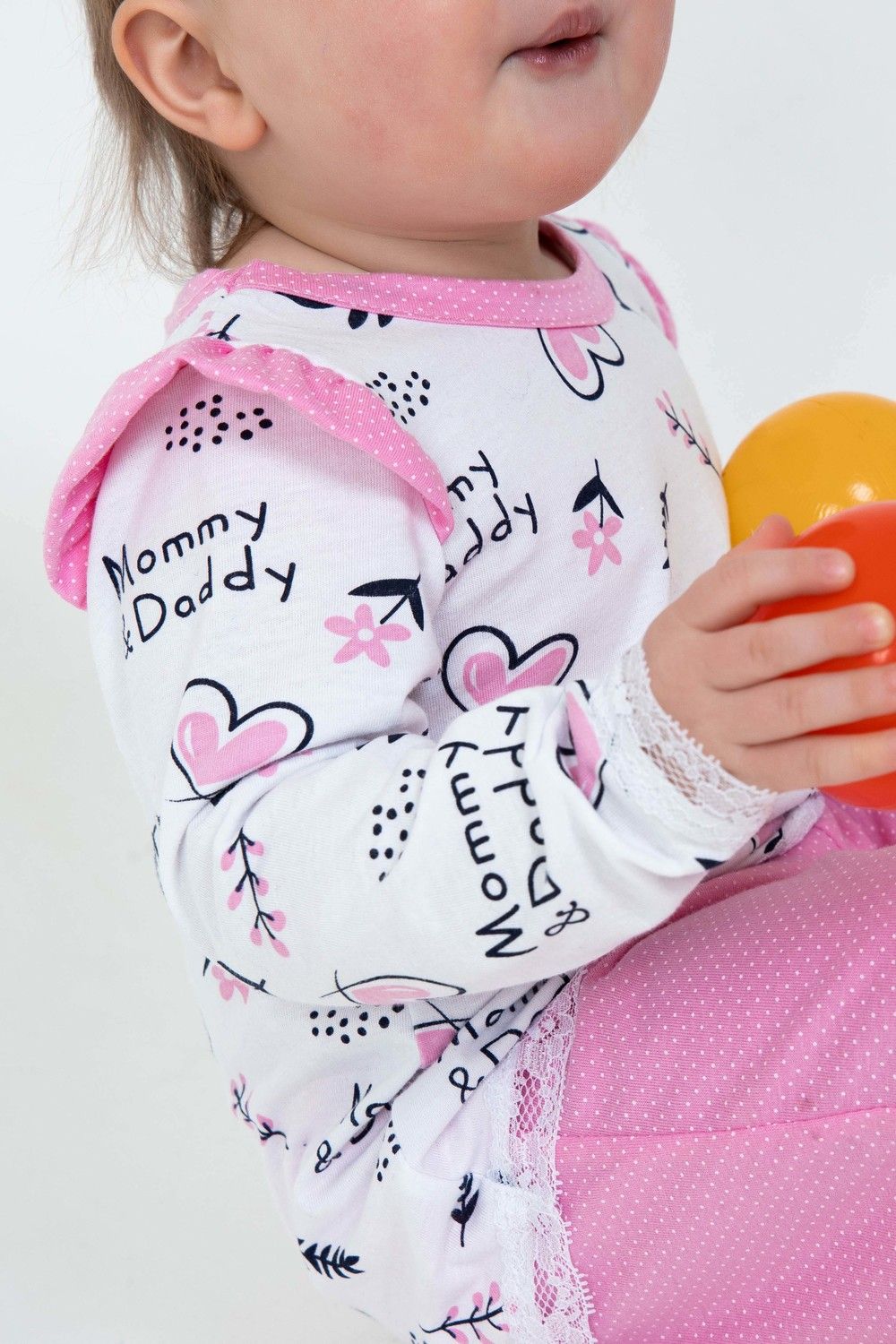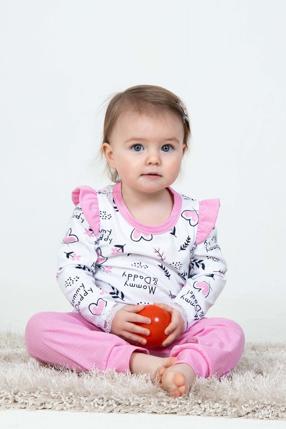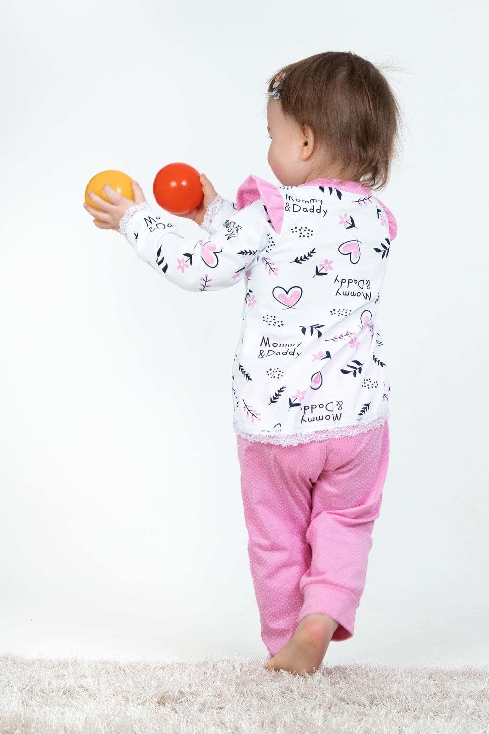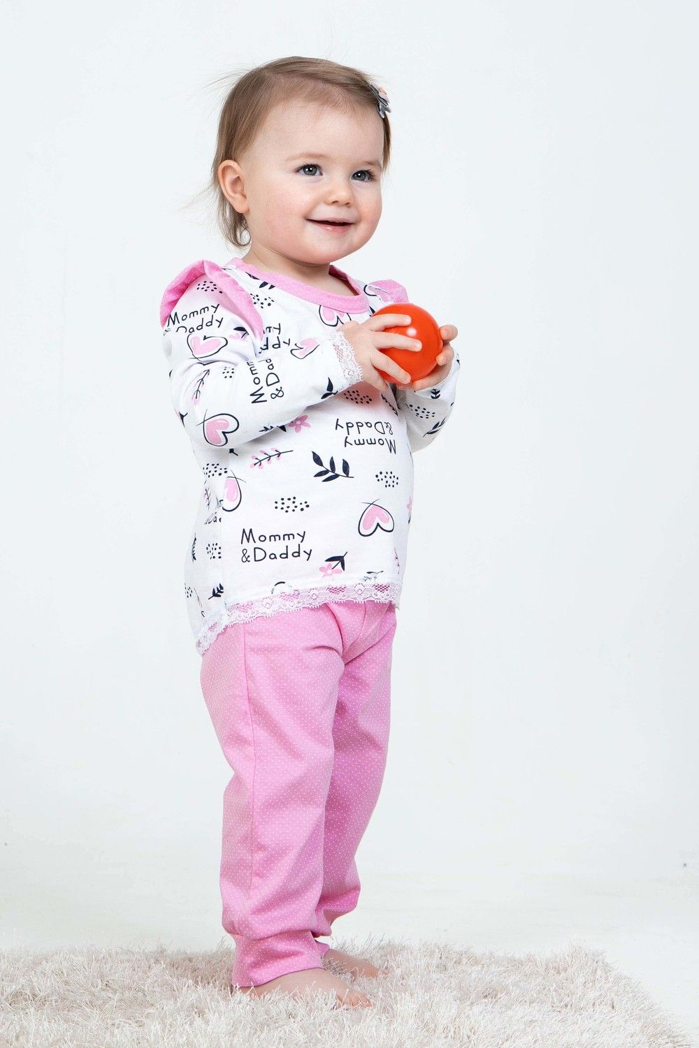 Детская пижамка для девочек, идеальный комплект для сна. Данная модель обеспечит Вашей малышке тепло, уют и, что очень важно, здоровый крепкий сон. Кофточка свободного кроя с длинными рукавами, в комплекте с простыми и легкими брючками. Низки рукавов и кофты отделаны мягким кружевом. Штанишки на манжете.