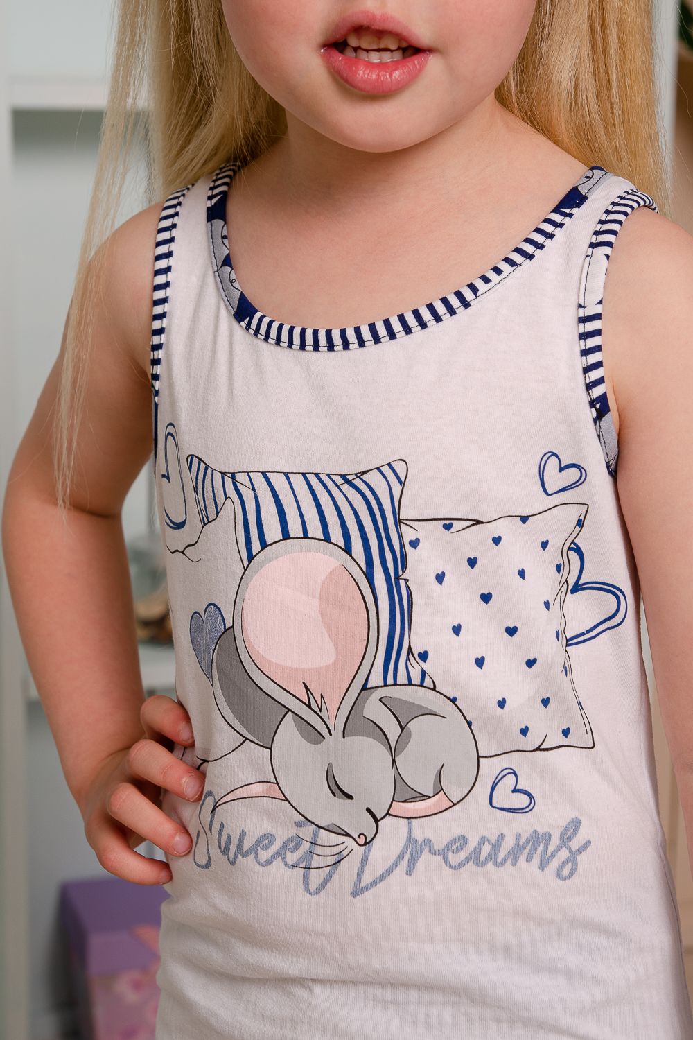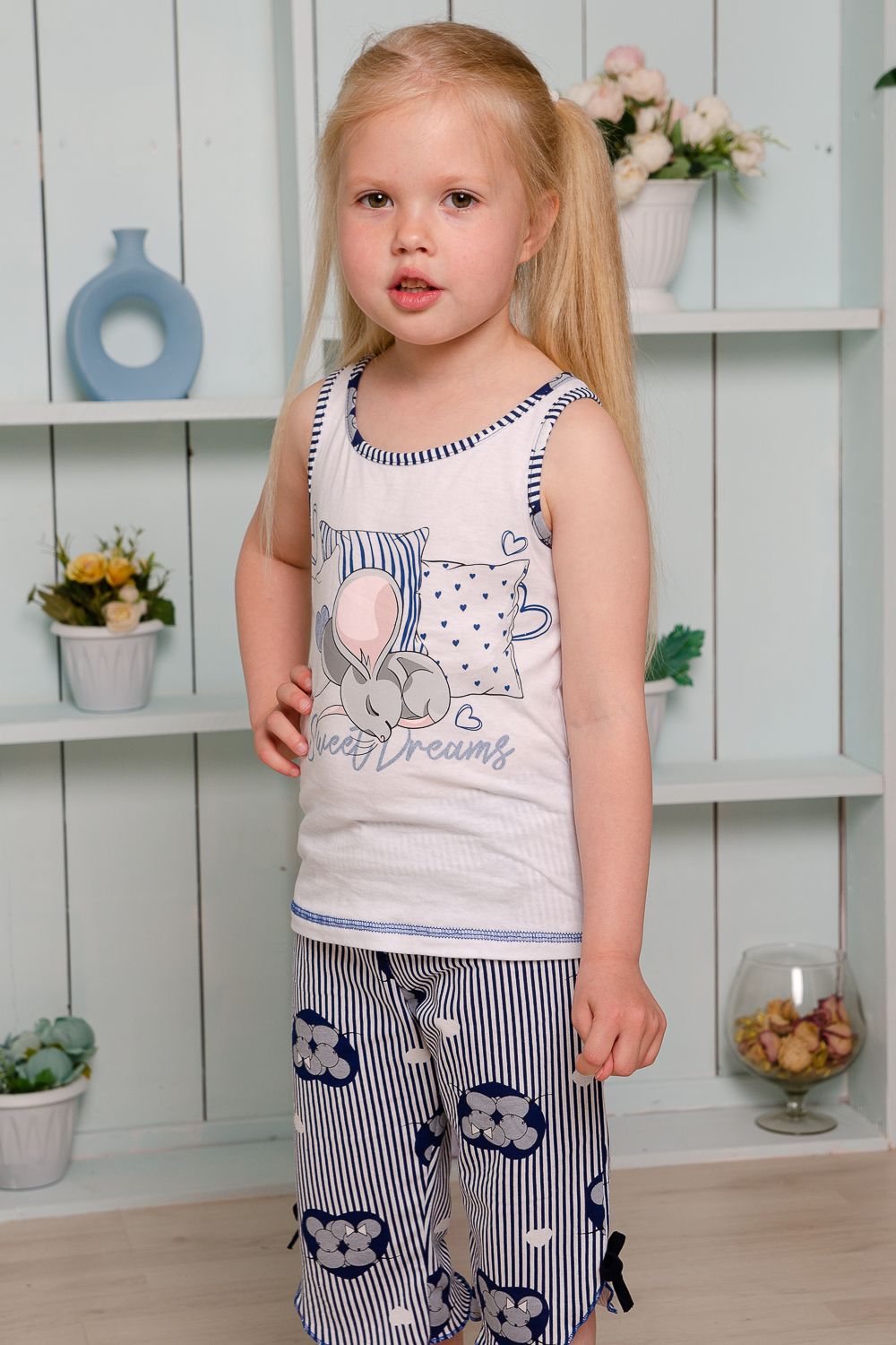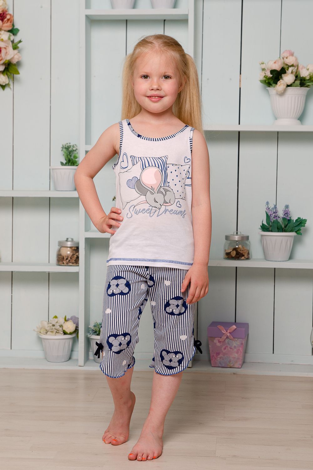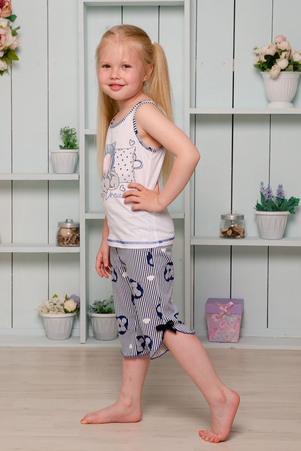 Пижама детская состоит из майки и бриджей. Майка с принтом полуприлегающего силуэта, бриджи свободные, без карманов низ обработан декоративной краеобметочной строчкой.